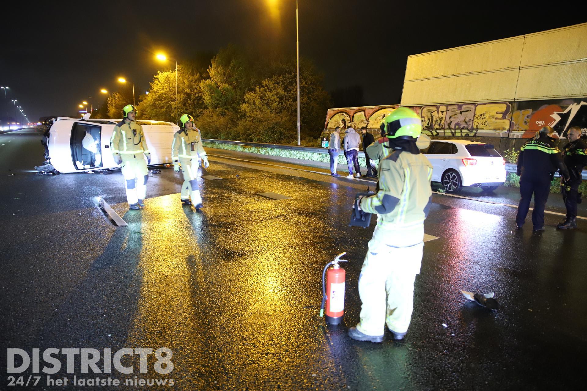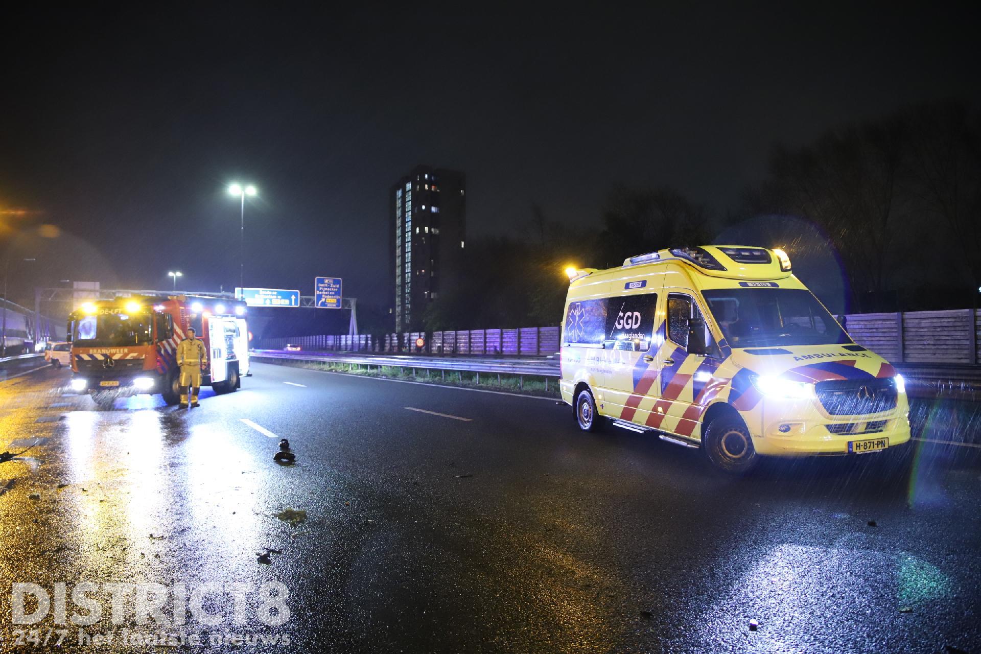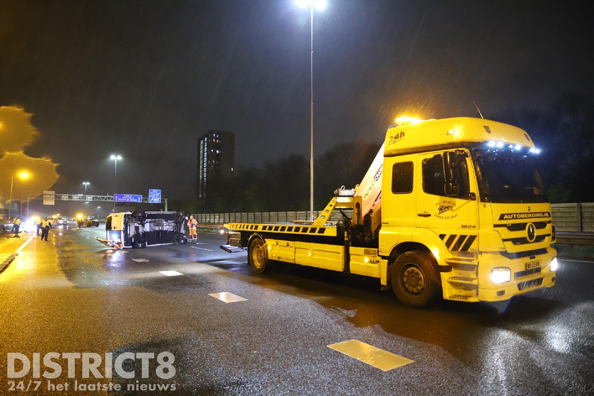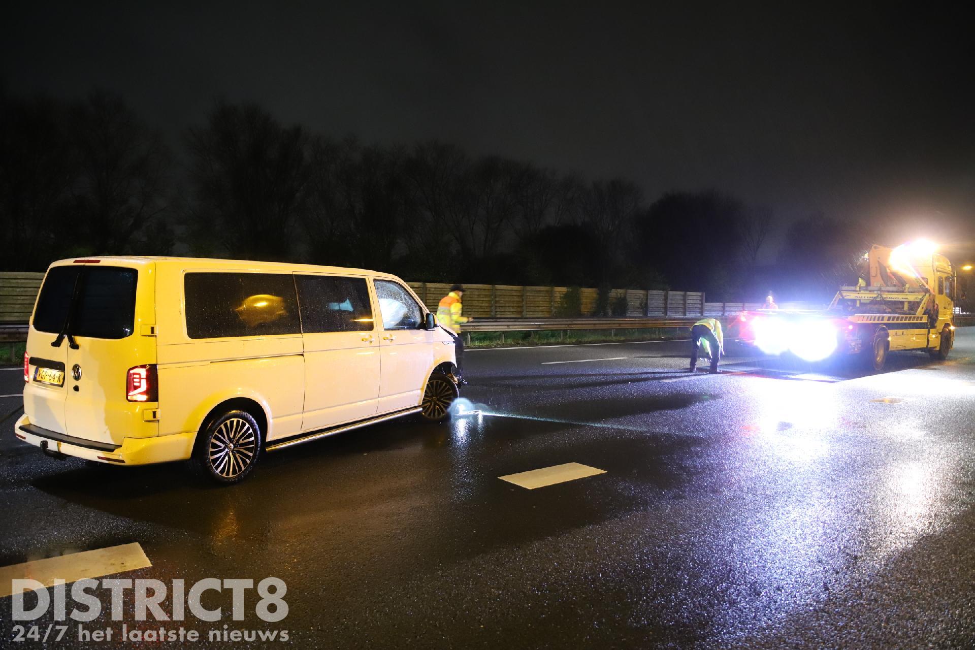 Kort voor middernacht verloor de bestuurder van het busje de macht over het stuur en botste in de geleiderail. Door de klap kwam het busje op zijn zijkant tot stilstand op de snelweg. De ravage is flink en de weg ligt bezaaid met auto-onderdelen.