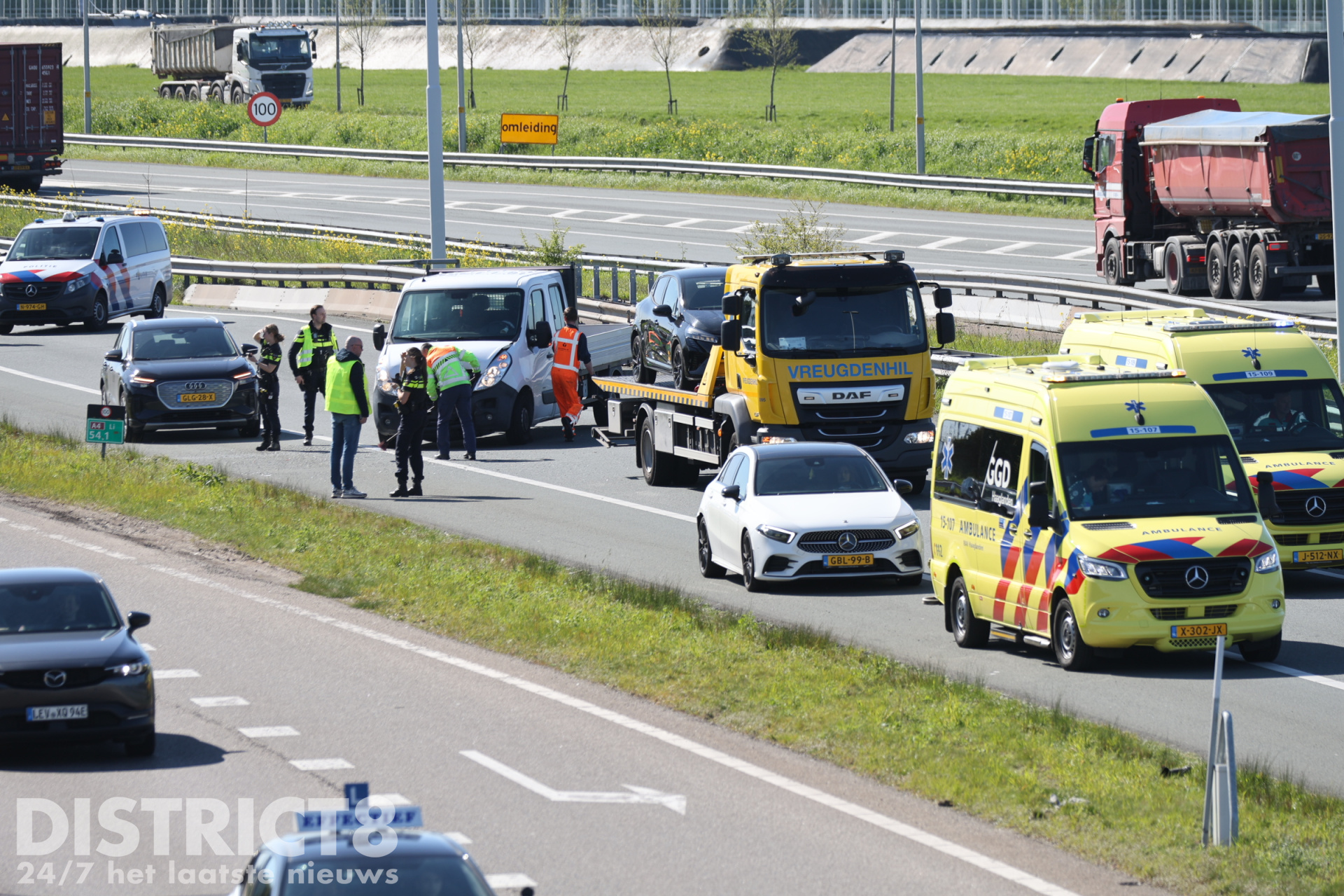 Den Hoorn ā Op de A4 richting Den Haag, ter hoogte van hectometerpaal 54,1 bij Den Hoorn, heeft maandag een ongeval plaatsgevonden tussen twee autos en een bedrijfswagen. Door het incident is de hoofdrijbaan volledig afgesloten voor verkeer.
