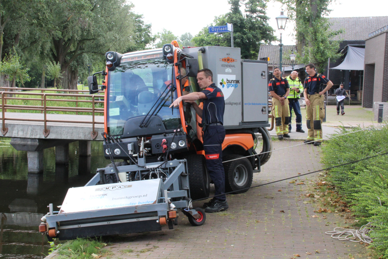 Meteen is 112 gebeld en de Zoetermeerse brandweer is met zwaailicht en sirene ter plaatse gekomen met twee twee wagens. De brandweer heeft met behulp van touwen de wagen vastgemaakt aan een boom, zodat hij niet in het water zou vallen. Met behulp van een lier op een van de brandweerwagens is de maaimachine bij het water weggetrokken. Na ruim een half uur kon de inzittende uit het voertuig komen.