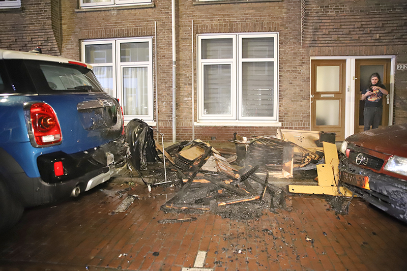 Stapel grofvuil in brand; twee auto’s beschadigd Simonsstraat Delft