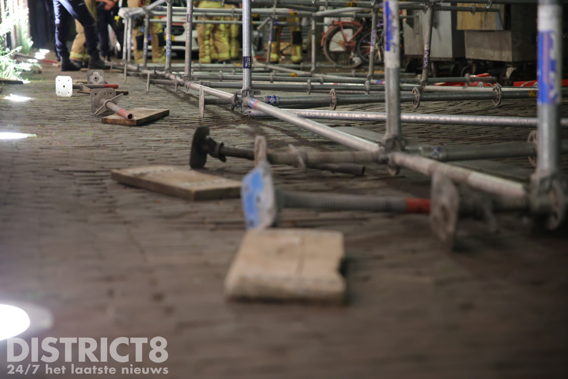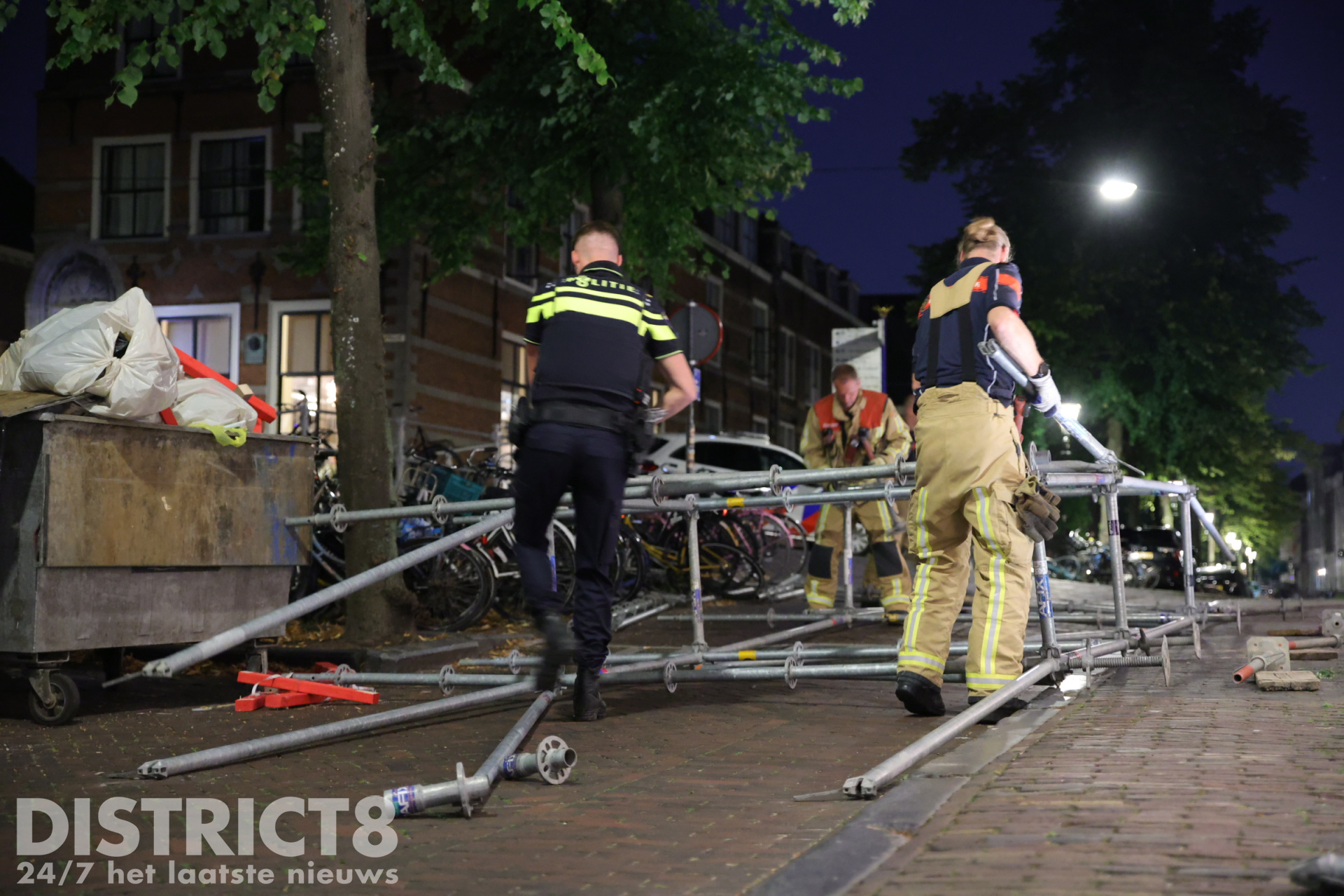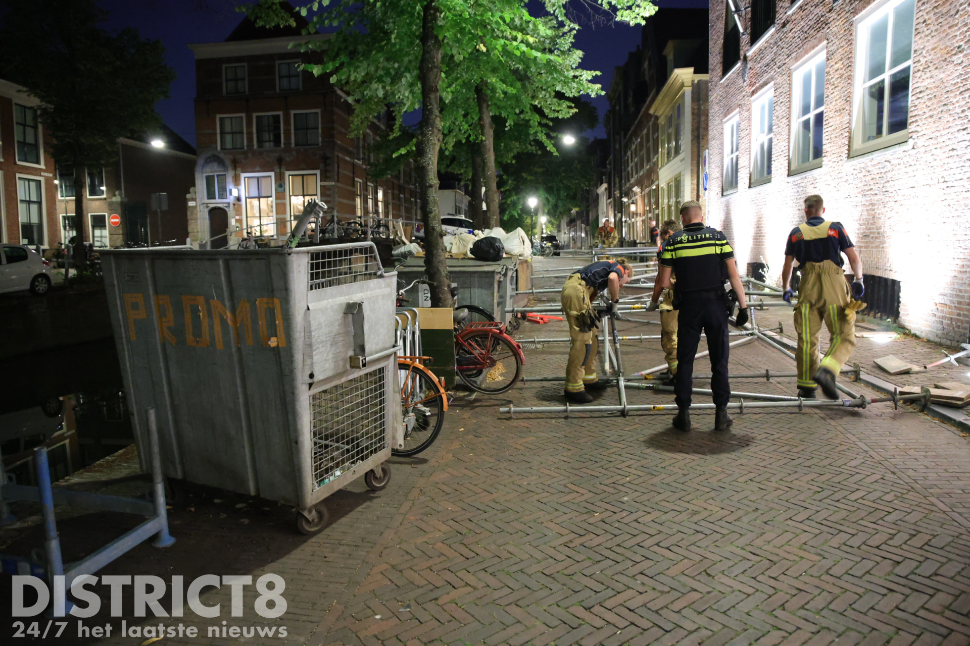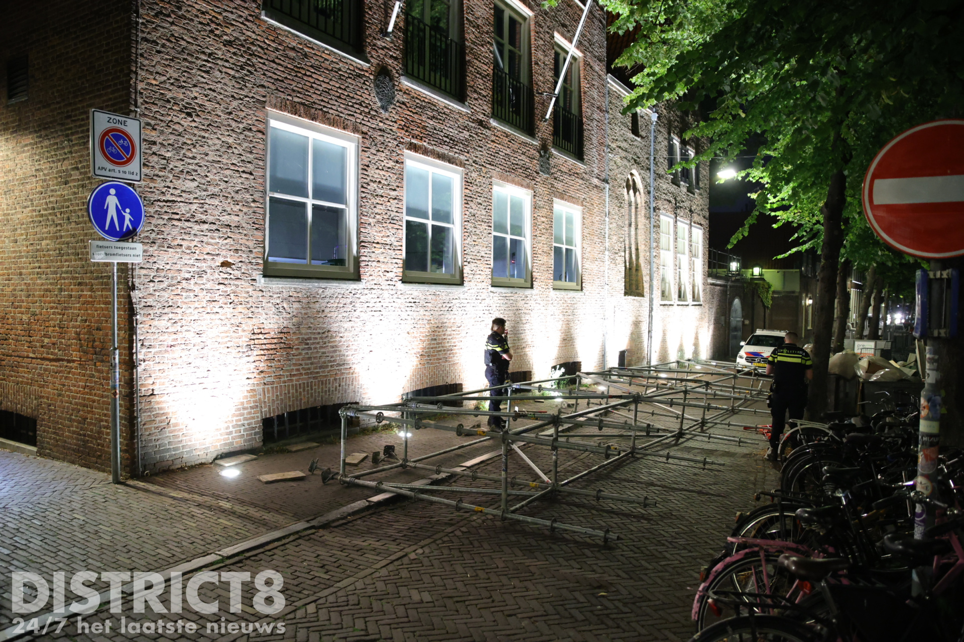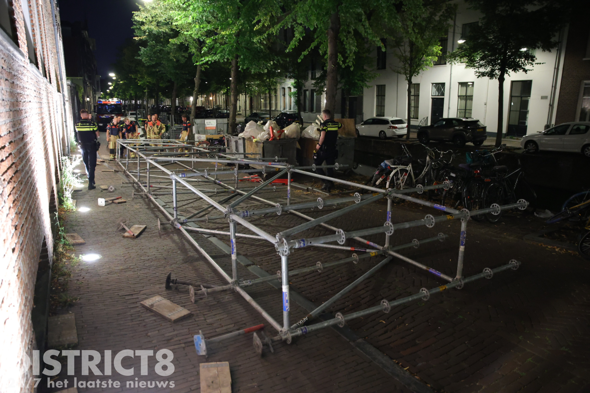 Delft – In de nacht van dinsdag op woensdag 12 augustus is rond 02:15 uur een steiger omgevallen op de Oude Delft in Delft. Het gevaarte stond tegen de gevel van studentenvereniging Sanctus Virgilius en belandde dwars over de weg, waardoor de doorgang volledig werd geblokkeerd.