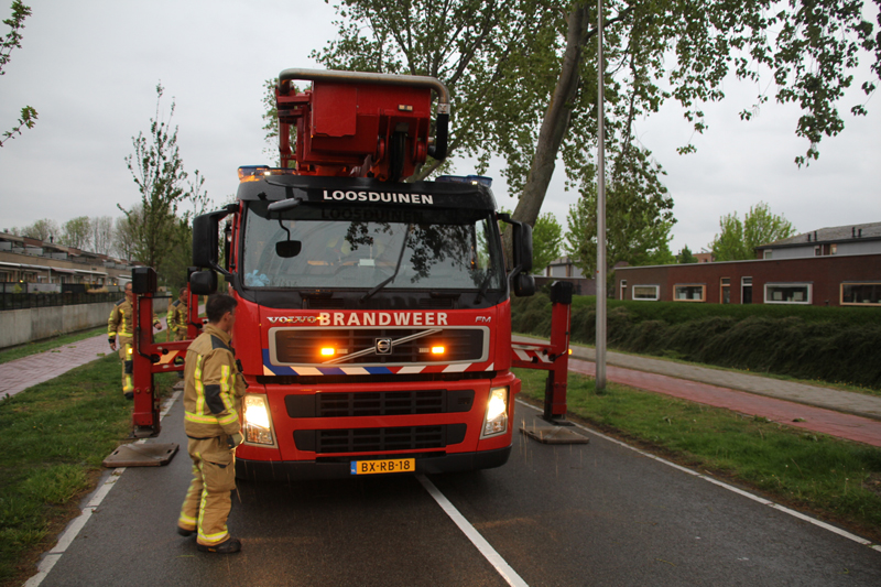 Door de stevige wind die er woensdagavond is, brak een grote tak deels af, en bleef hangen boven het fietspad. De brandweer van Monster heeft een hoogwerker van de Haagse brandweer laten komen om de tak weg te halen.