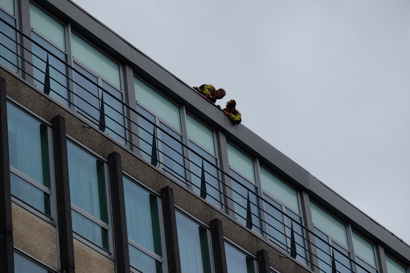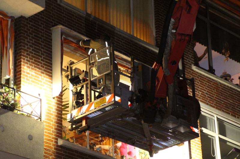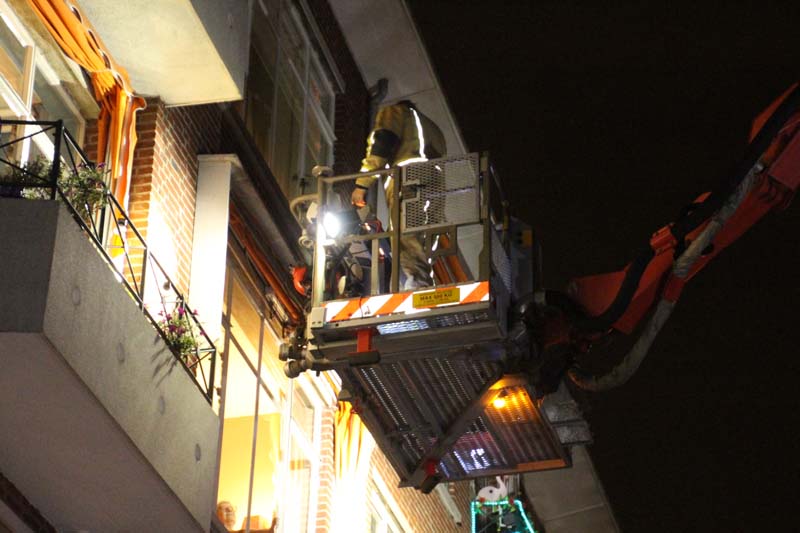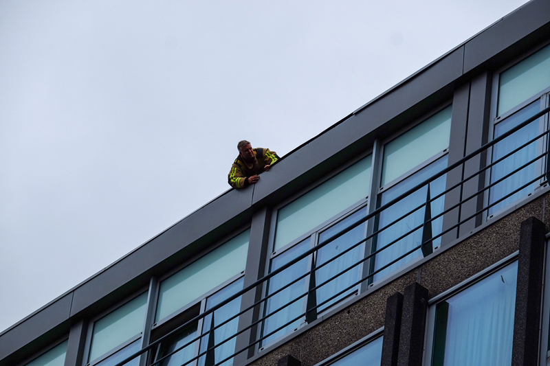De brandweer controleert de rest van de gevel van het gebouw om te voorkomen dat overige geveldelen later vanavond alsnog los komen en ook op straat terecht komen.