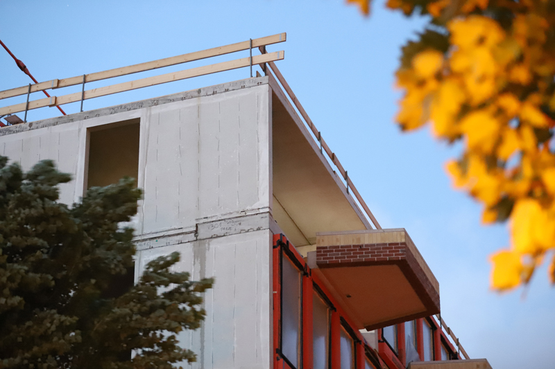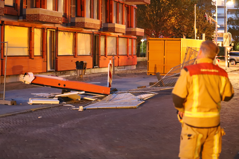 Den Haag – Aan de Zamenhofstraat in Den Haag is dinsdagavond een gedeelte van een gevel los gekomen en op straat terecht gekomen door de harde wind. Het geveldeel kwam los van de bovenste etage van een pand in aanbouw.