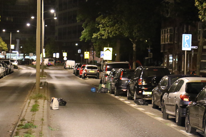 Verspreid over de hele straat lagen meerdere vuilniszakken, omdat bewoners hun afval hadden buiten gezet.