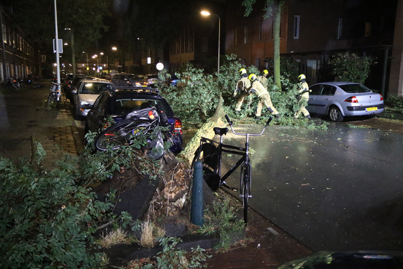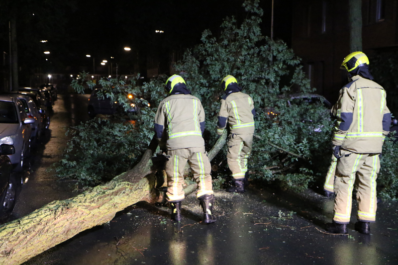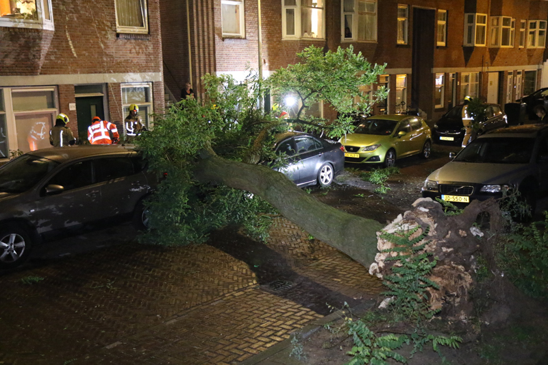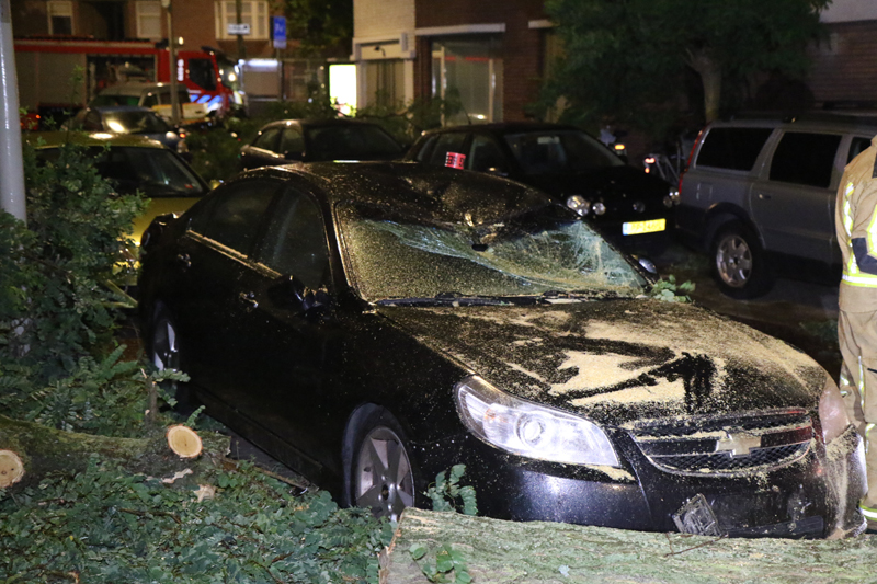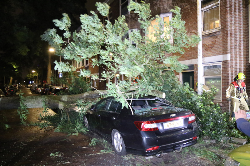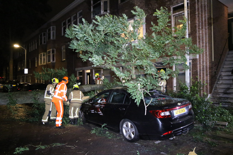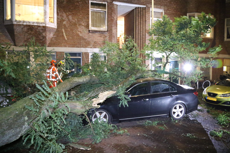 Den Haag – Op de Deimanstraat in Den Haag is een boom op een geparkeerde auto gevallen. De auto en een woning liepen hierbij flinke schade op.