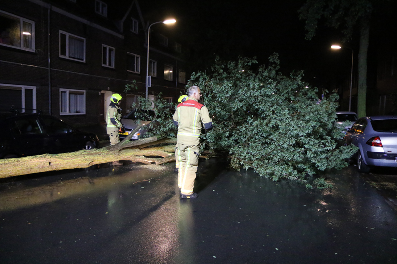 De brandweer kwam ter plaatse om de boom van de weg te verwijderen. Een geparkeerde auto bleef net aan ongedeerd.