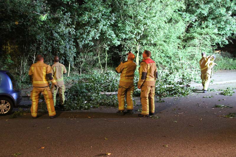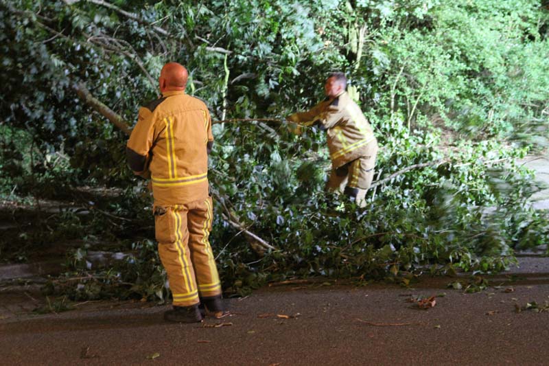 De brandweer kwam ter plaatse om de boom in kleine stukken te zagen.