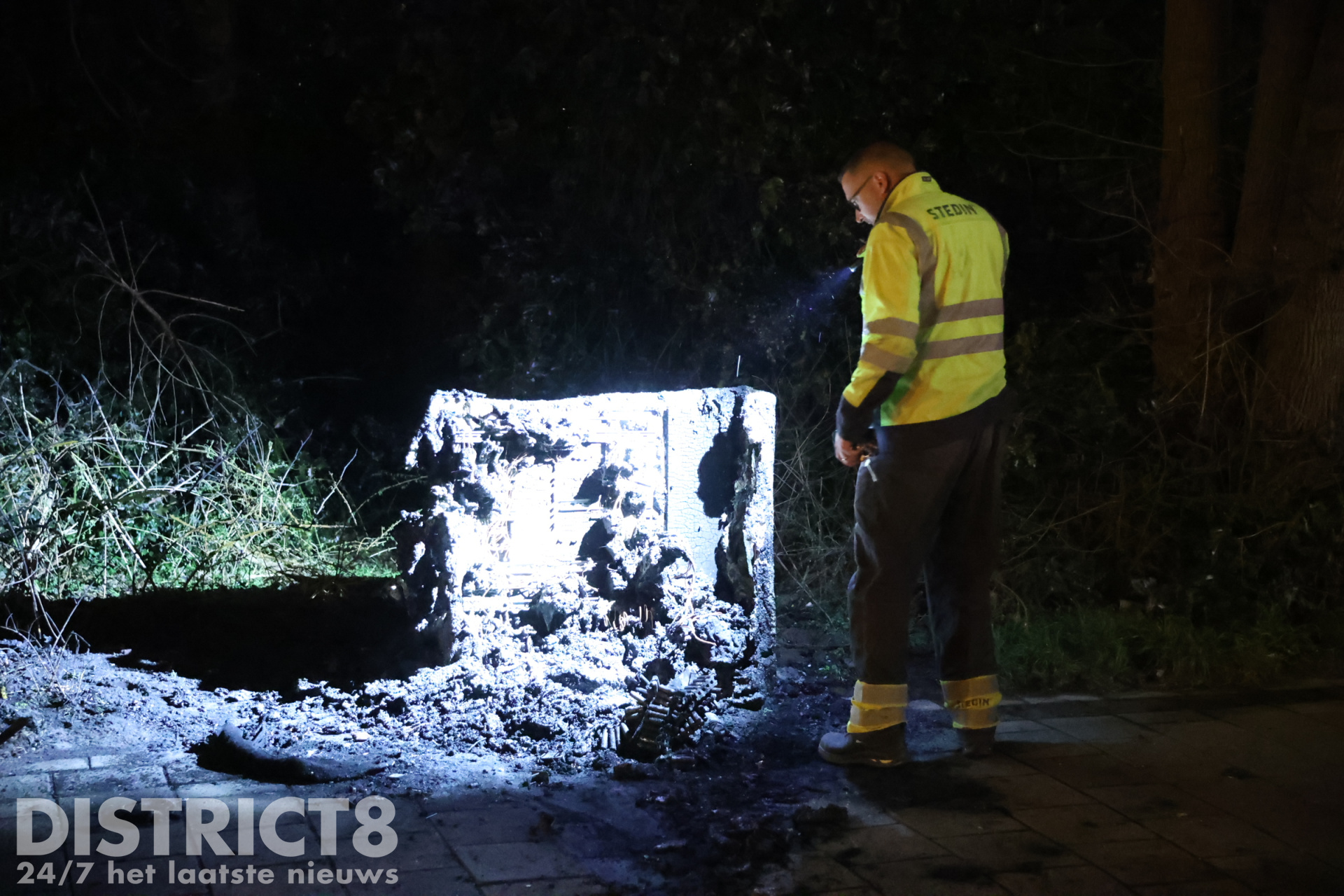 Toen de brand onder controle was, werd contact opgenomen met Stedin. Zij hebben ter plaatse de kast, of wat daar nog van over was, veiliggesteld en daarna de stroom naar deze kast afgesloten. Ook hebben zij graafwerkzaamheden uitgevoerd om de verlichting weer werkend te krijgen.