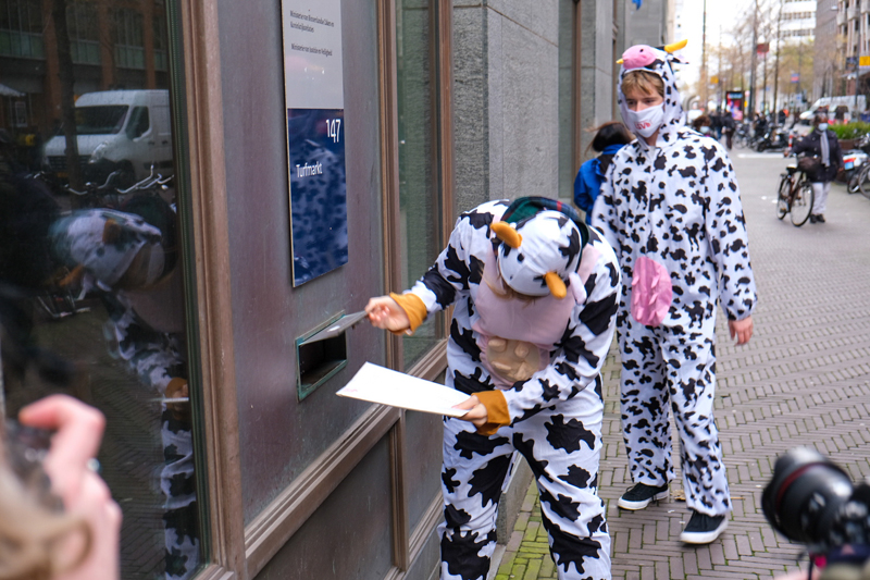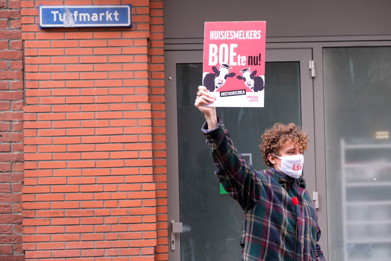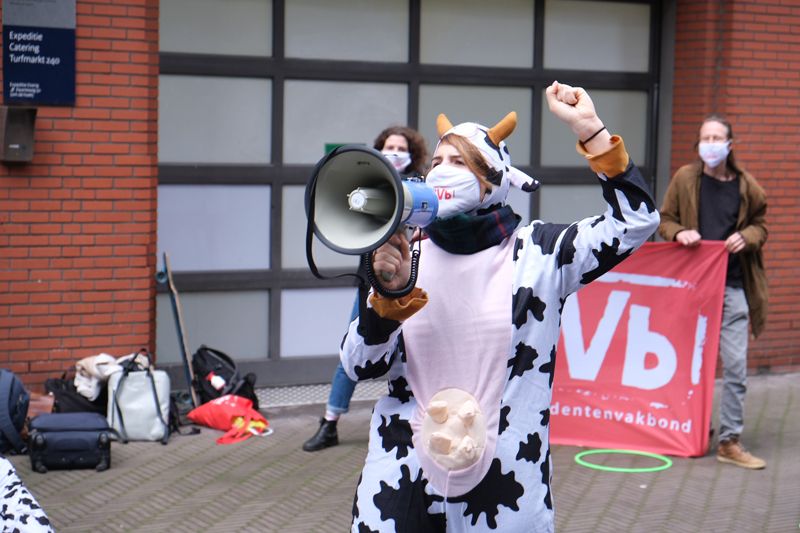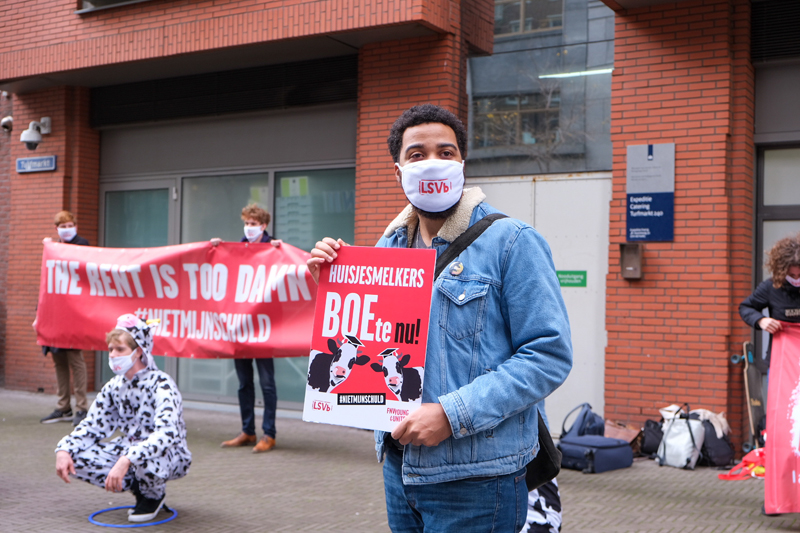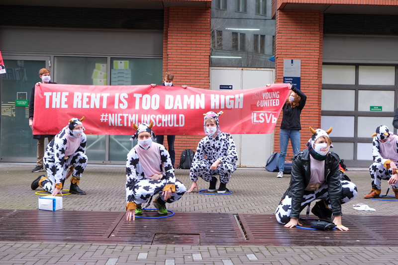 De studenten voeren actie om het belang van een huisjesmelkersboete kenbaar te maken. De studenten gehuld in koeienkostuum, geven aan uitgemolken te zijn, omdat zij stelselmatig te veel huur betalen. Door invoering van een huisjesmelkersboete hopen studenten dit een halt toe te roepen.
