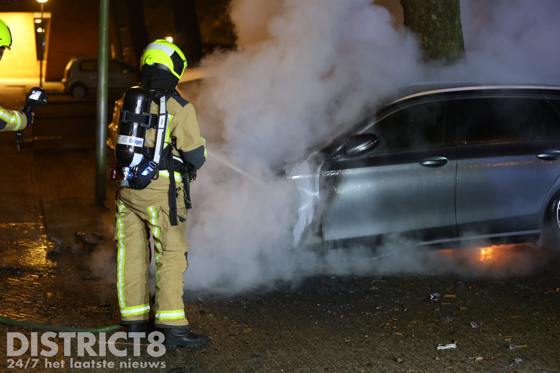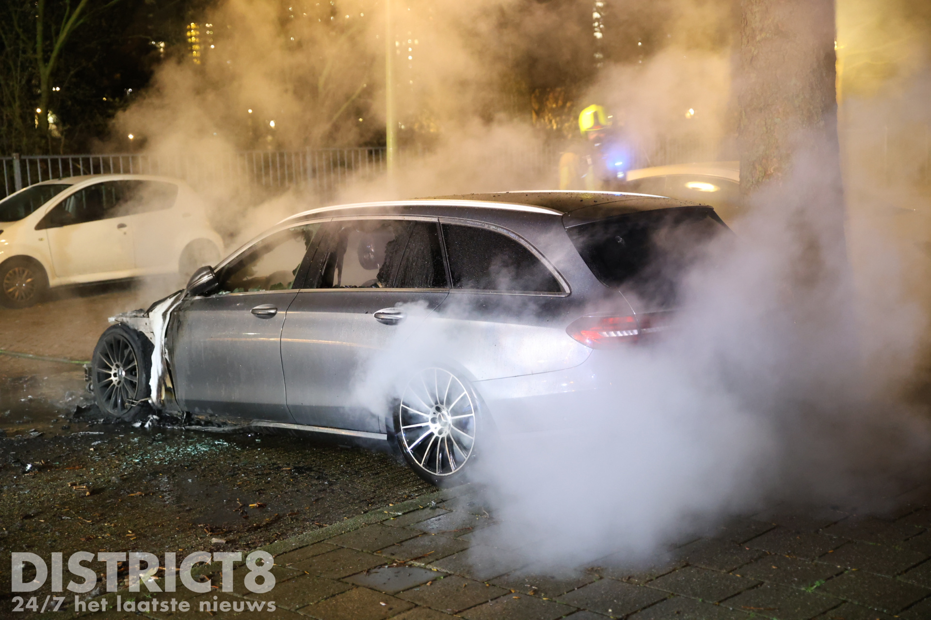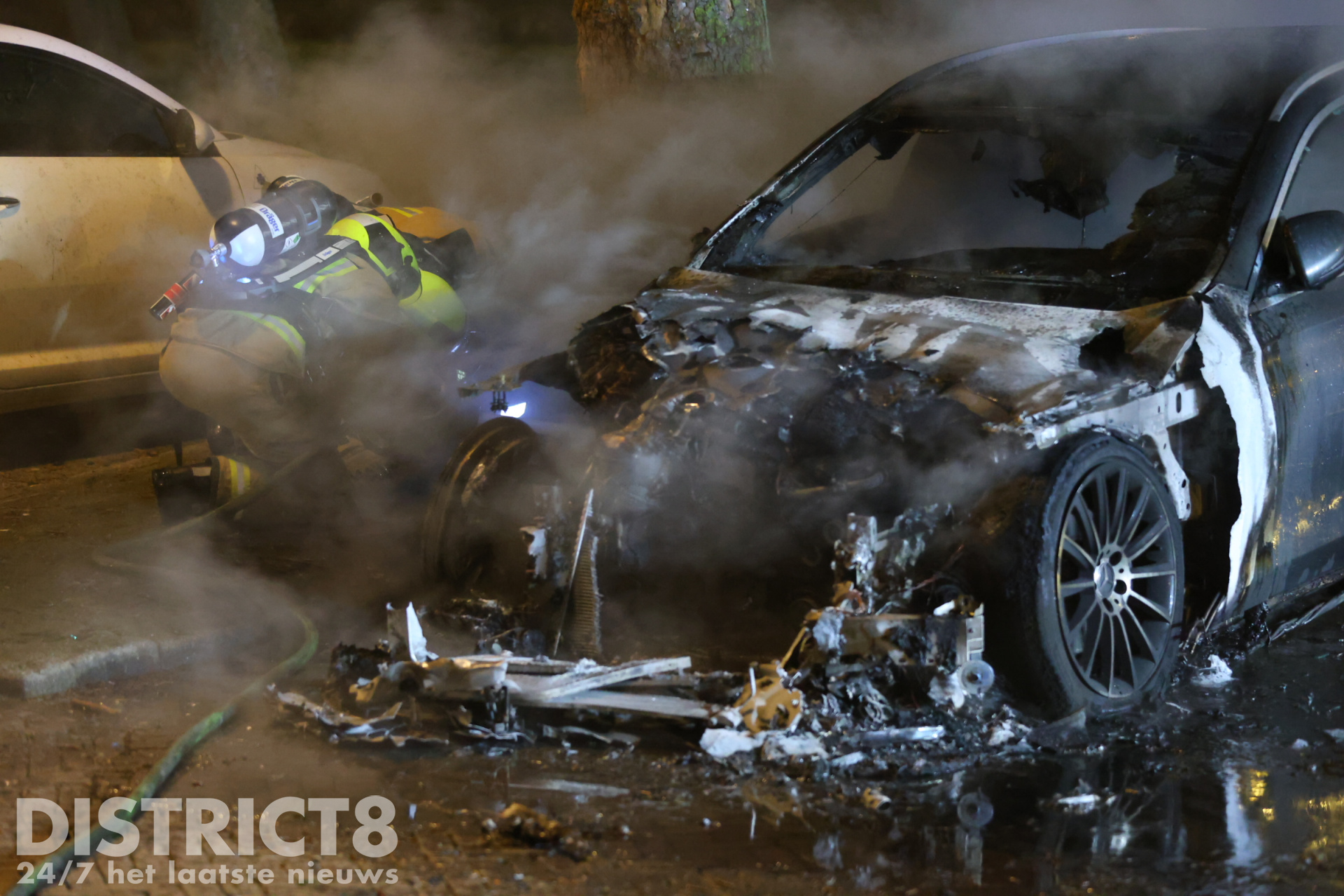 De brandweer kwam met spoed ter plaatse en wist het vuur te blussen, maar de taxi kan als verloren worden beschouwd. Rondom het voertuig lagen brandende brokstukken verspreid over de straat. Het lijkt erop dat er een explosie heeft plaatsgevonden, wat kan wijzen op brandstichting.