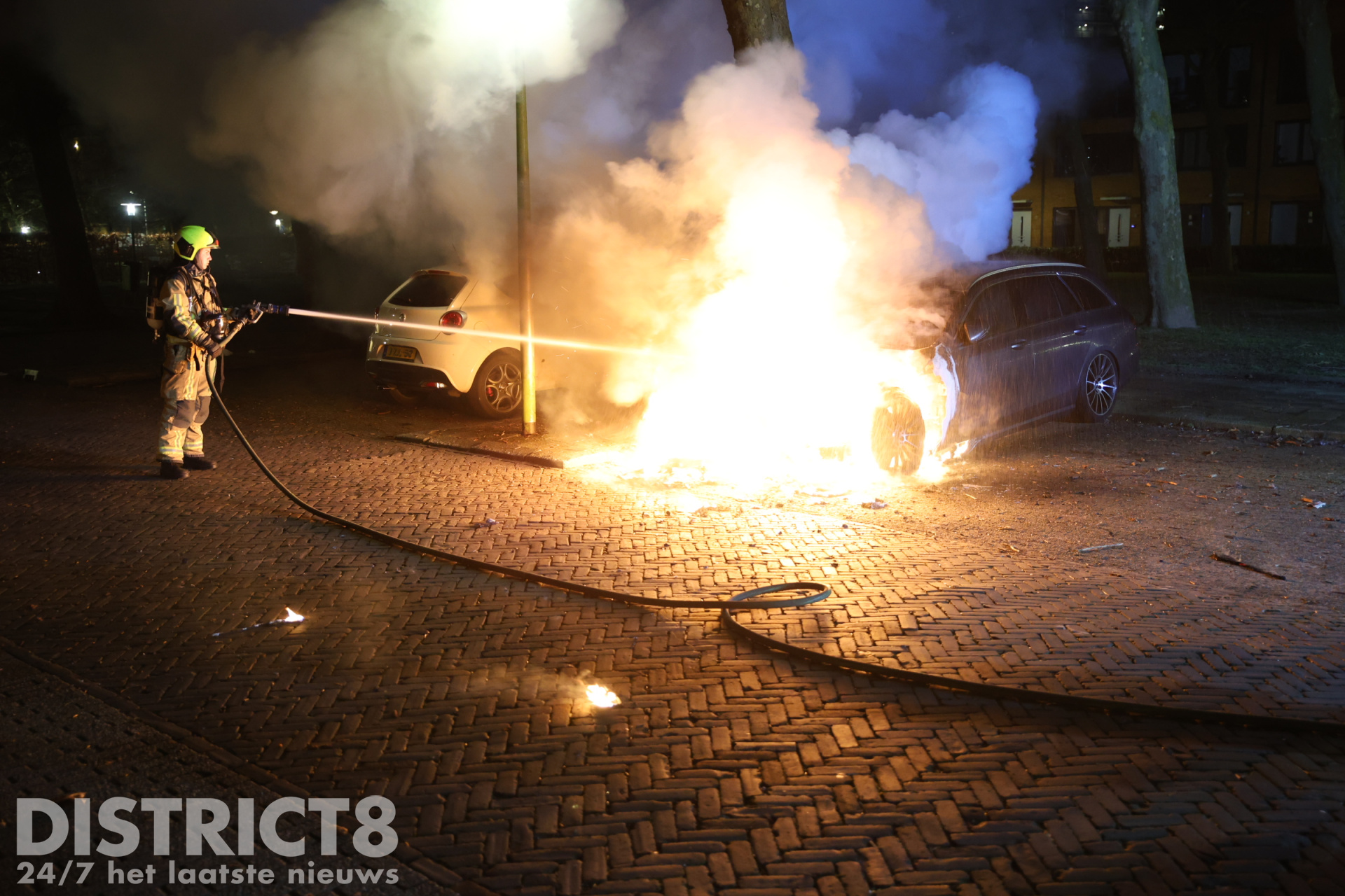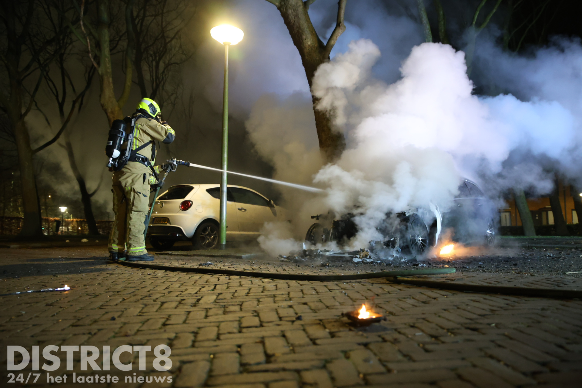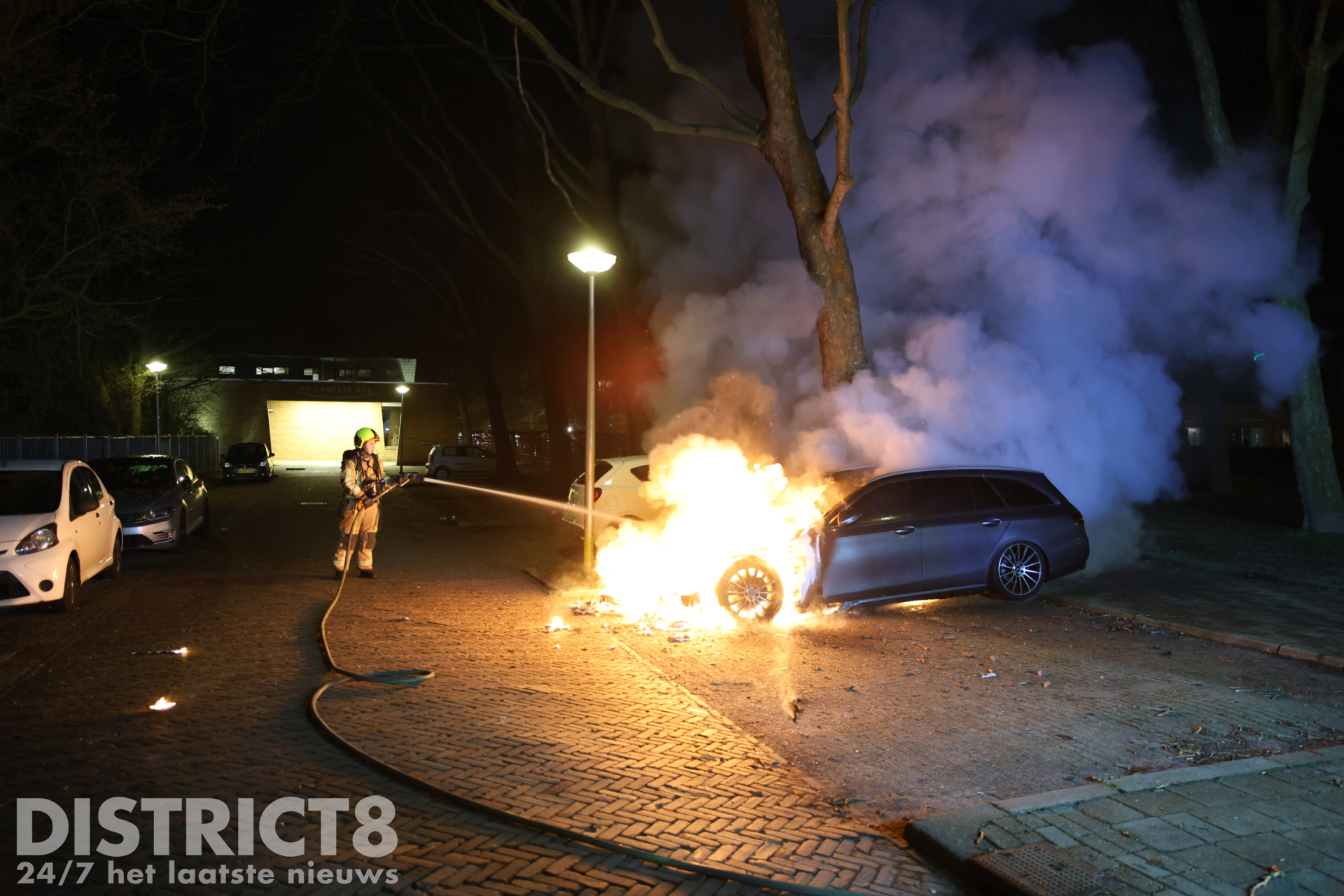 De brandweer kwam met spoed ter plaatse en wist het vuur te blussen, maar de taxi kan als verloren worden beschouwd. Rondom het voertuig lagen brandende brokstukken verspreid over de straat. Het lijkt erop dat er een explosie heeft plaatsgevonden, wat kan wijzen op brandstichting.