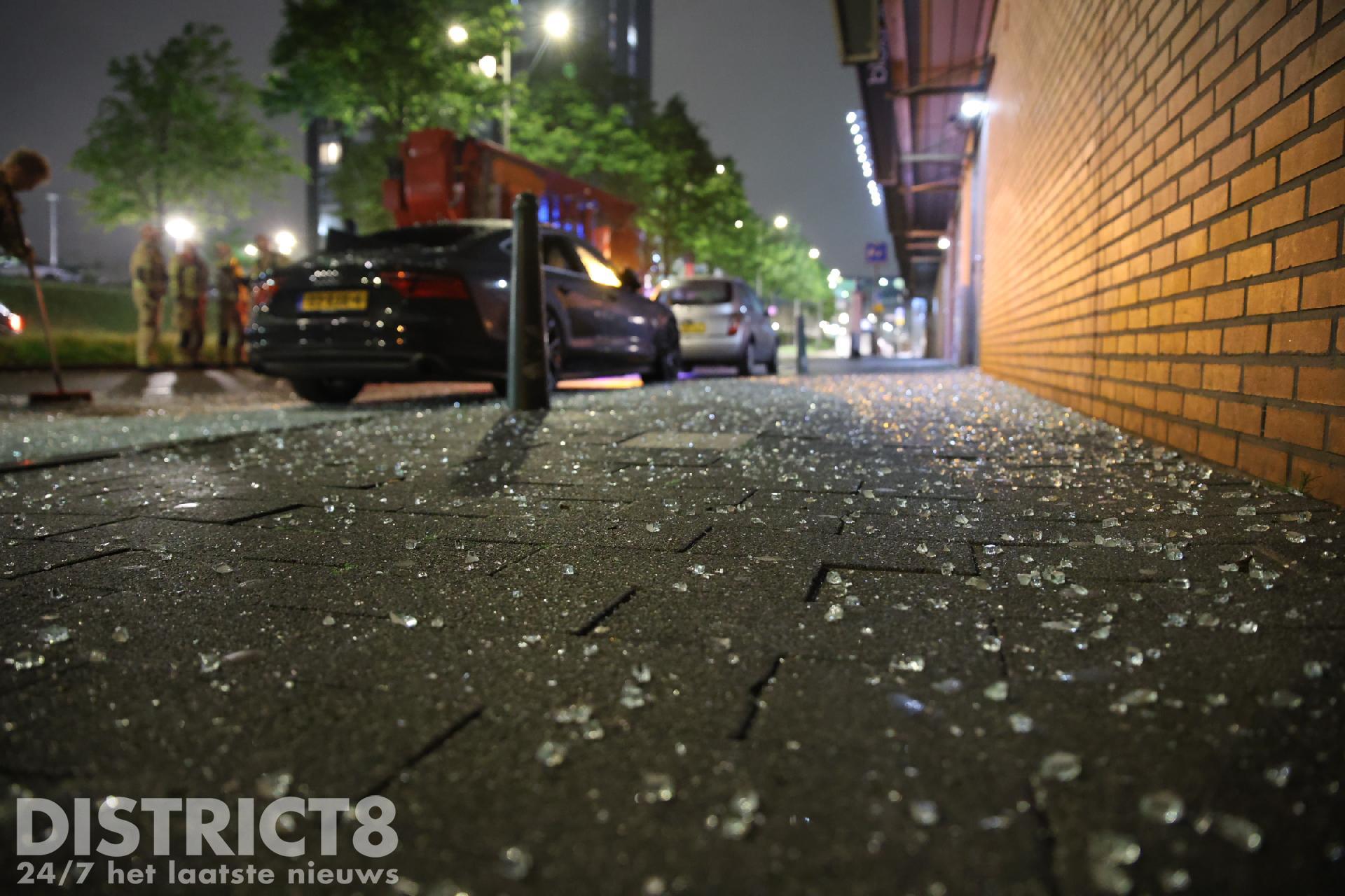 Door de vallende scherven waren van een geparkeerde auto enkele ramen gesprongen. Het wegdek rondom de auto lag bezaaid met tienduizenden kleine glasdeeltjes.