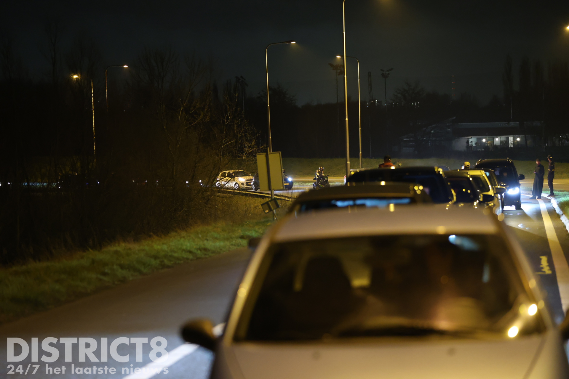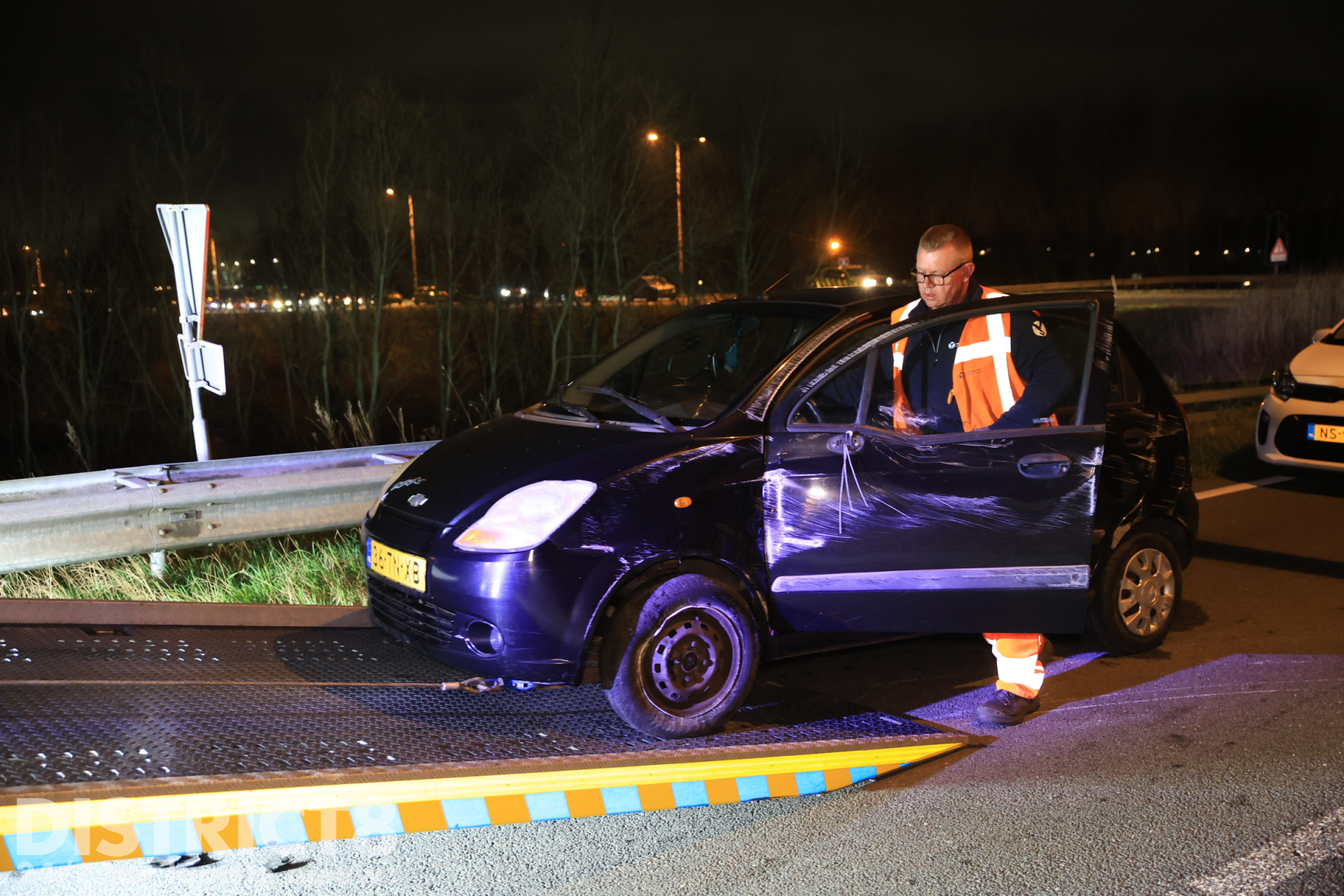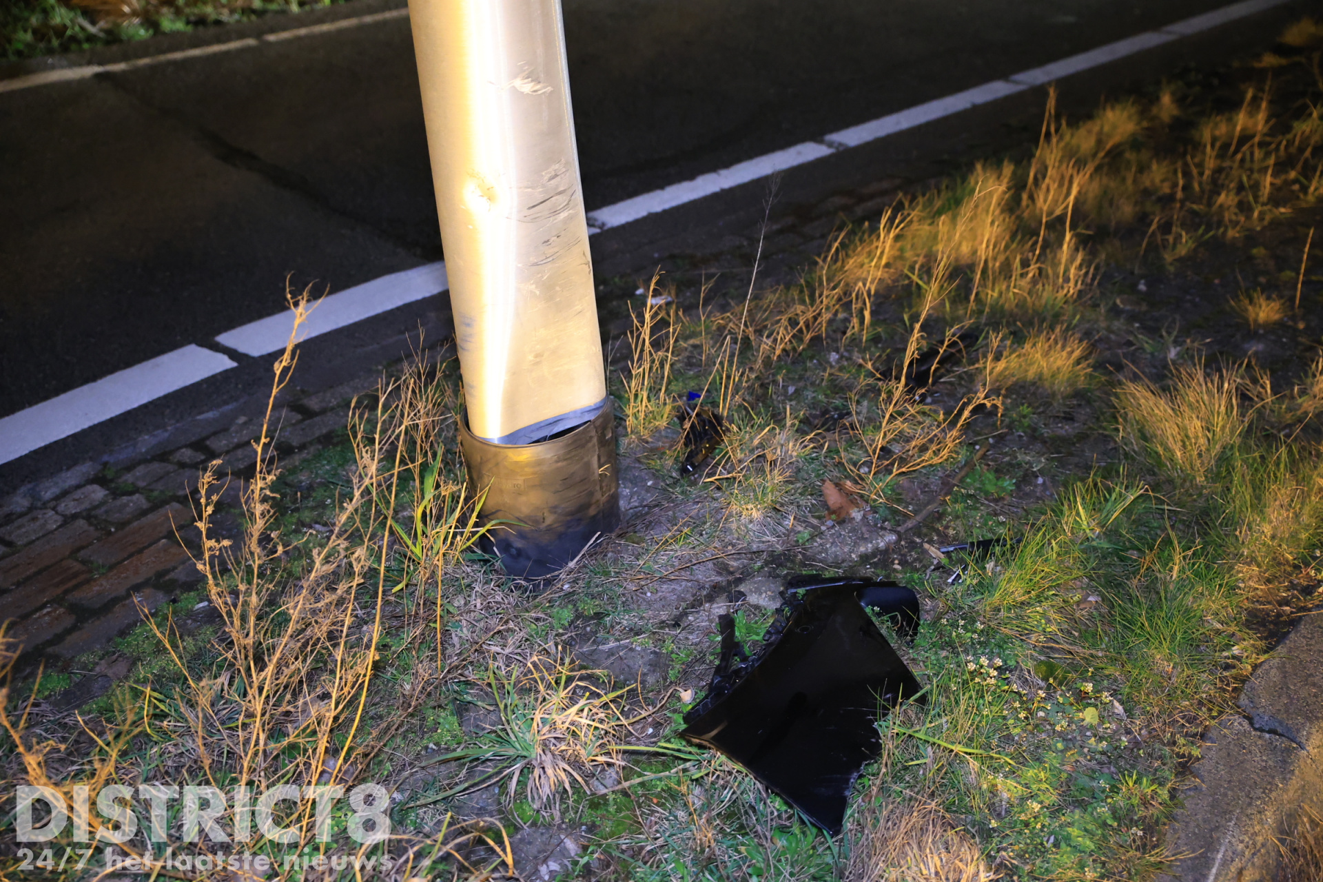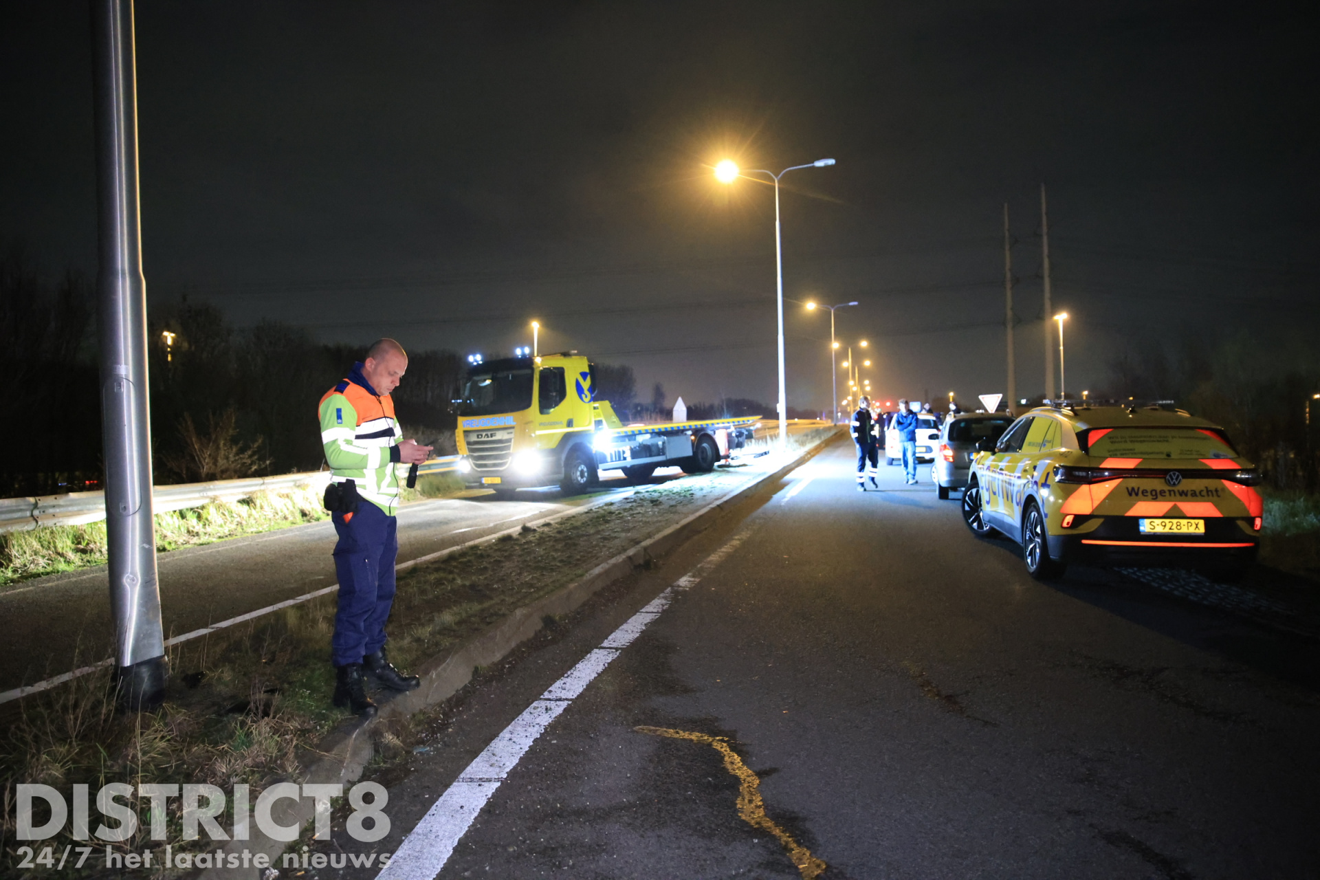 Een berger heeft de auto weer op vier wielen gezet en afgesleept. Rijkswaterstaat heeft een melding gemaakt bij de aannemer voor de defecte lantaarnpaal.