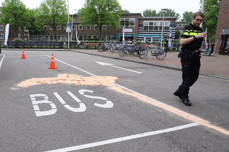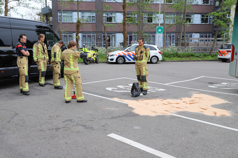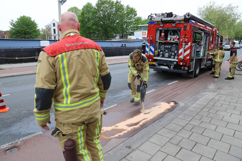 De brandweer heeft zowel op de Oostsingel als de Koepoortplaats twee grote plassen bedekt met korrels om de vloeistof te laten absorberen.