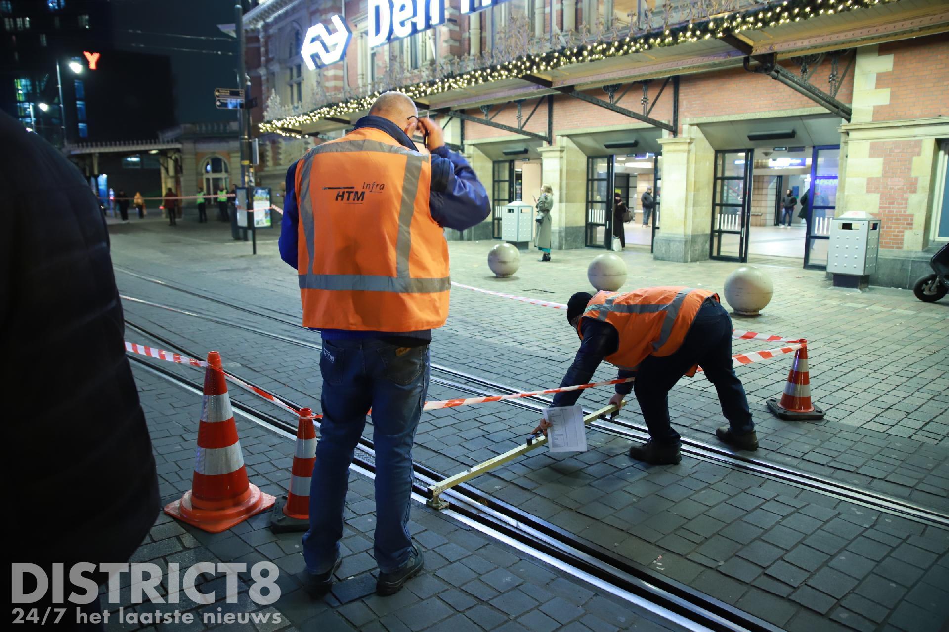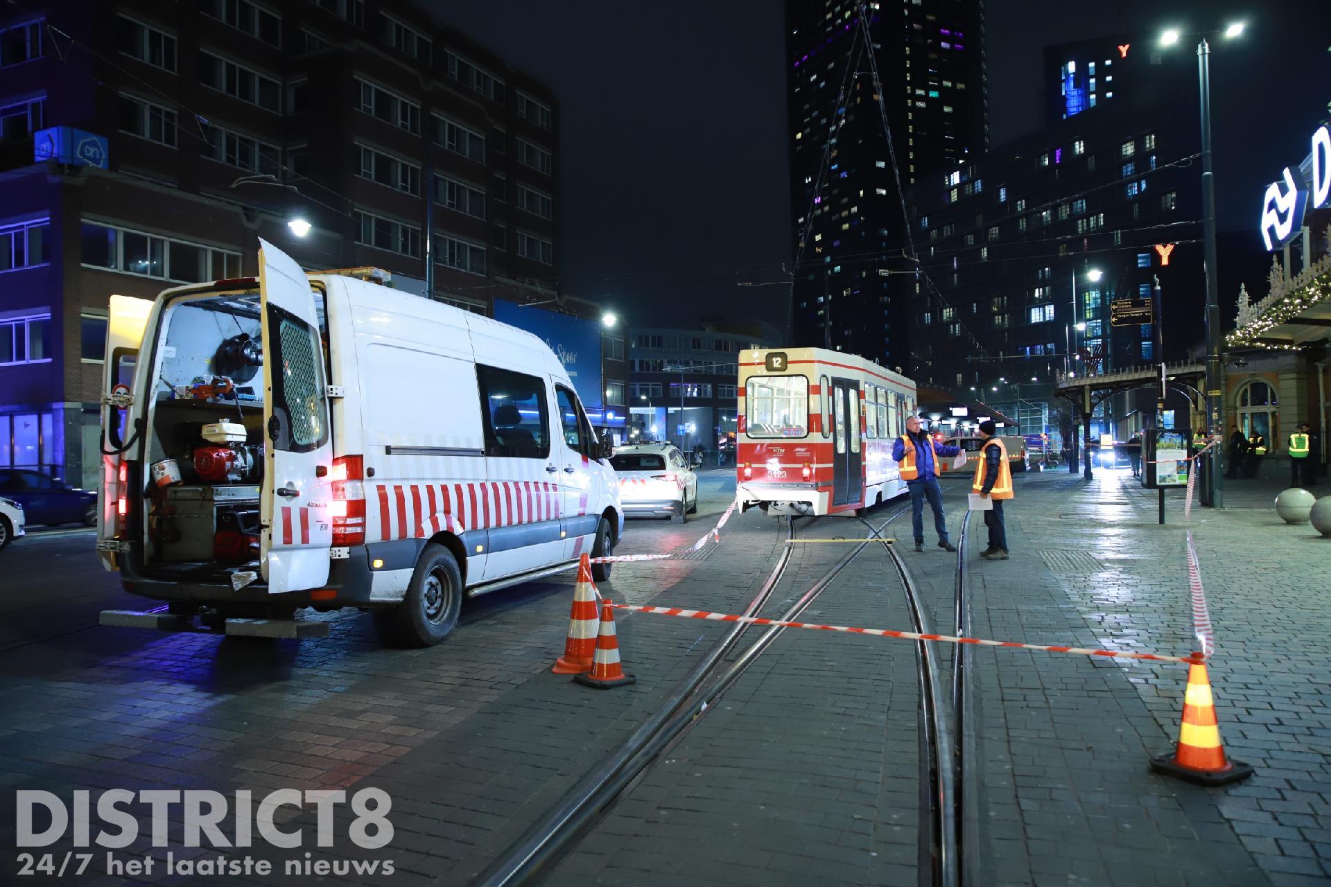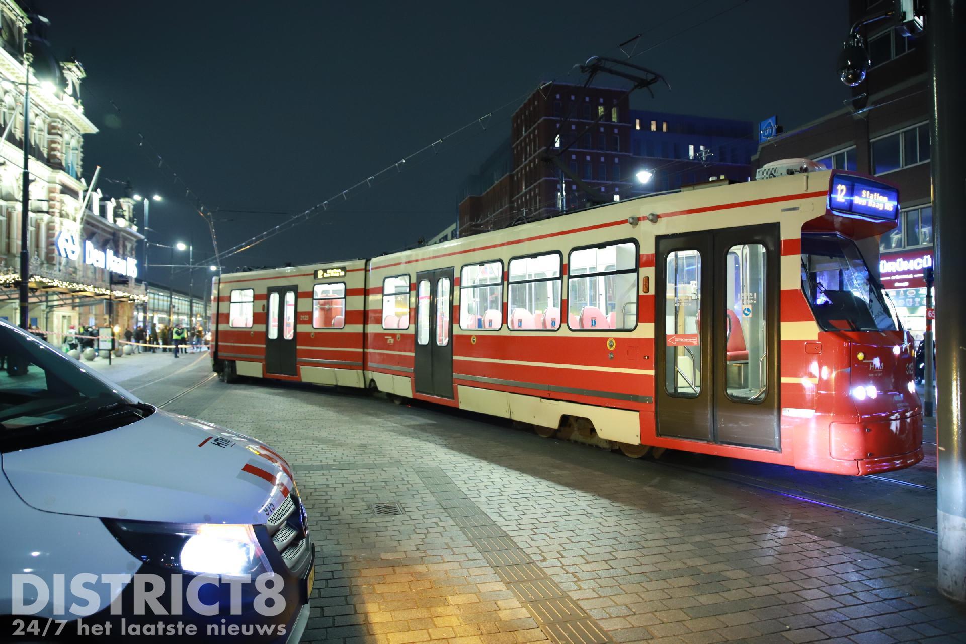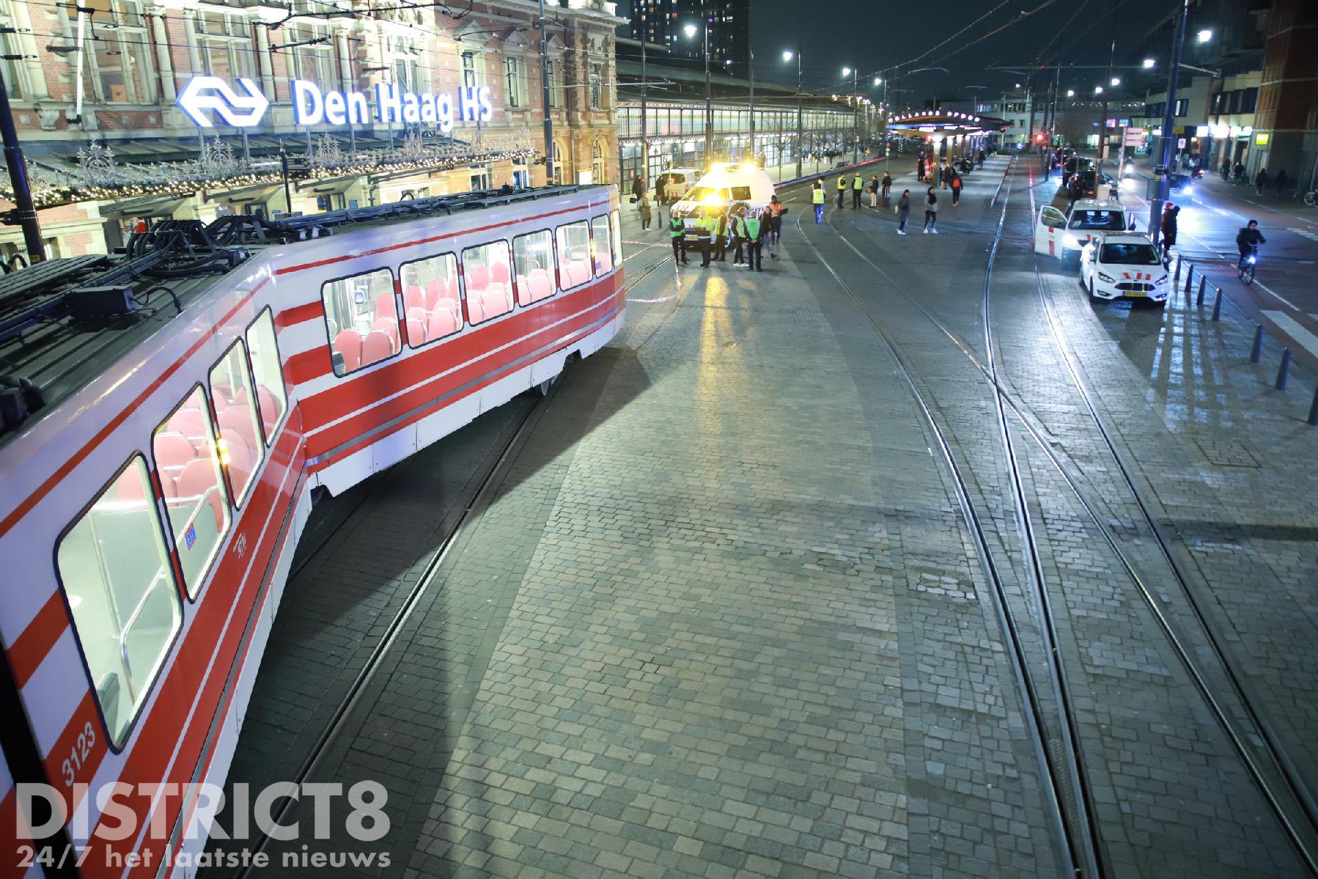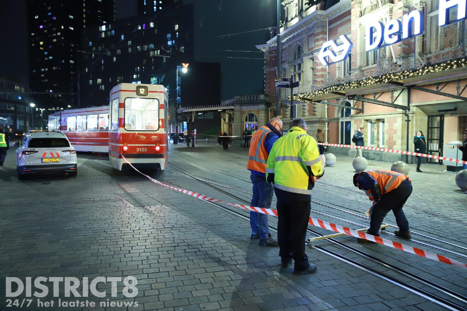 Den Haag – Voor NS-station Holland Spoor aan het Stationsplein in Den Haag is vrijdagavond 2 december een tram van de HTM ontspoord.
