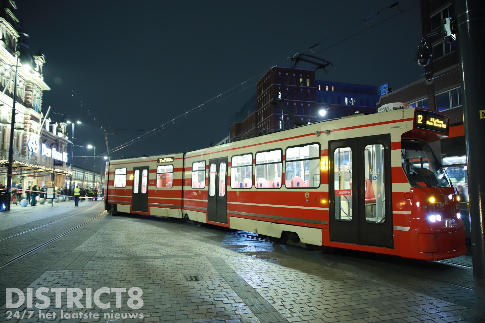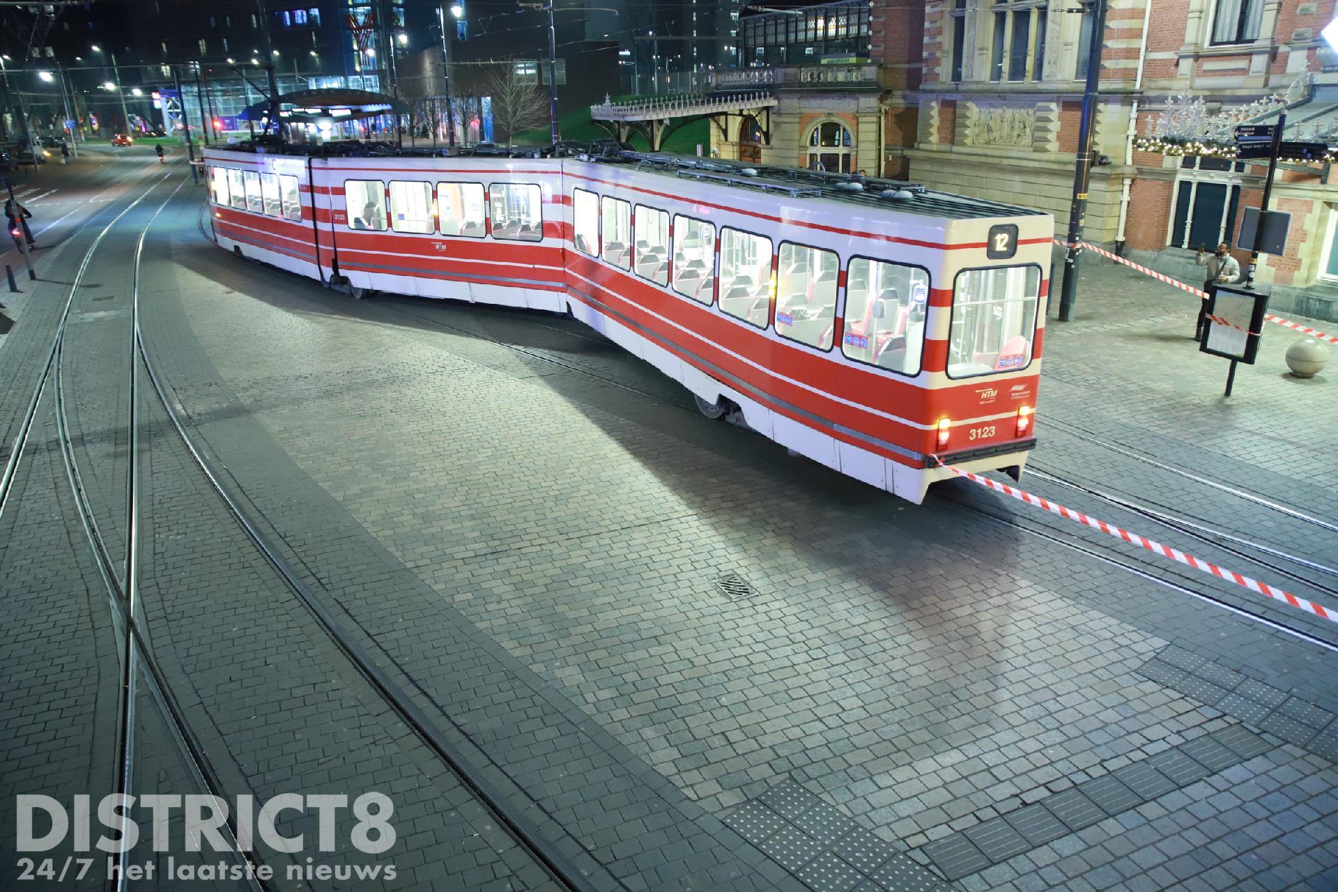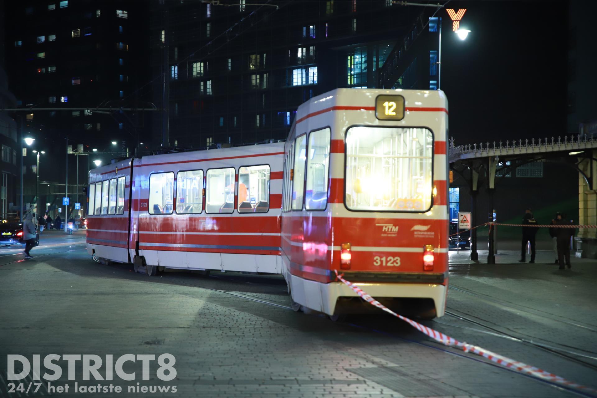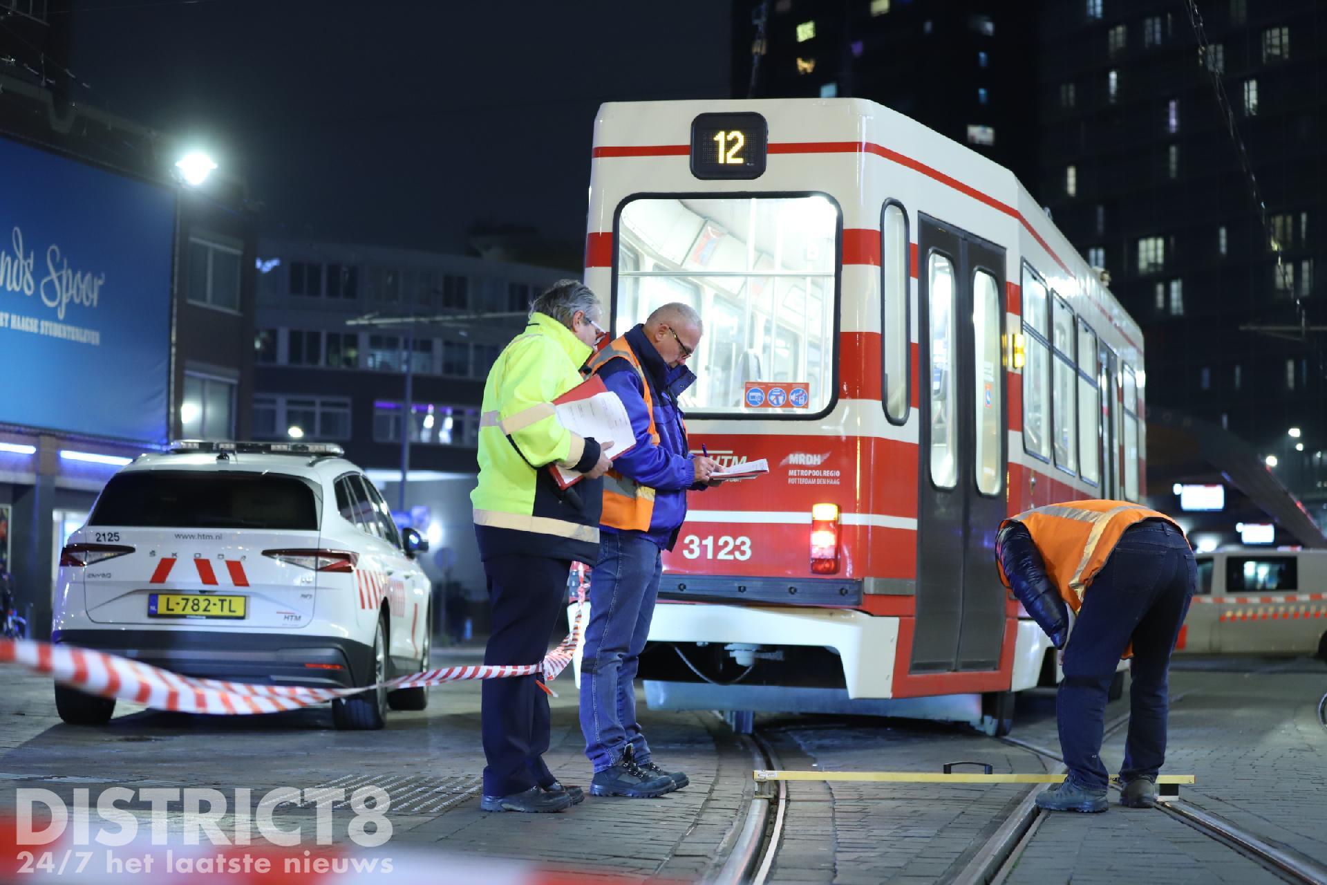 Den Haag – Voor NS-station Holland Spoor aan het Stationsplein in Den Haag is vrijdagavond 2 december een tram van de HTM ontspoord.