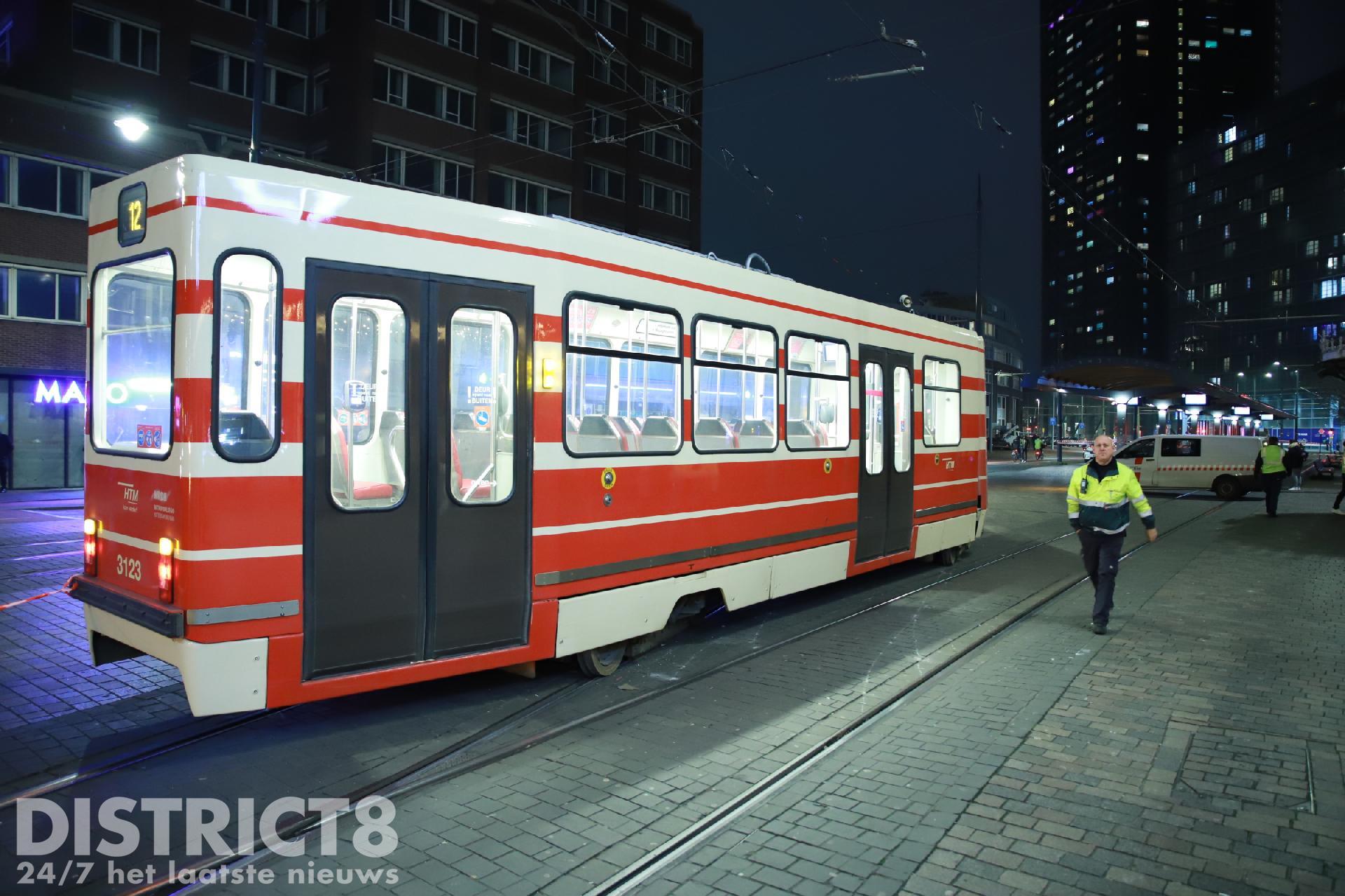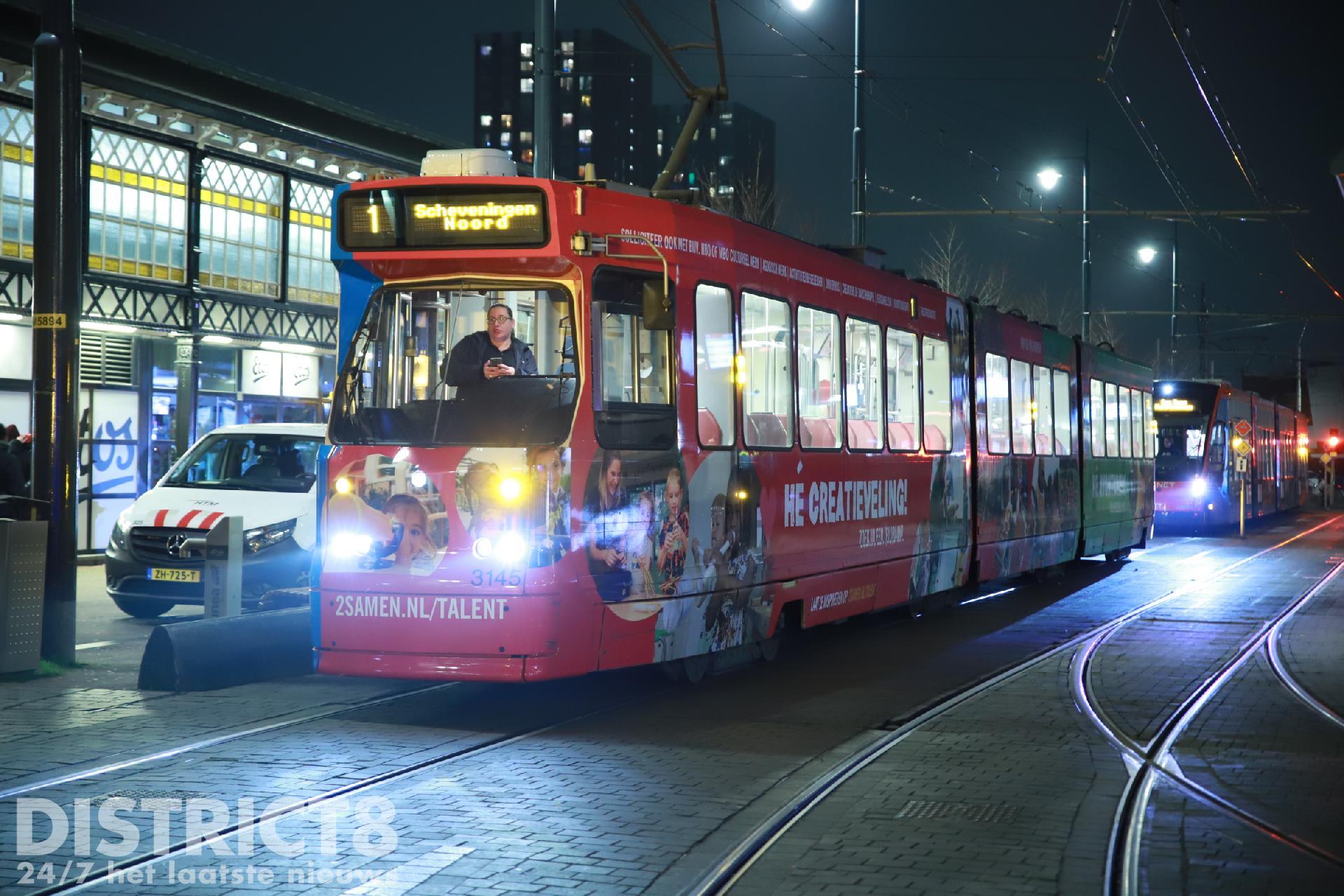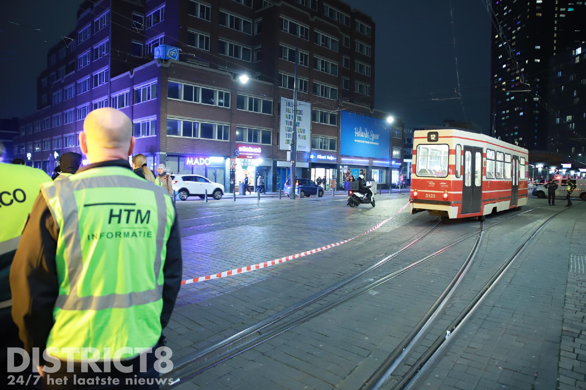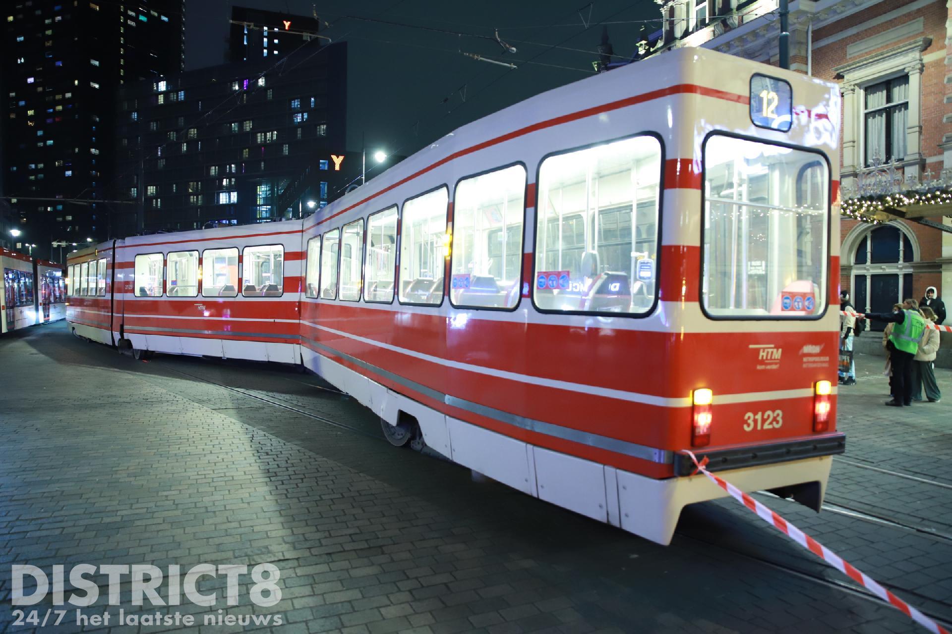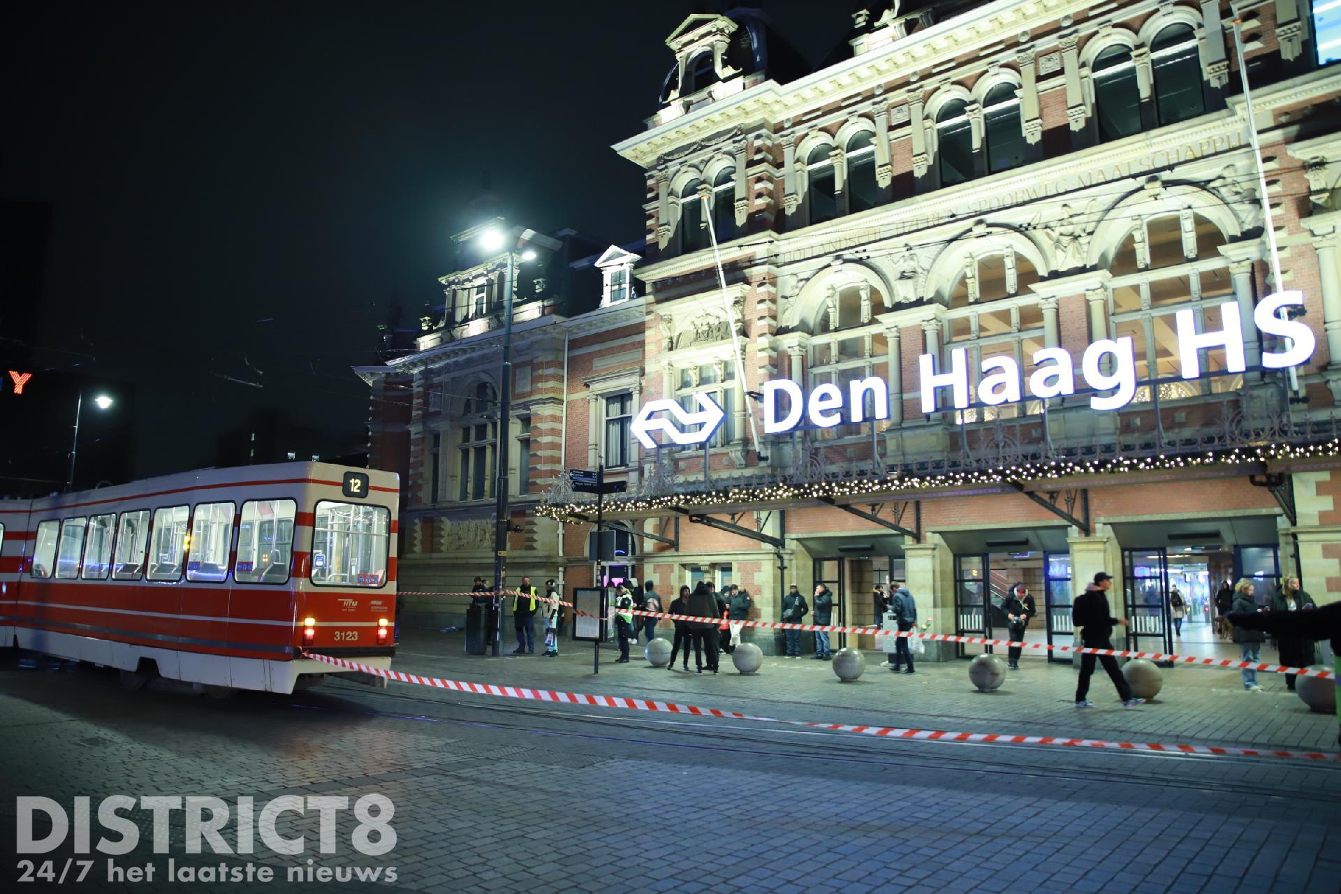 Den Haag – Voor NS-station Holland Spoor aan het Stationsplein in Den Haag is vrijdagavond 2 december een tram van de HTM ontspoord.