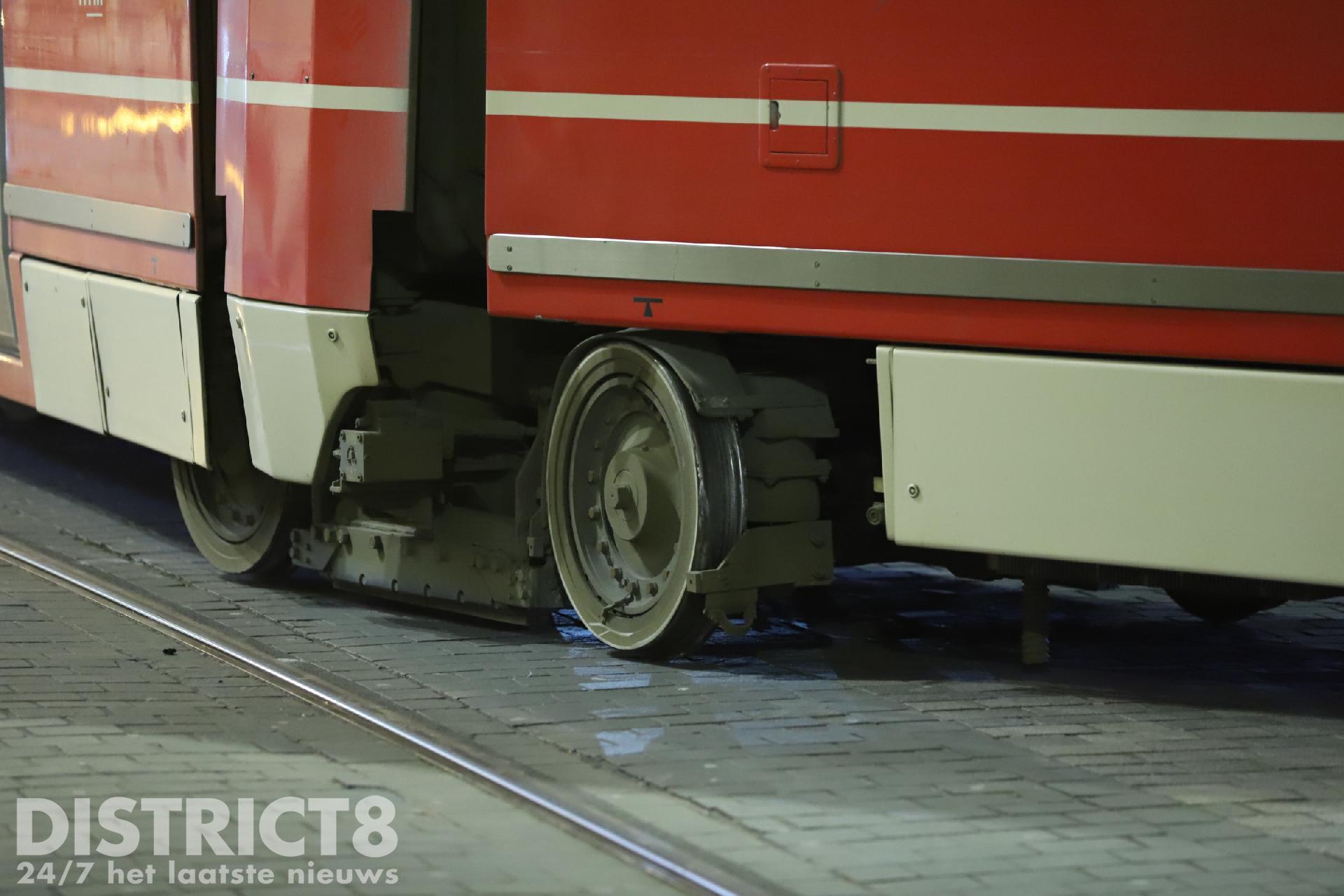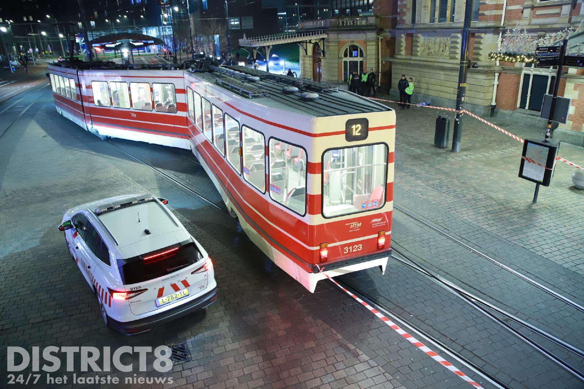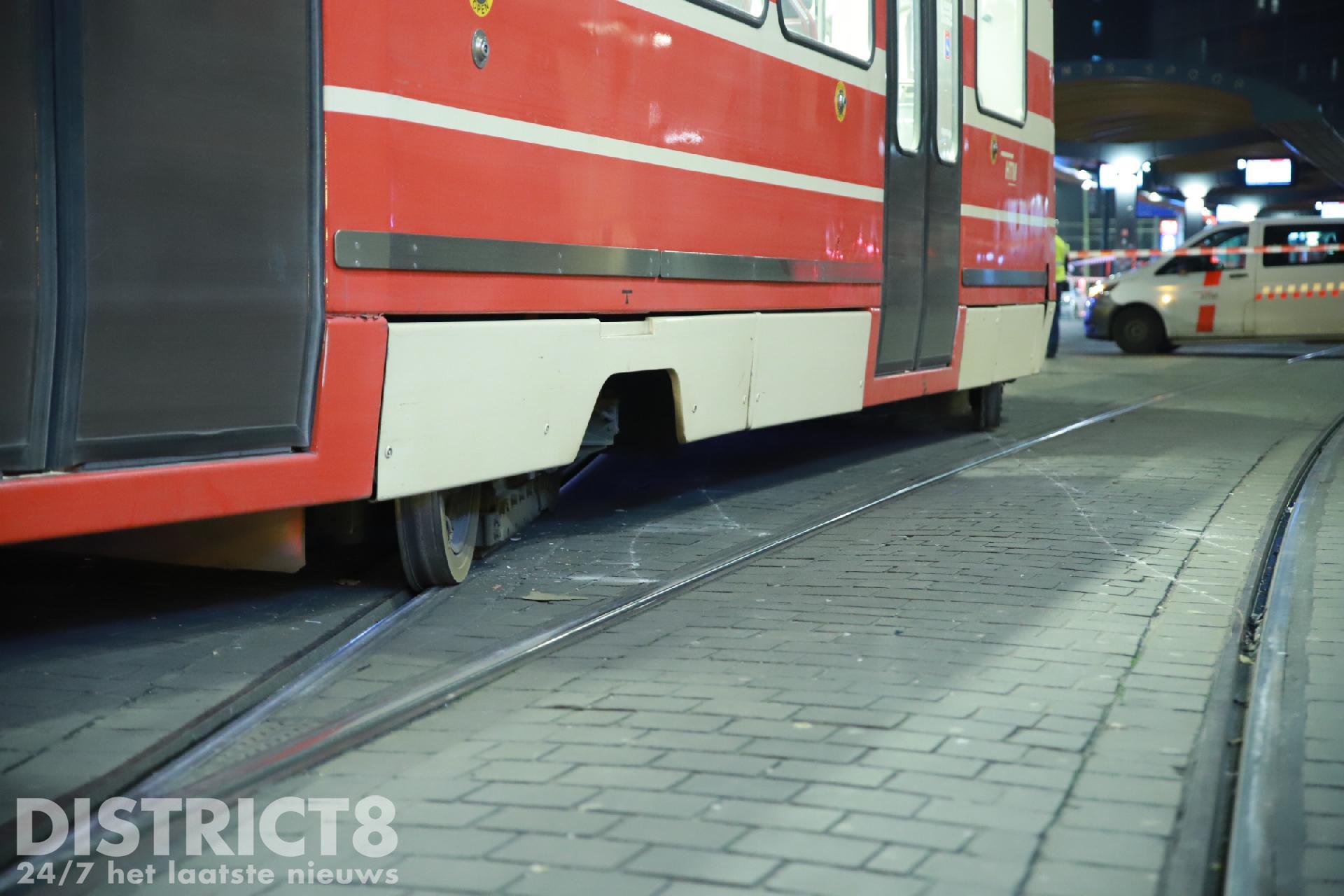 Het middelste gedeelte van de tram staat buiten de rails en het zal nog enige tijd duren tot dit is verholpen. Door de ontsporing is het tramverkeer rond Holland Spoor ontregelt.