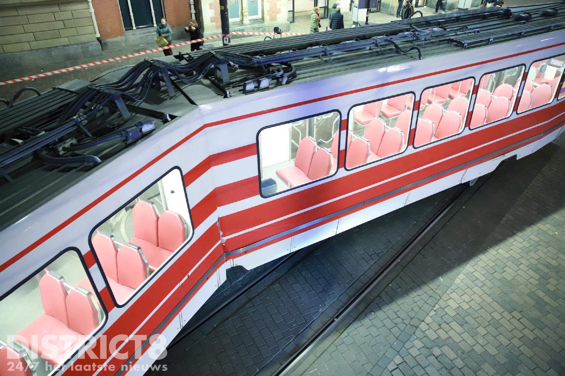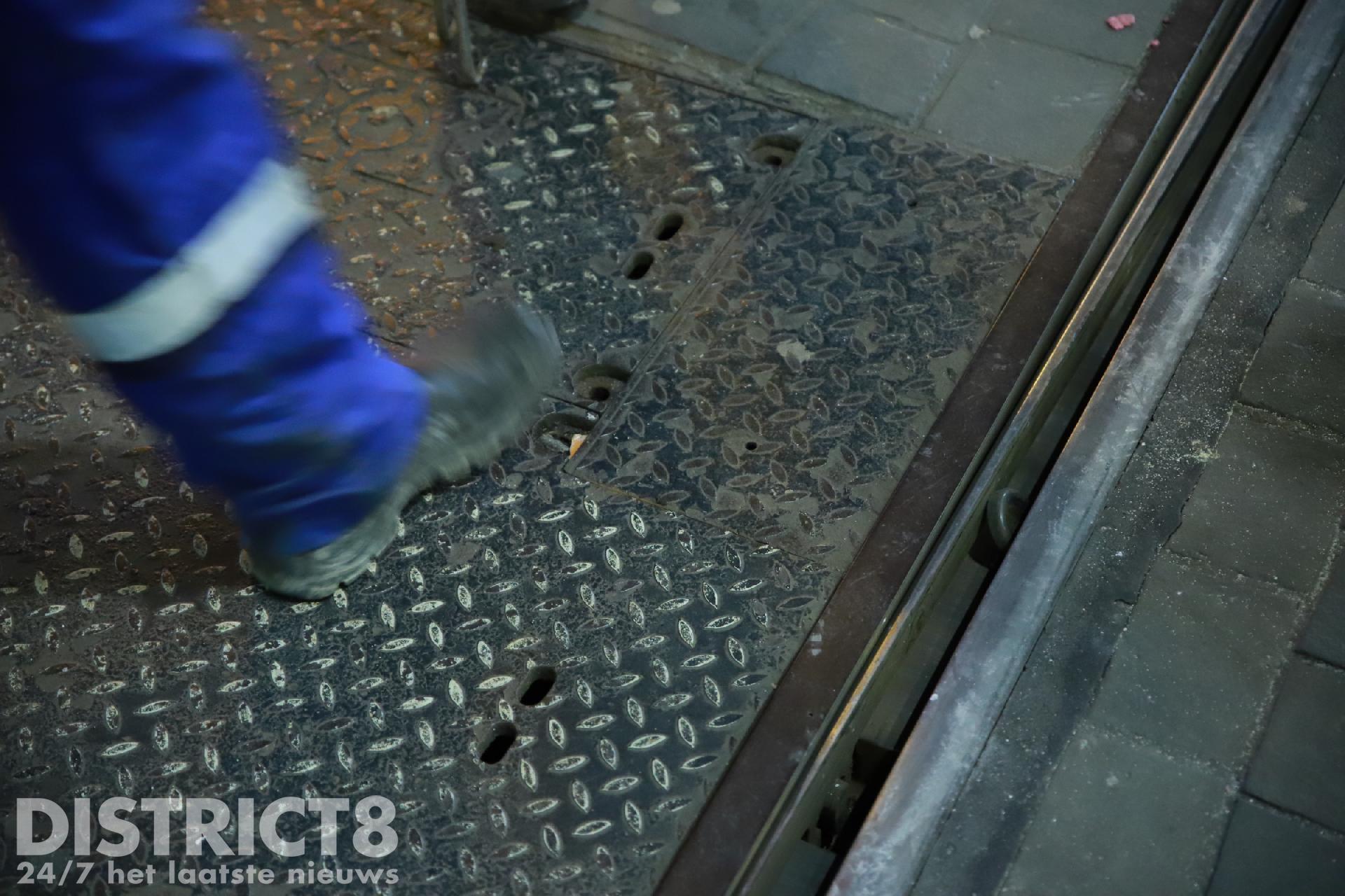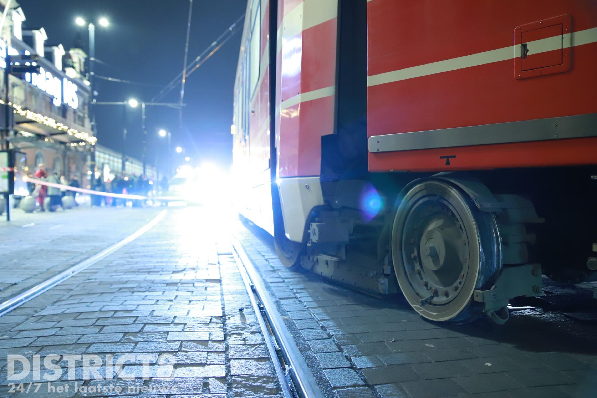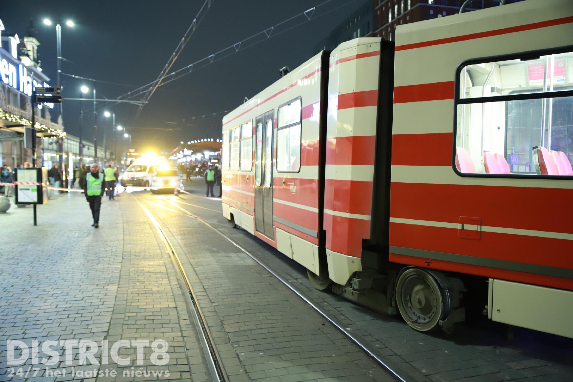 Het middelste gedeelte van de tram staat buiten de rails en het zal nog enige tijd duren tot dit is verholpen. Door de ontsporing is het tramverkeer rond Holland Spoor ontregelt.