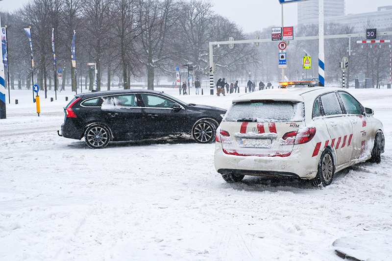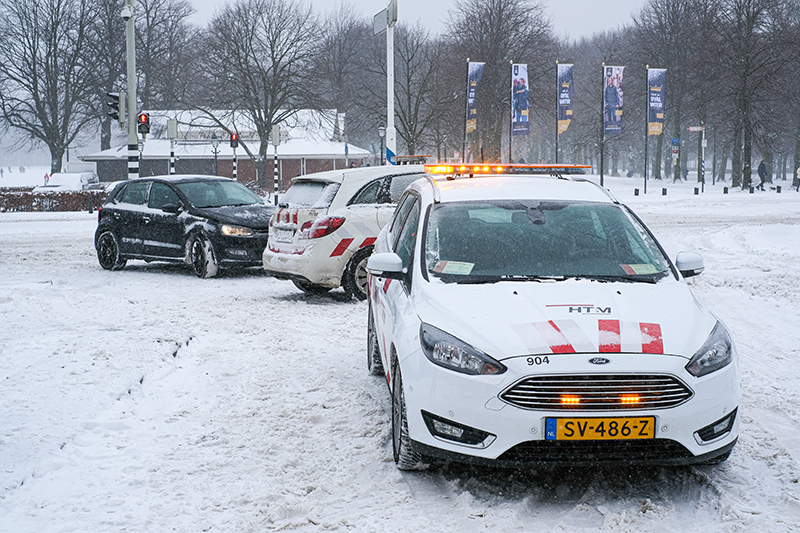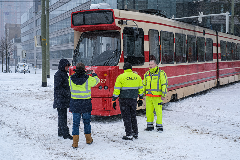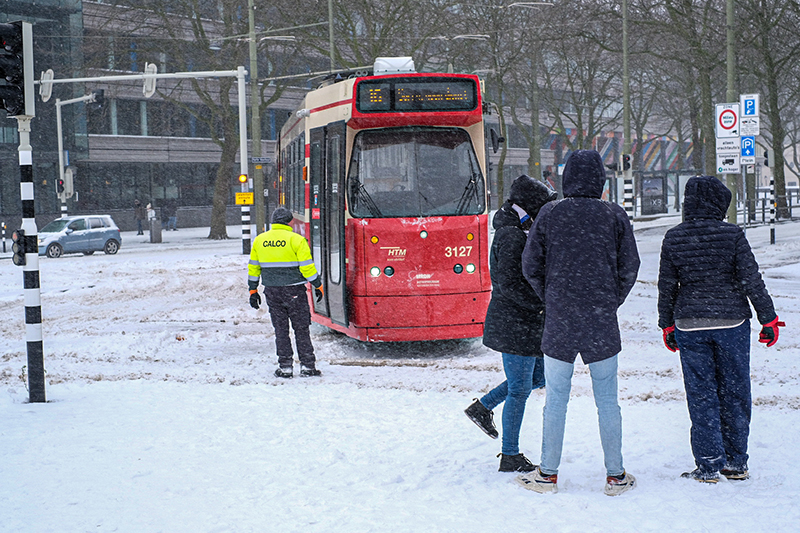 Den Haag – Op de Korte Voorhout in Den Haag is zondagmiddag een tram van de HTM ontspoort door de hevige sneeuwval.