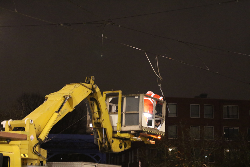 Nadat de stilstaande trams achteruit zijn gereden, konden zij de doorgebrande kabel repareren.