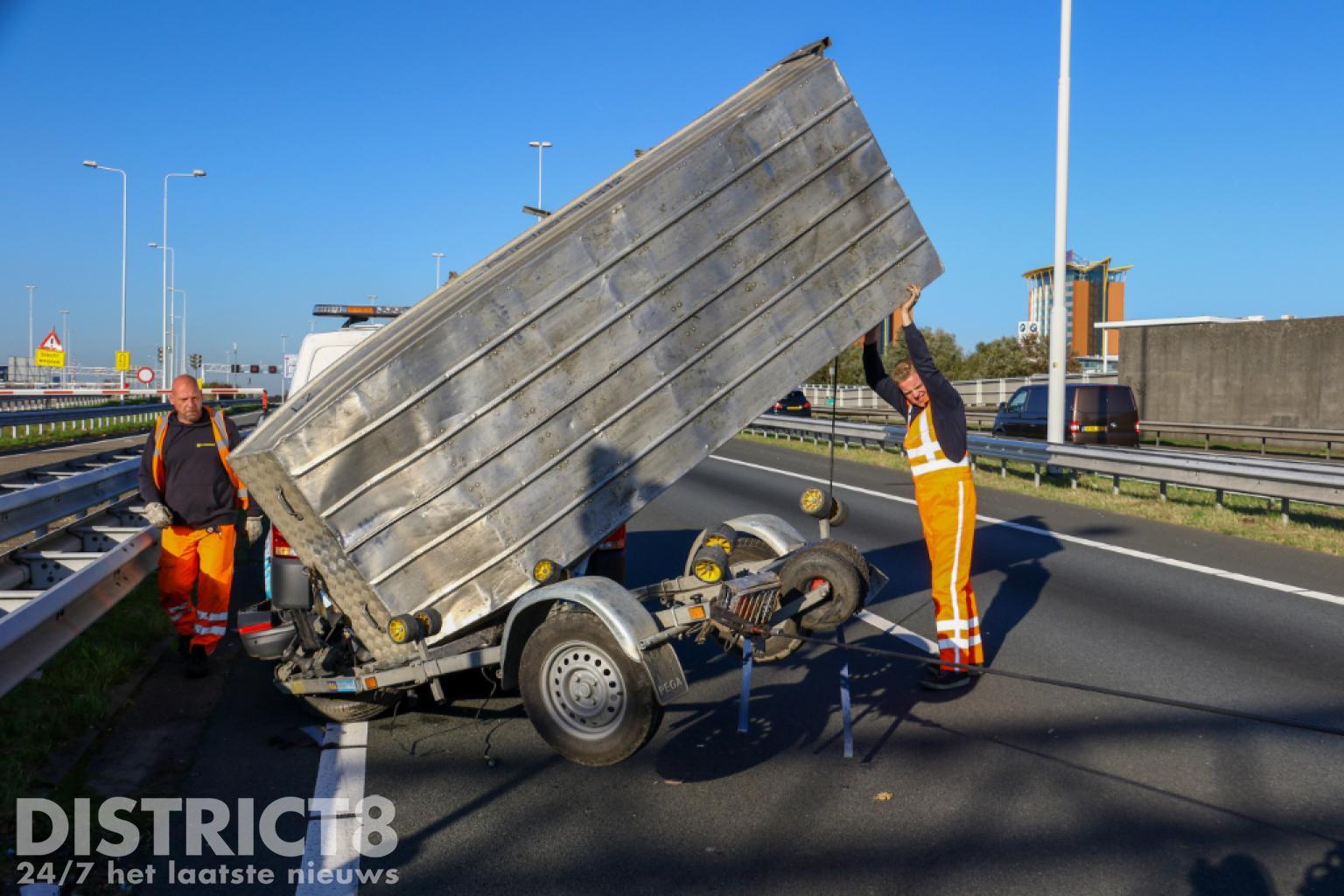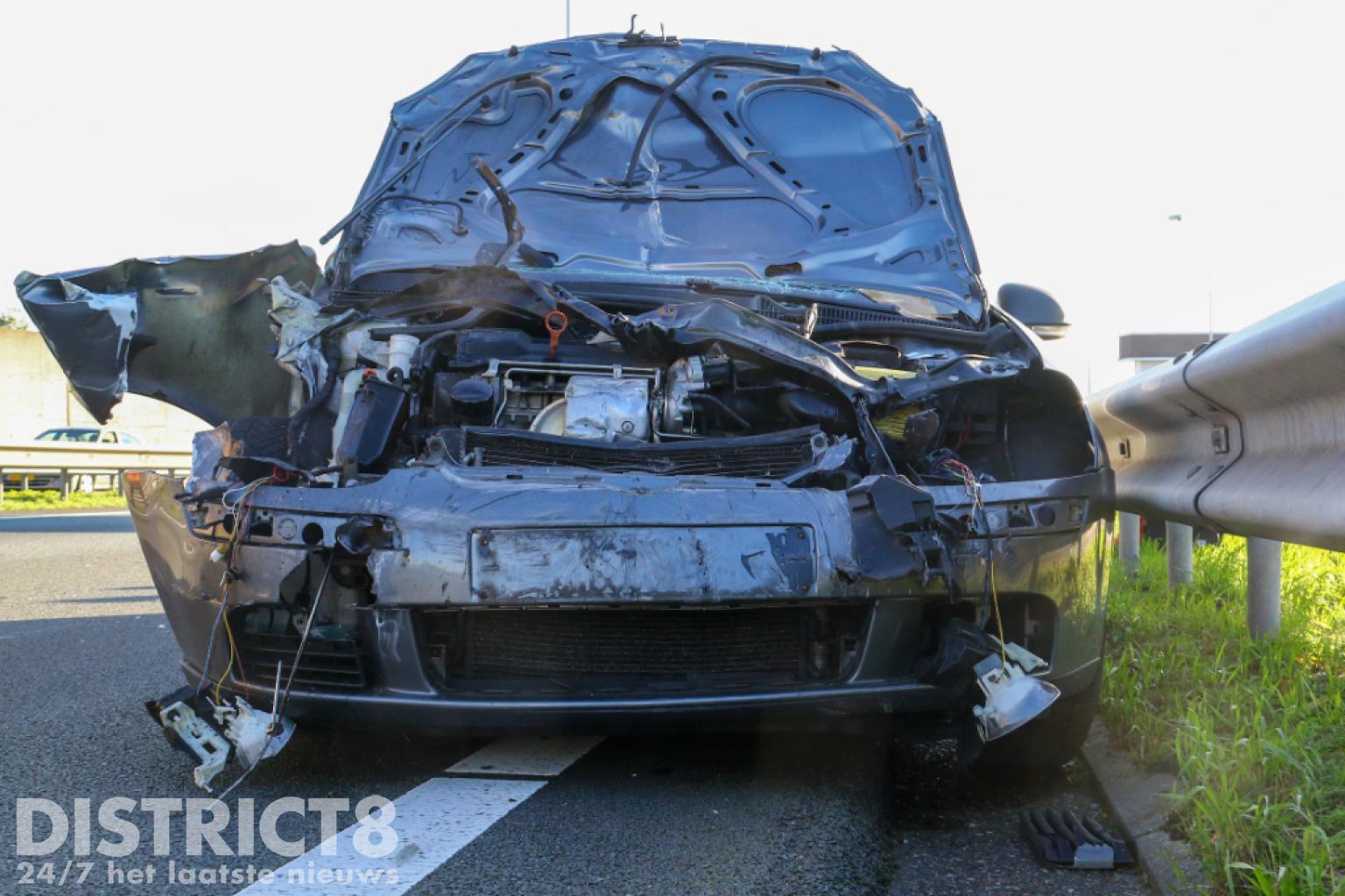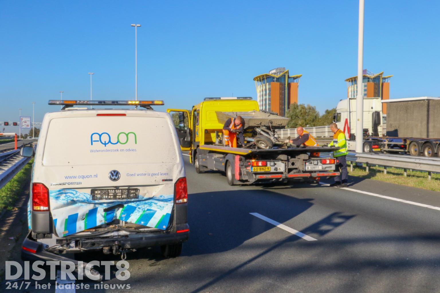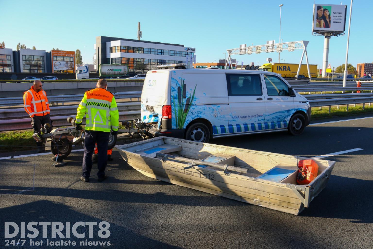 Een personenauto klapte vol op een busje met aanhanger. Als een wonder raakte er niemand gewond. Op de aanhanger lag een werkbootje die door de klap bleef hangen tussen busje en aanhanger.