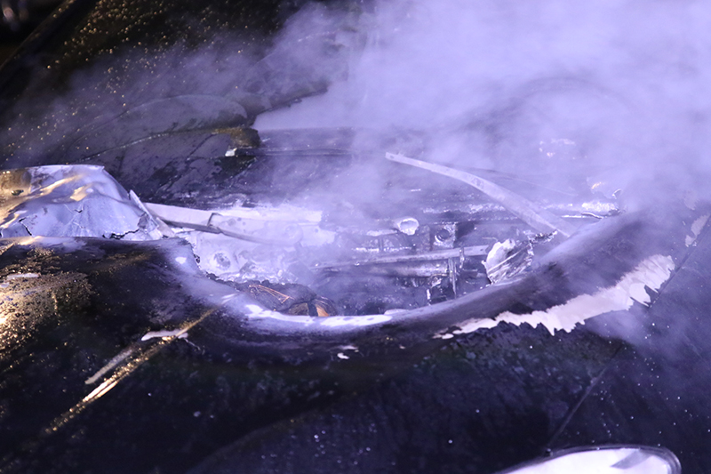 In de motorkap van de auto zit een flink gat, hoogstwaarschijnlijk is dit gat ontstaan door de explosie van vuurwerk.