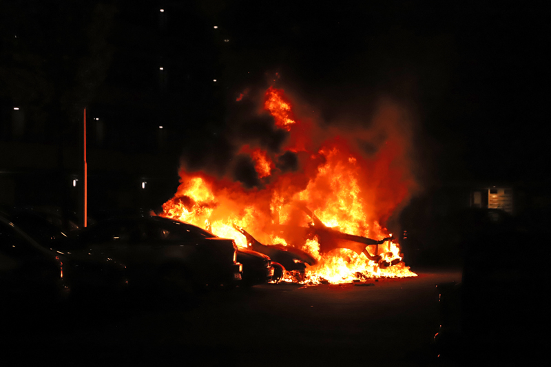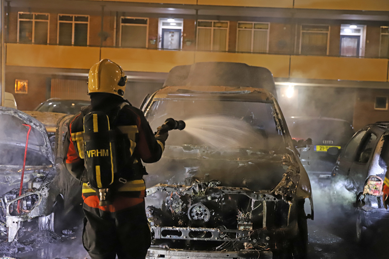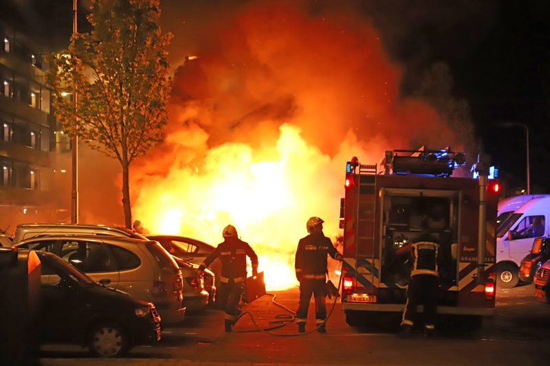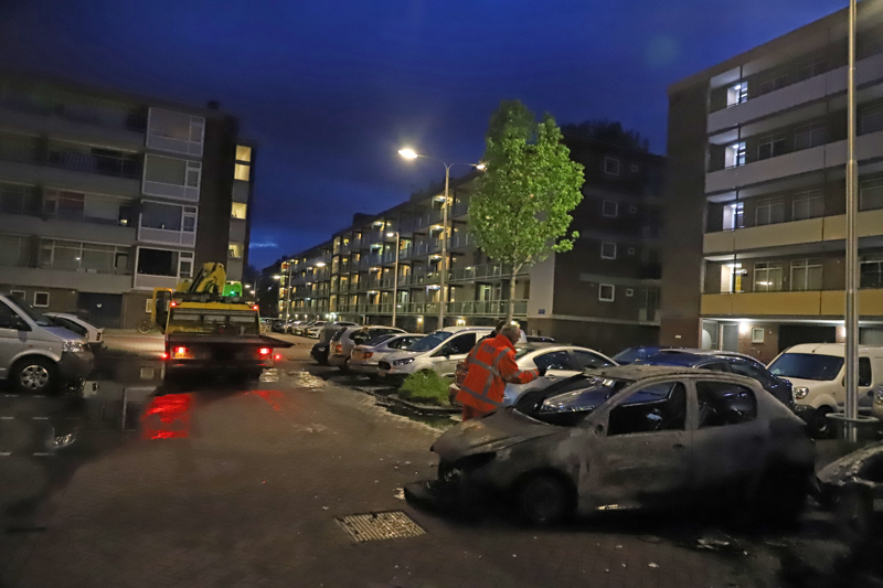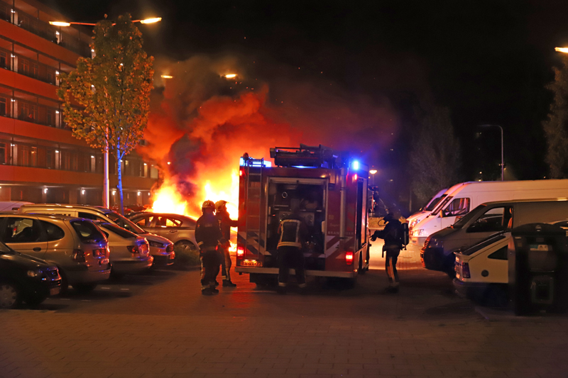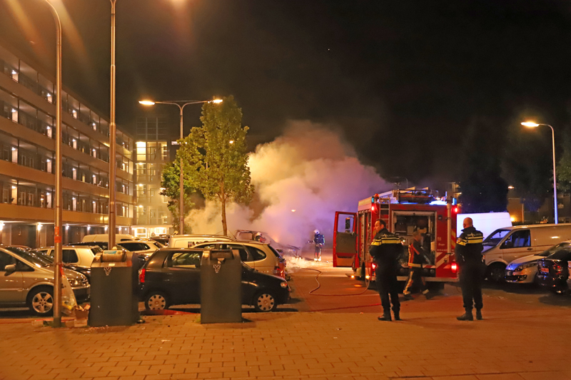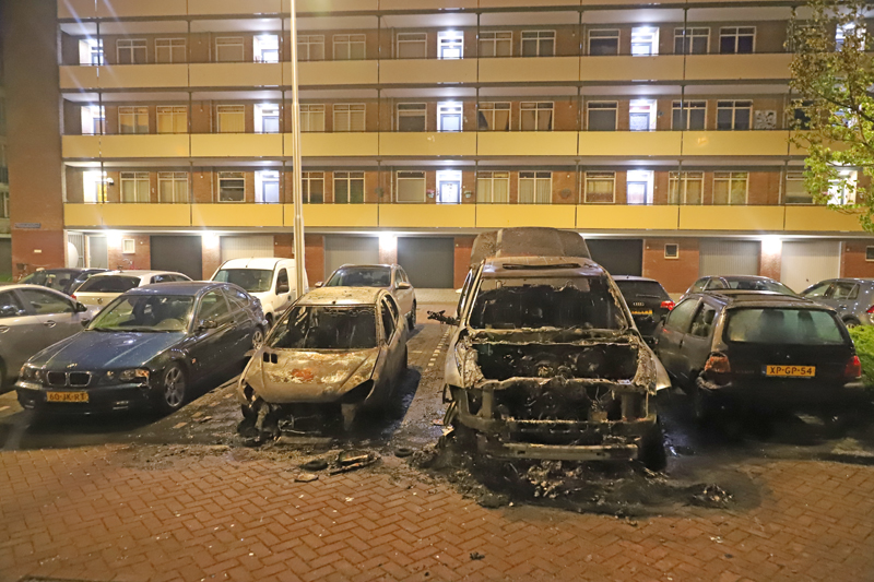 Gouda – Afgelopen nacht werd rond vier uur brand gesticht aan de Walraven van Halllaan in Gouda. Hierbij gingen twee auto’s in vlammen op.