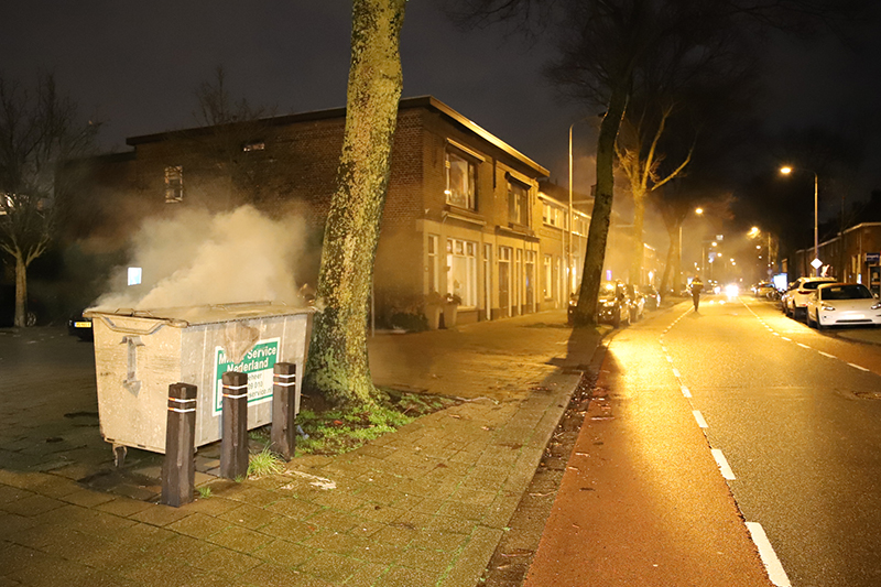 Op de Brasserskade stond een metalen rolcontainer in brand, enkele meters verderop lag een stapel afval te branden in het midden van de straat.