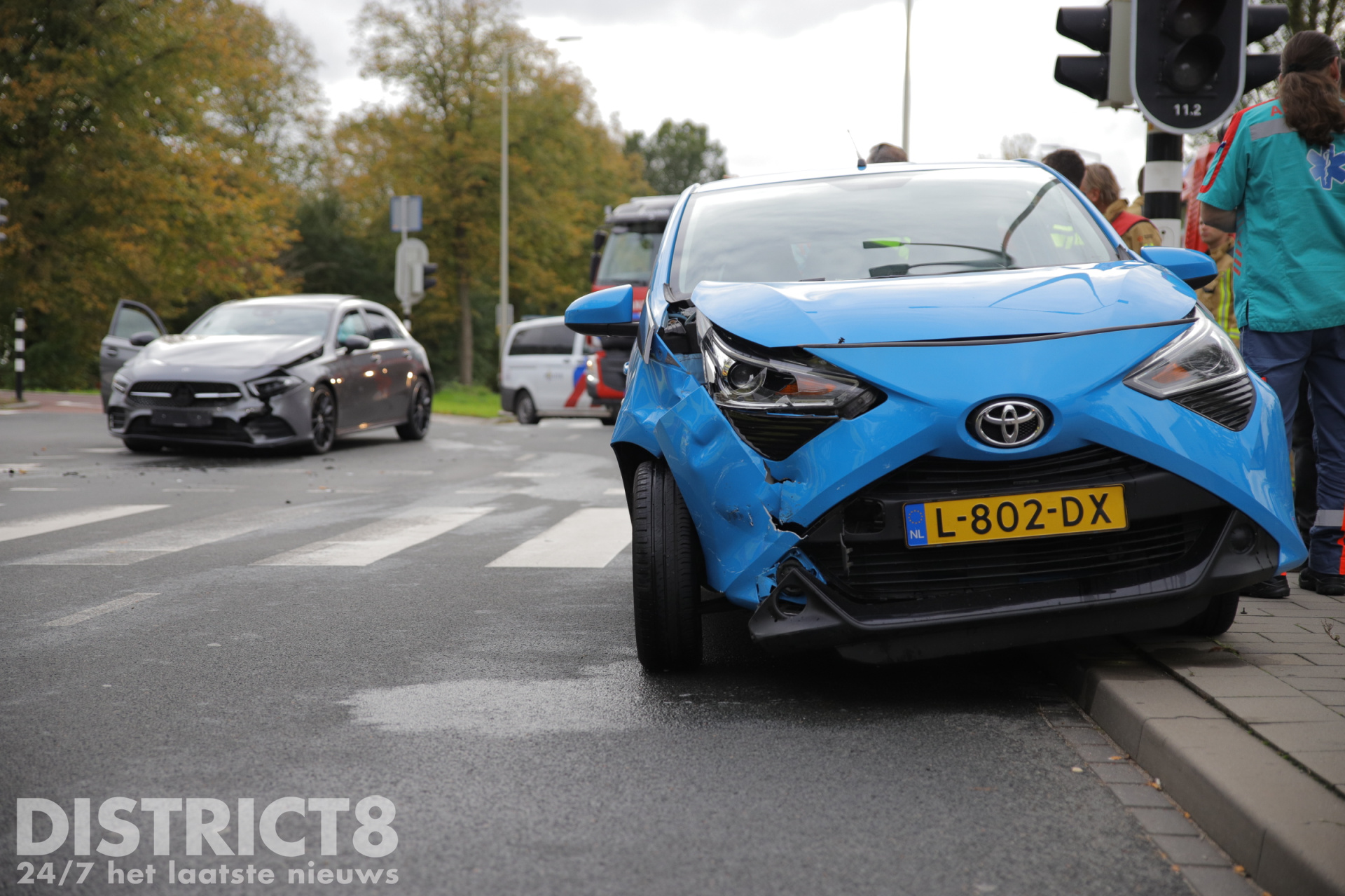 Twee autos kwamen met elkaar in botsing. Daarbij raakte de twee inzittenden van de Mercedes gewond. De inzittenden van de andere auto liepen geen letsel op. De twee gewonden worden in een ter plaatse gekomen ambulance nagekeken.