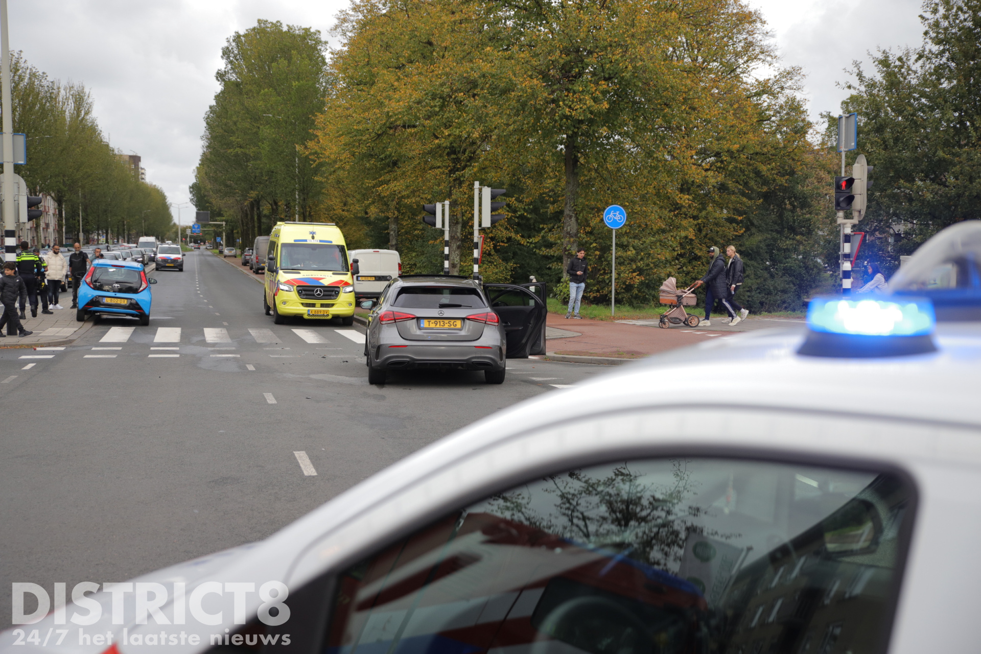 De kruising is volledig afgesloten. Hierdoor is er een flinke verkeersdrukte onstaan op de Erasmusweg.