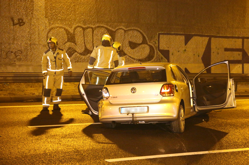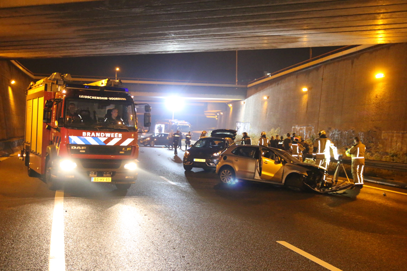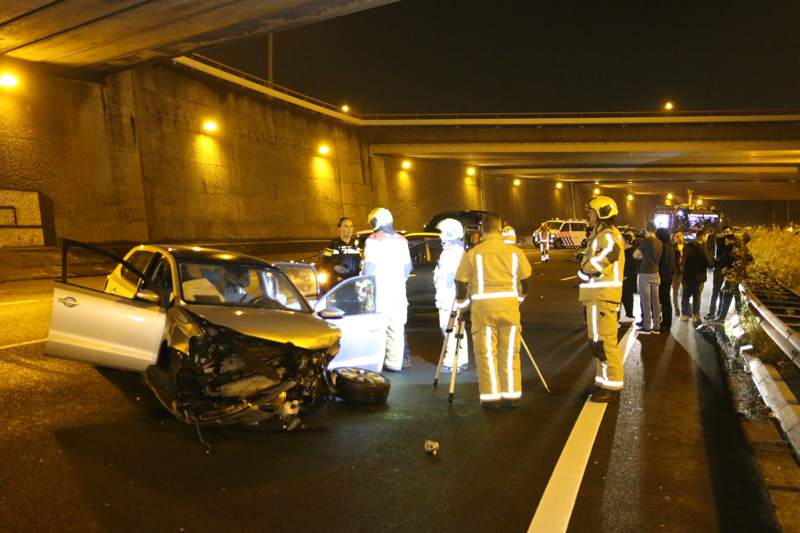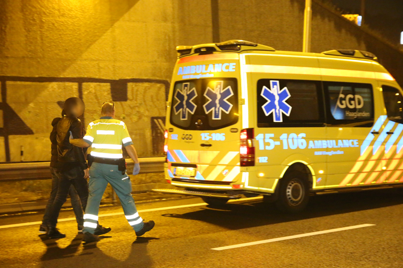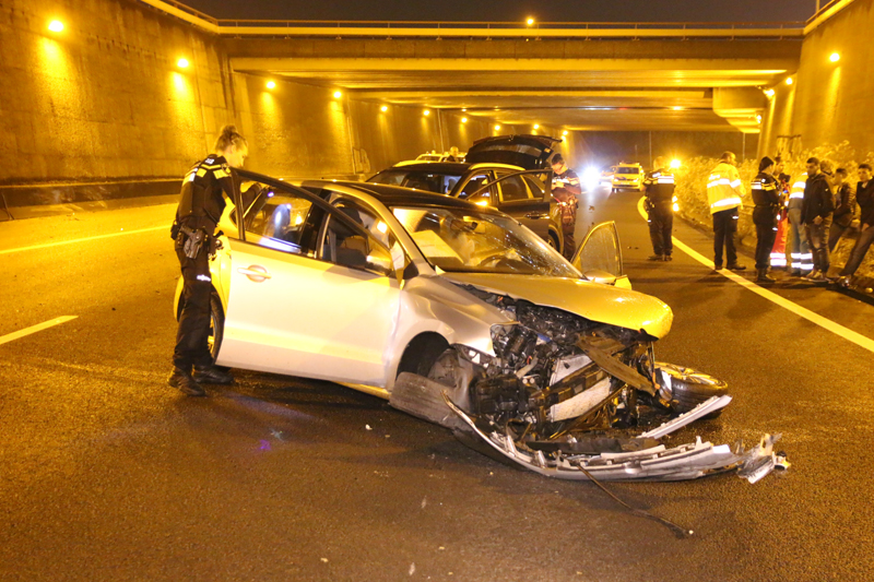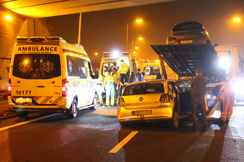 Een automobilist verloor hier de macht over het stuur en knalde tegen een wand. De bestuurder en de bijrijder, die volgens de politie geen gordel droegen, zijn gewond geraakt. Een derde inzittende, die ook geen gordel droeg, kwam met de schrik vrij. De A13 werd vanaf Den Haag afgesloten.