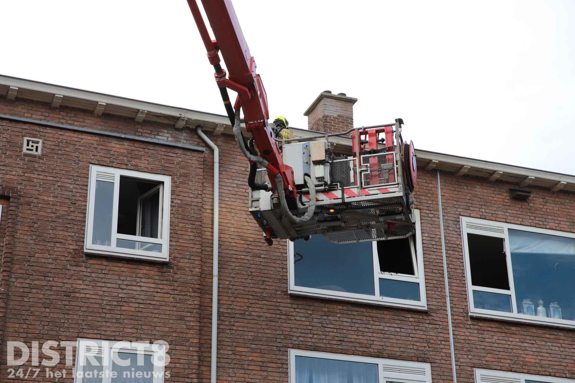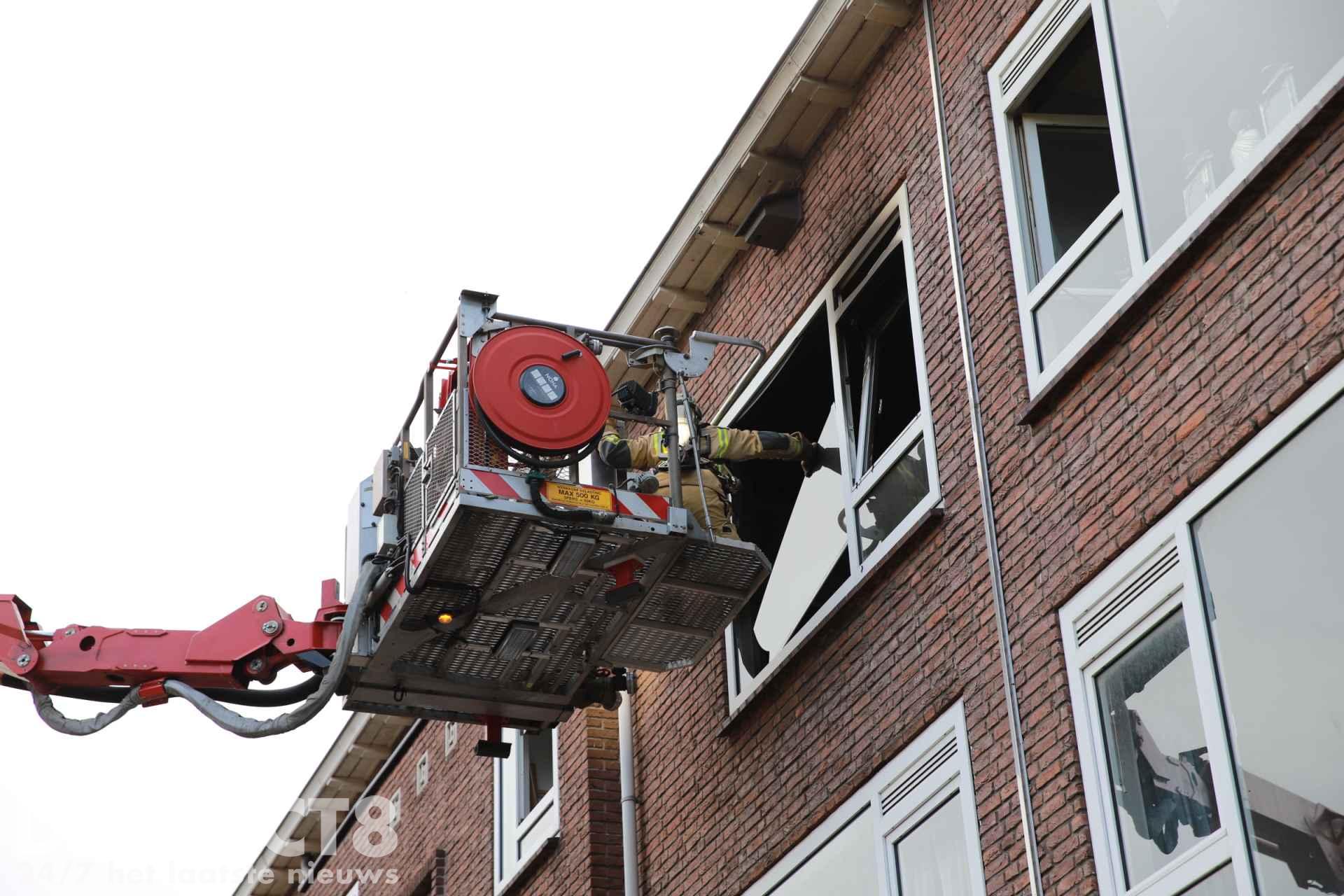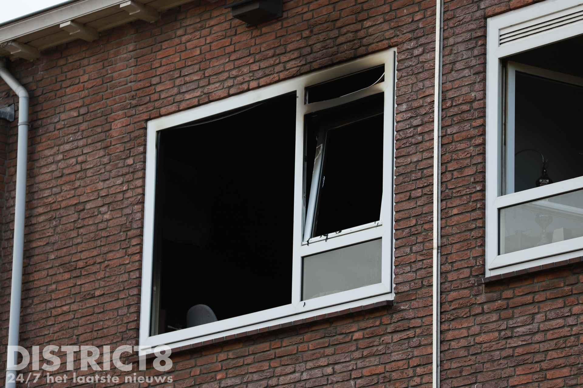 De portiekwoning is flink beschadigd door de brand. Team Brandonderzoek zal ter plaatse komen om onderzoek te doen.
