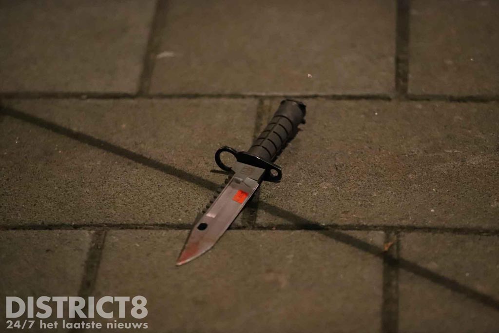Op straat is het mes van de verdachte aangetroffen. De politie heeft een ruim plaats delict afgezet.