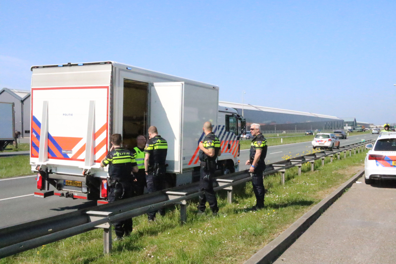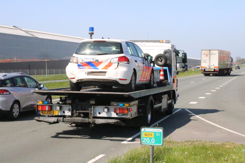 De beschadigde auto is door een politieberger afgevoerd. De politie vrachtwagen kon zelf doorrijden.