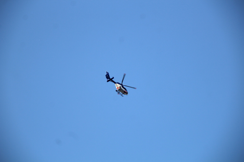 De politiehelikopter vliegt boven het incident en zoekt mee vanuit de lucht.