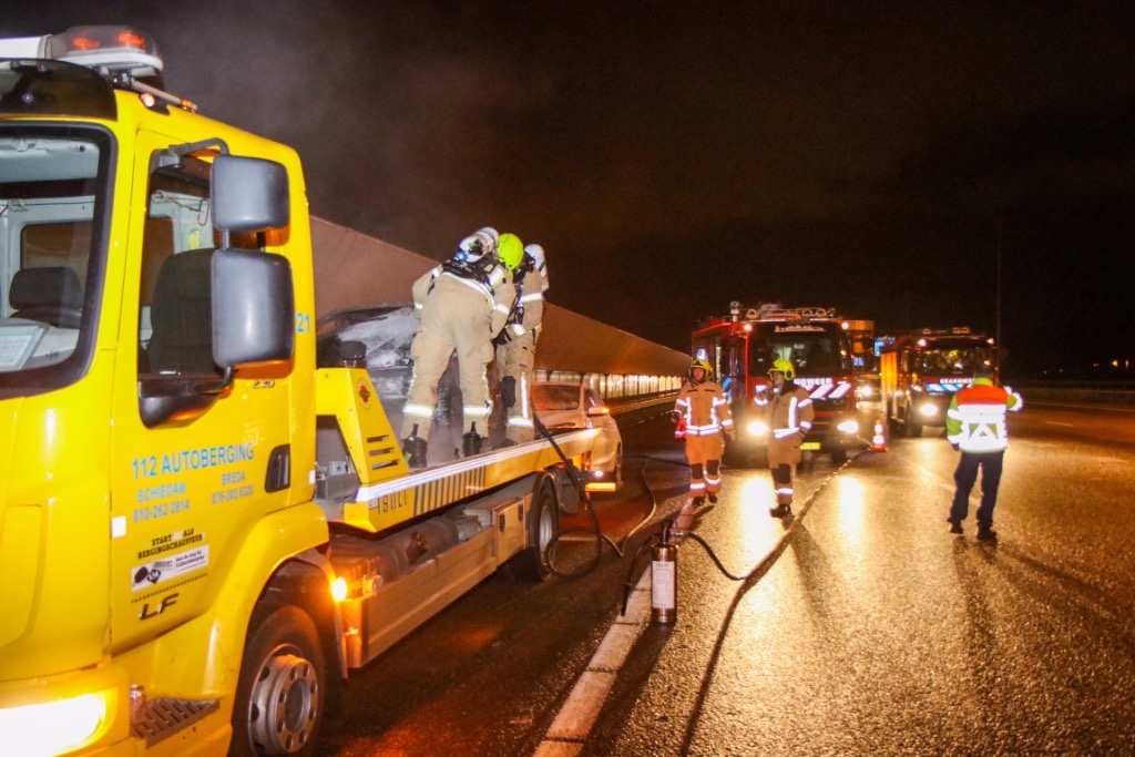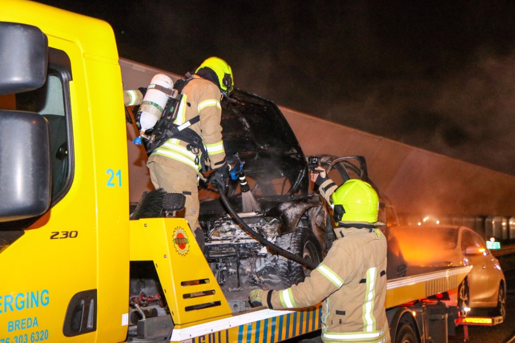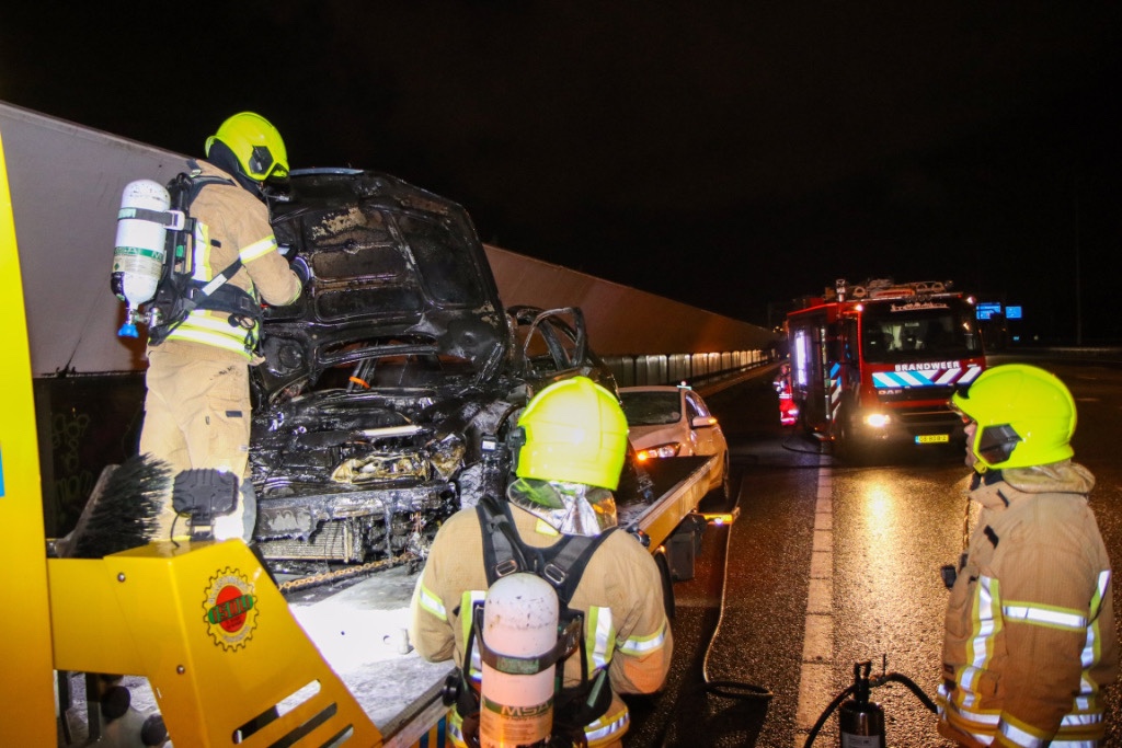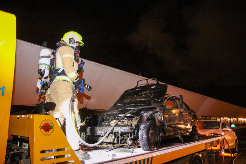 Uitgebrande auto opnieuw in brand op bergingsvoertuig A4 Rotterdam