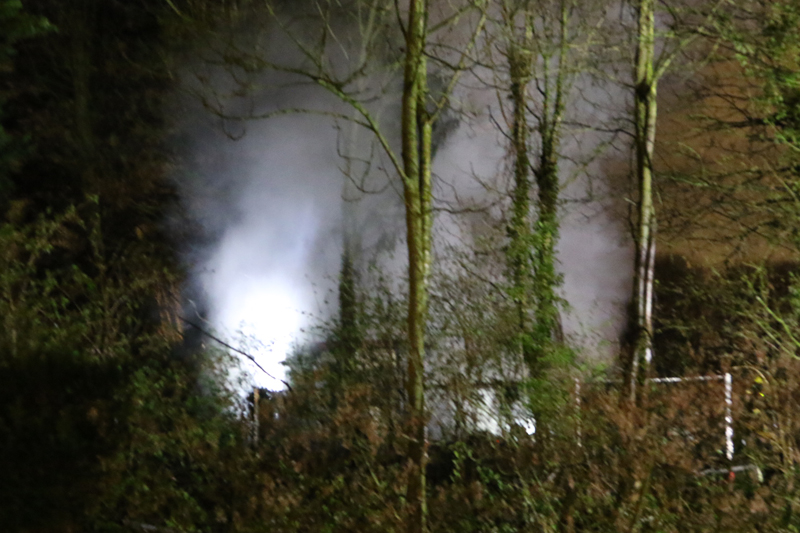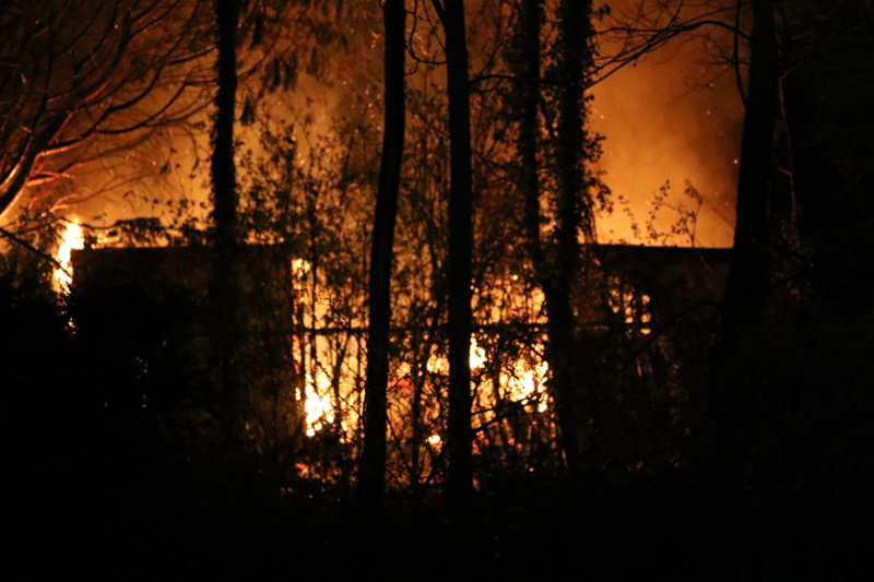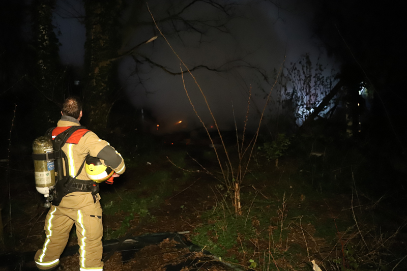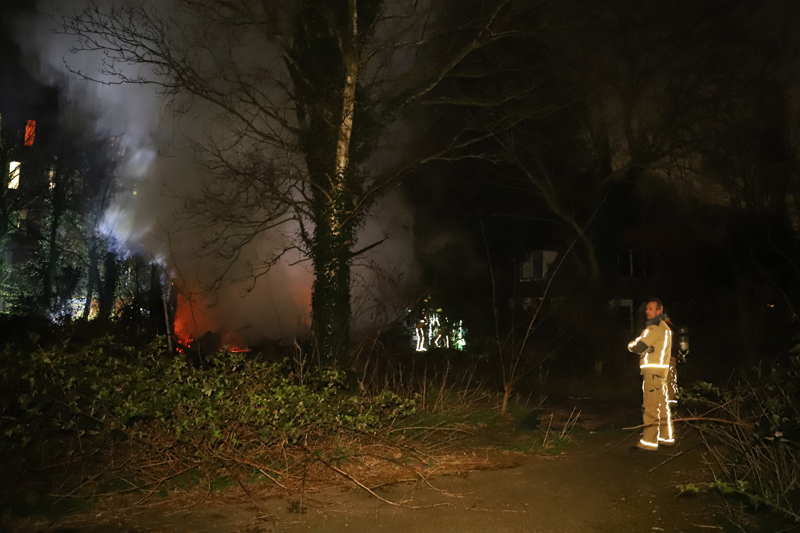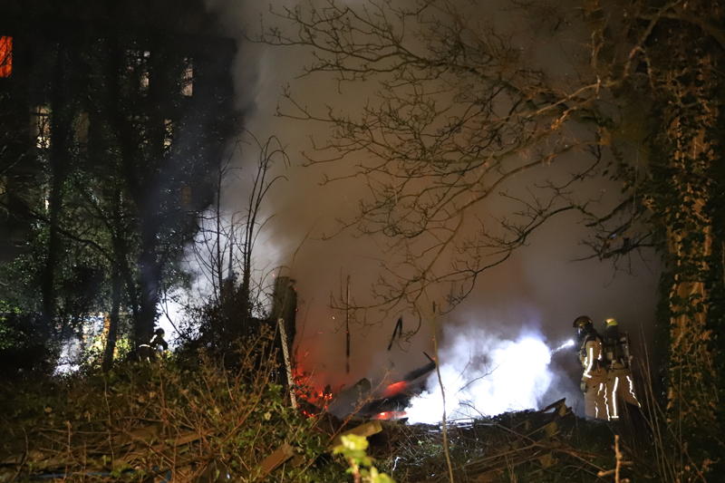 Rijswijk-Julialaantje. Brand is geblust, het schuurtje is volledig afgebrand. Brandweer gaat inpakken en terug naar de kazerne.