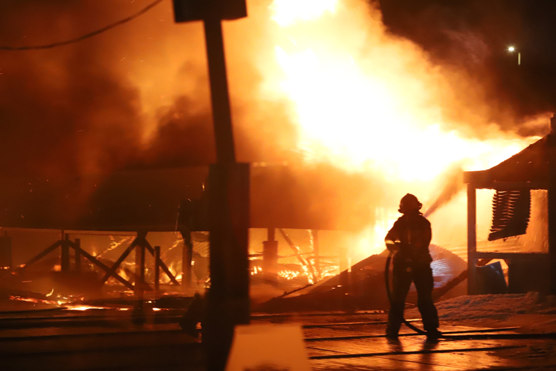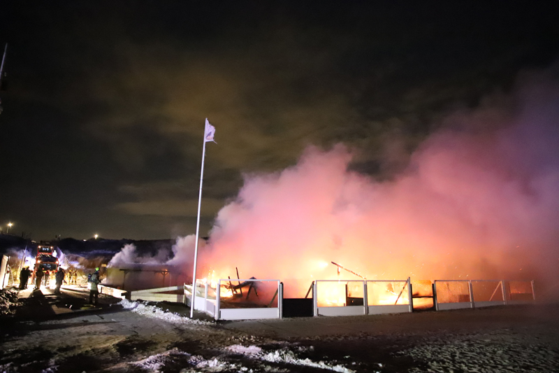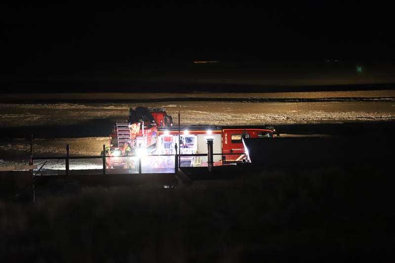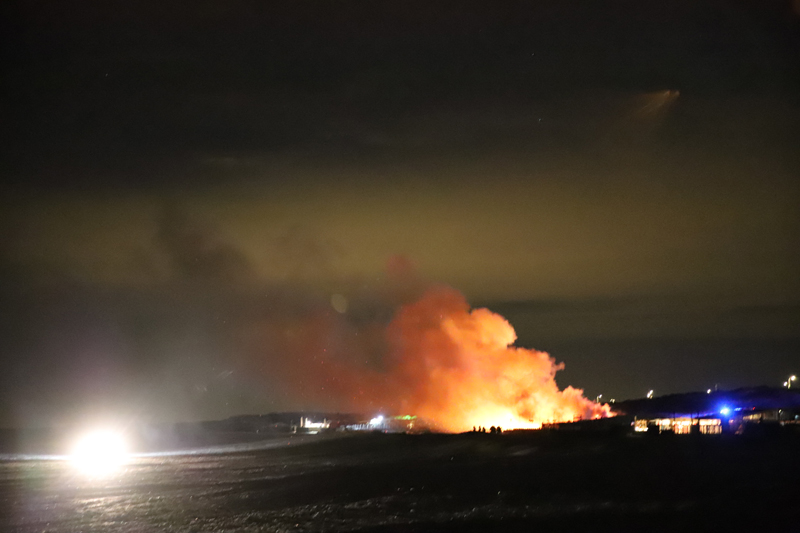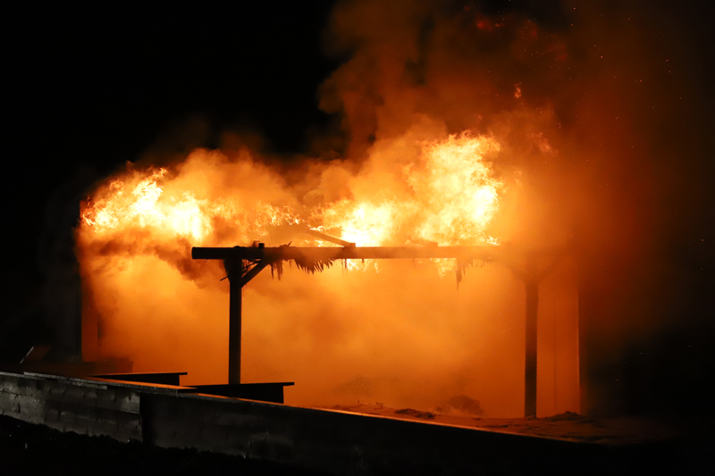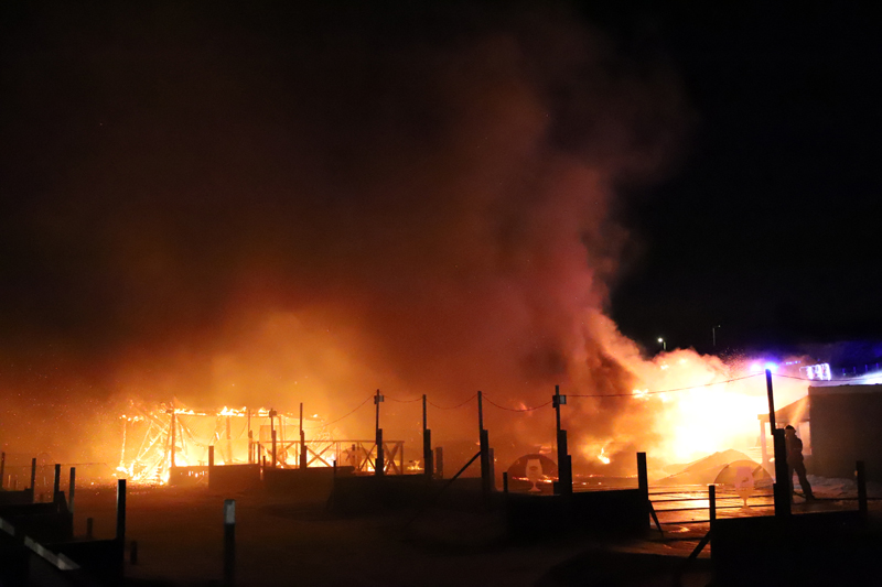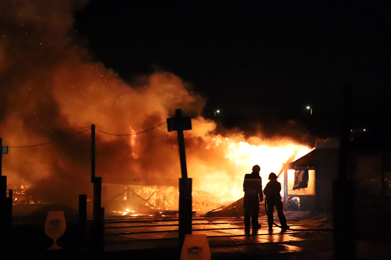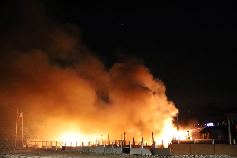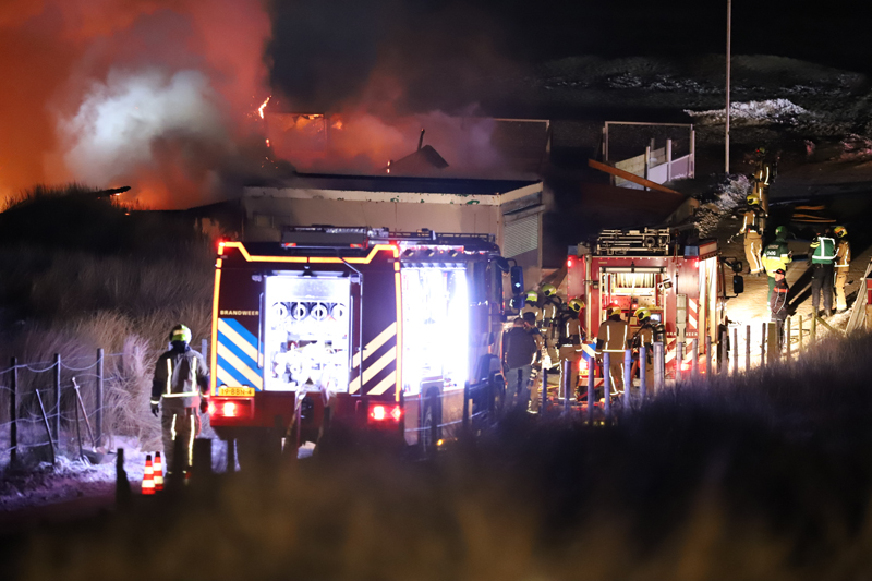 Ter plaatse bleek er een flinke uitslaande brand te zijn in een strandpaviljoen. Een kwartier na de eerste alarmering schaalde de brandweer op naar het sein ‘Grote Brand’, extra brandweer eenheden rukte met spoed uit.