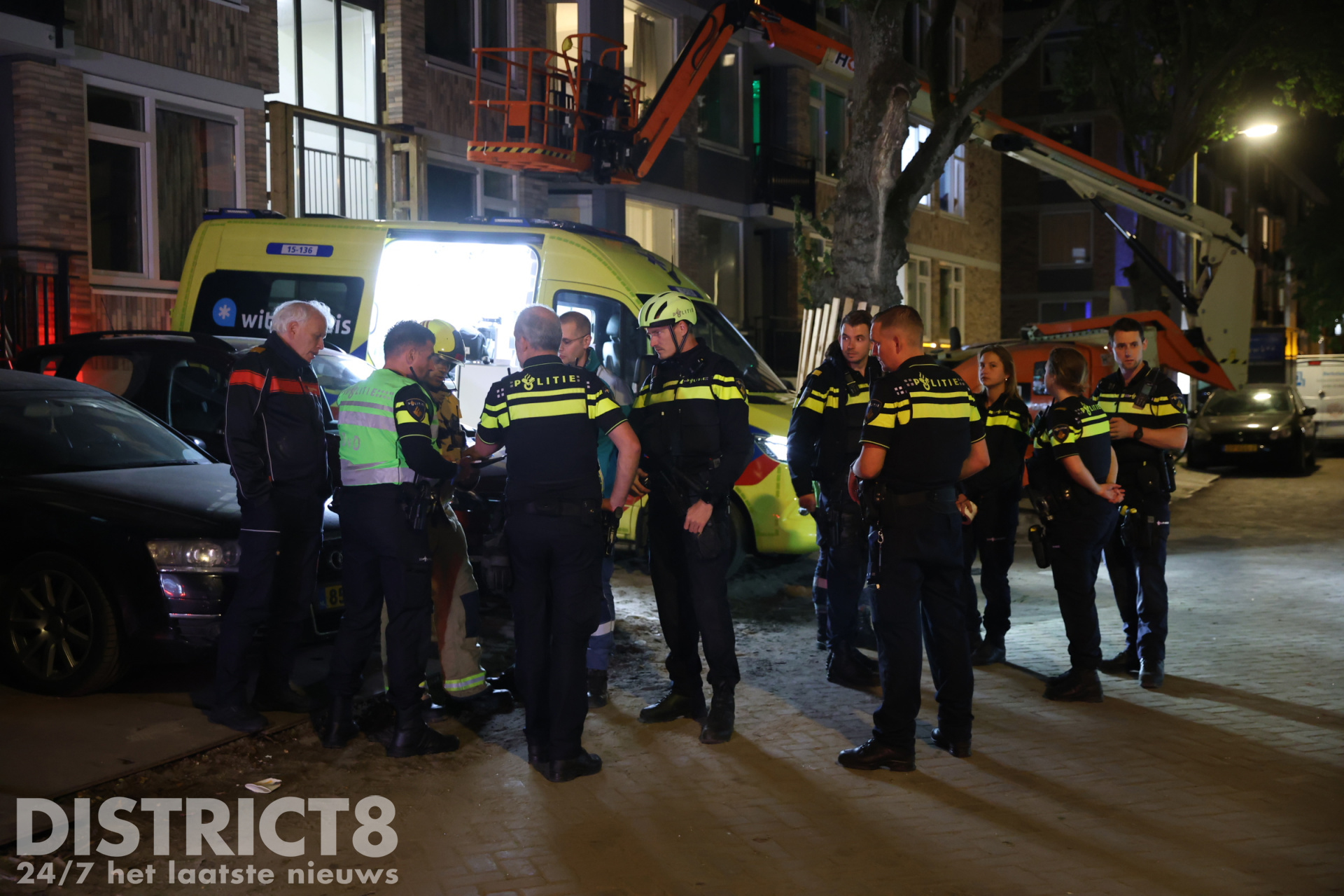De brandweer moest een auto verplaatsen die de toegang voor de hoogwerker blokkeerde. De zijruit werd ingeslagen en de handrem werd losgezet, waarna de auto kon worden verplaatst.