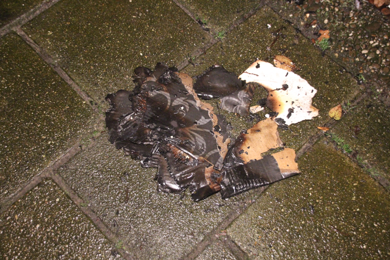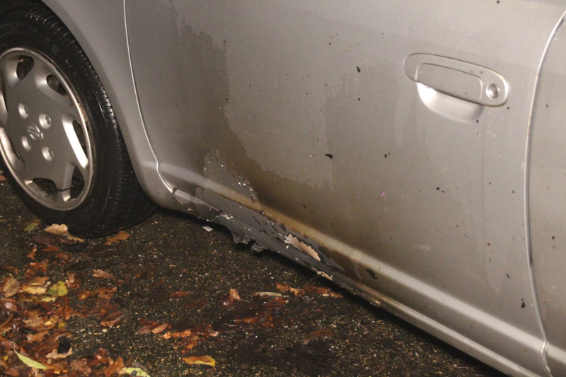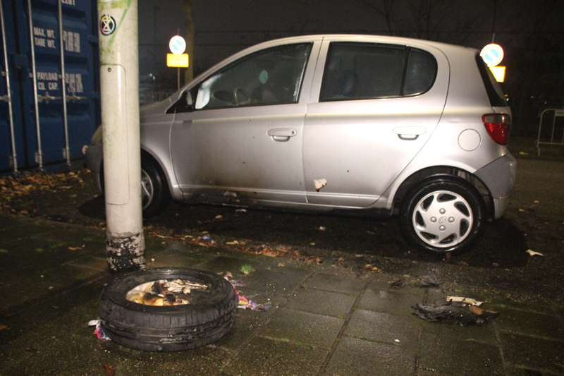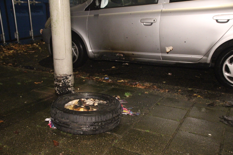 De vandalen staken een autobrand in brand. Deze legden ze daarna tegen een portier van de auto. De auto liep hierbij schade op.