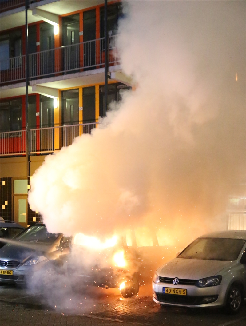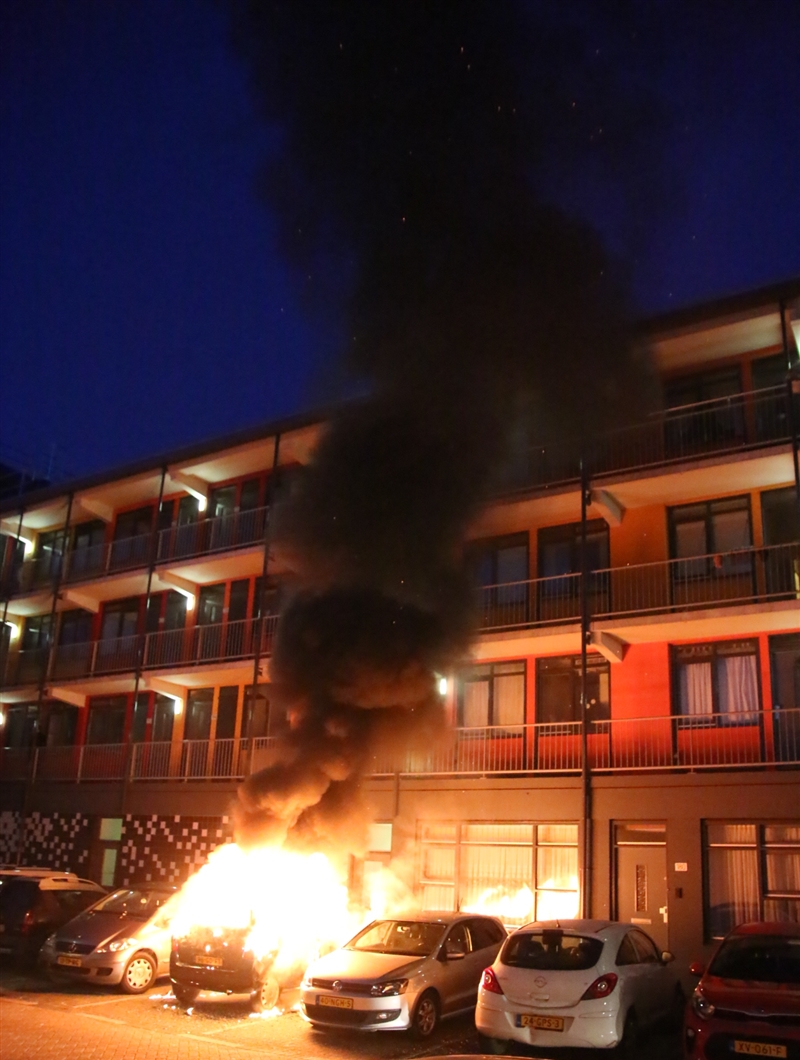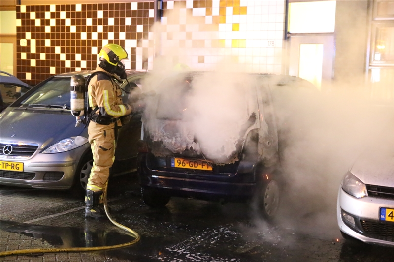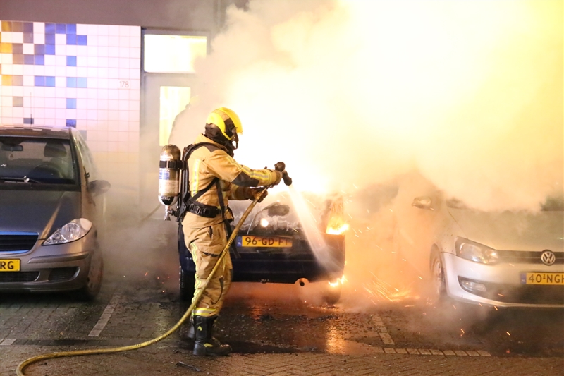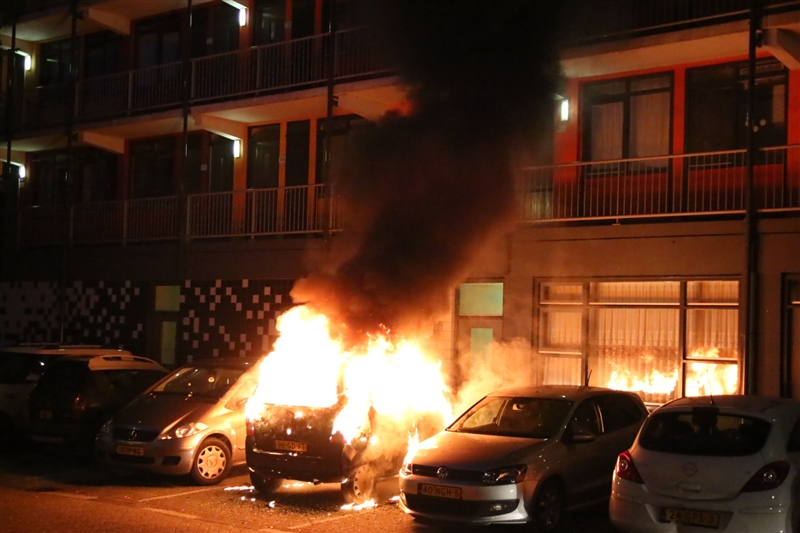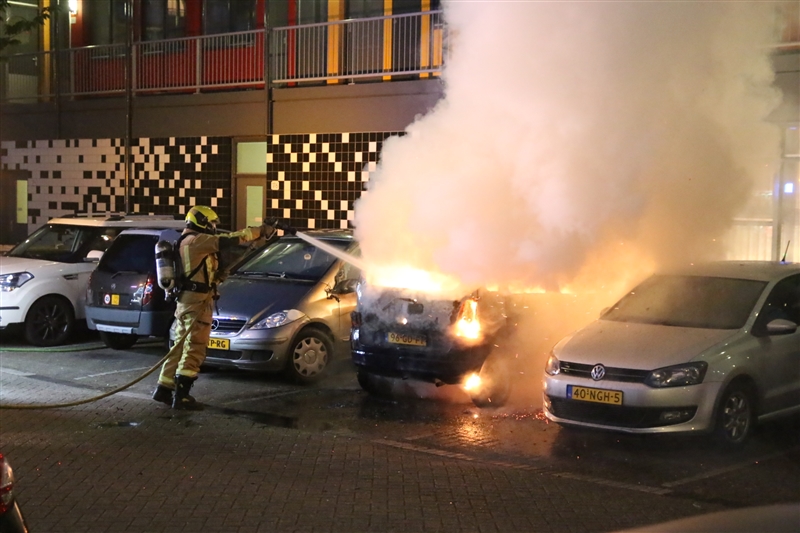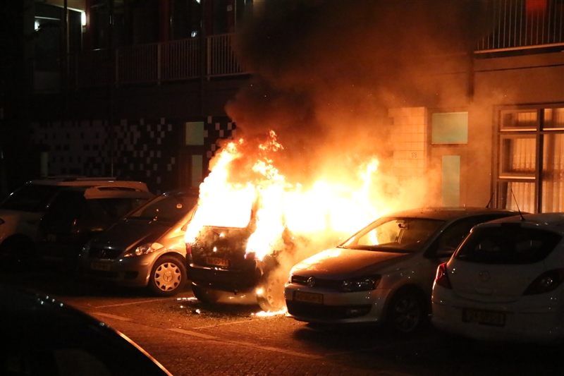 Bij aankomst van de hulpdiensten stond de auto al volledig in brand. Twee geparkeerde auto’s naast de brandende auto liepen brandschade op aan de zijkant.