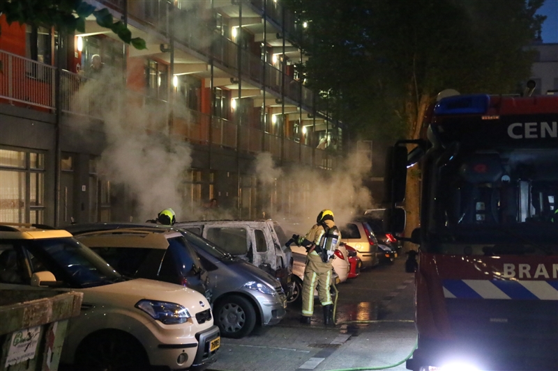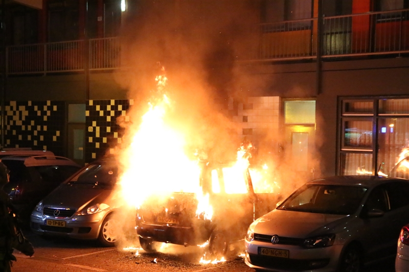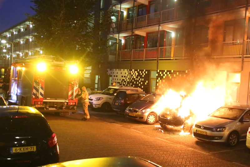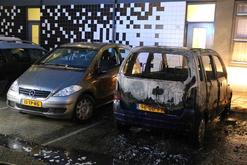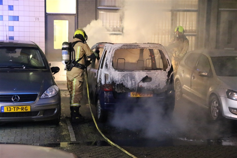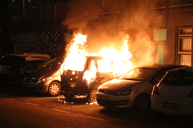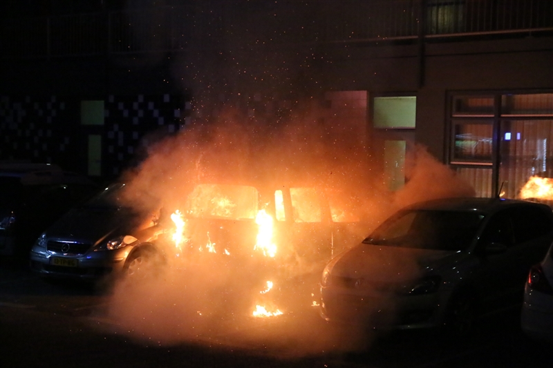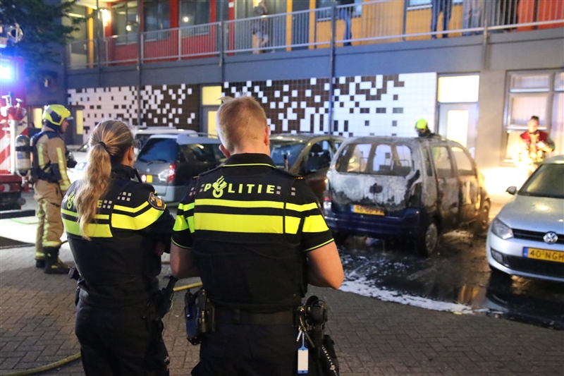 Bij aankomst van de hulpdiensten stond de auto al volledig in brand. Twee geparkeerde auto’s naast de brandende auto liepen brandschade op aan de zijkant.
