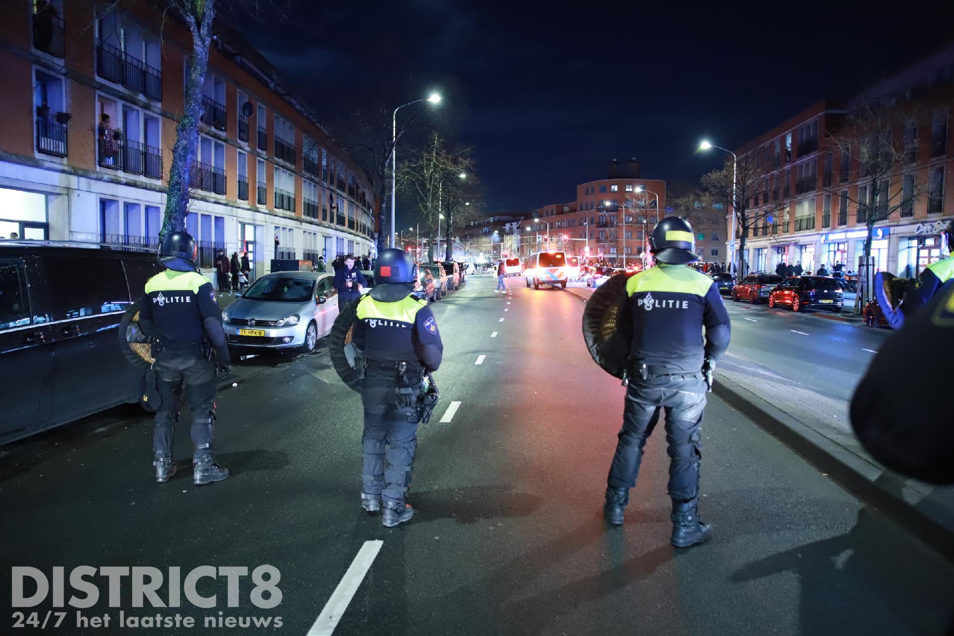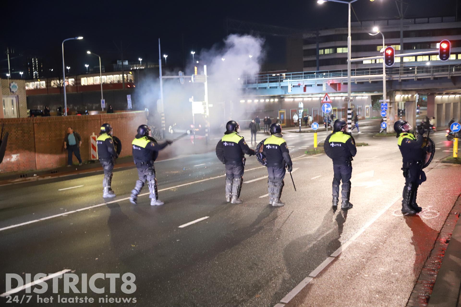 De politie heeft op de Hoefkade in linie gestaan. Er wordt flink getoeterd en (zwaar) vuurwerk afgestoken.