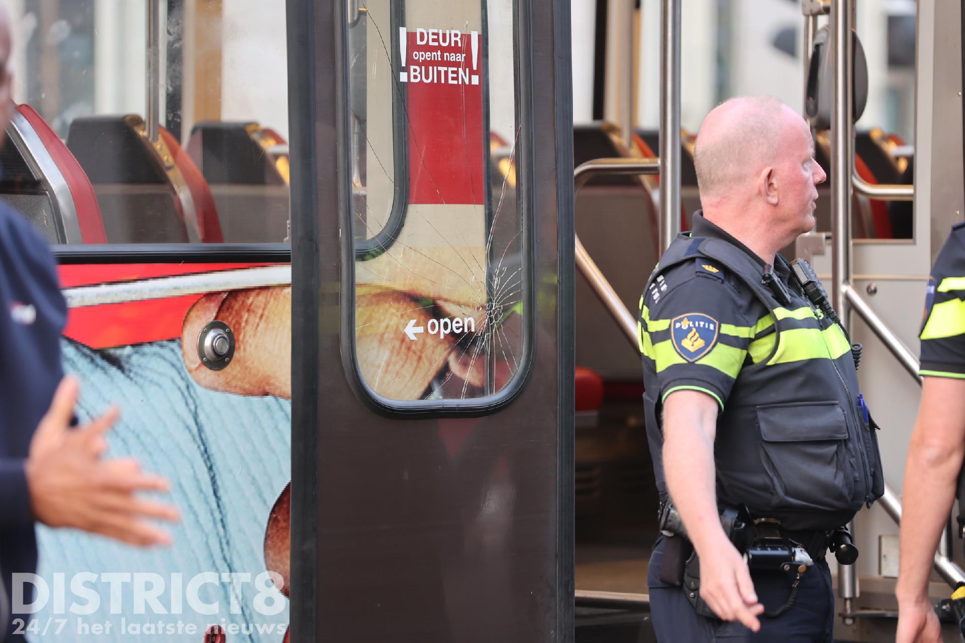Één van de onruststokers heeft ook meerdere malen tegen de tramdeuren aangetrapt waarbij het raam van de deur werd gesneuveld.