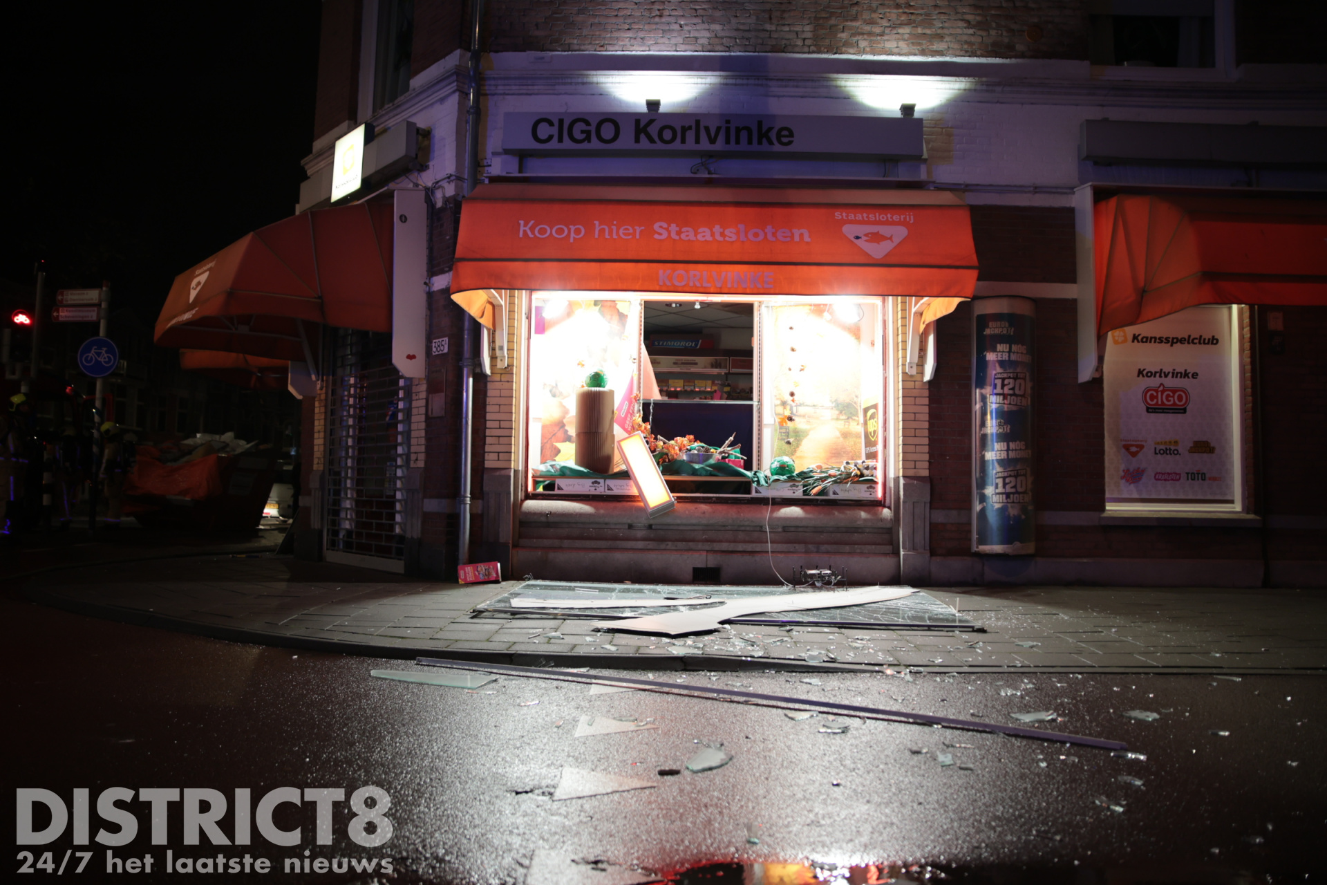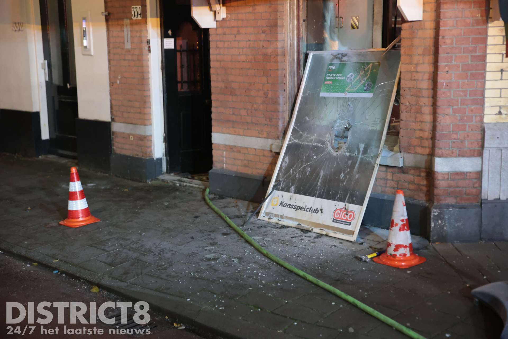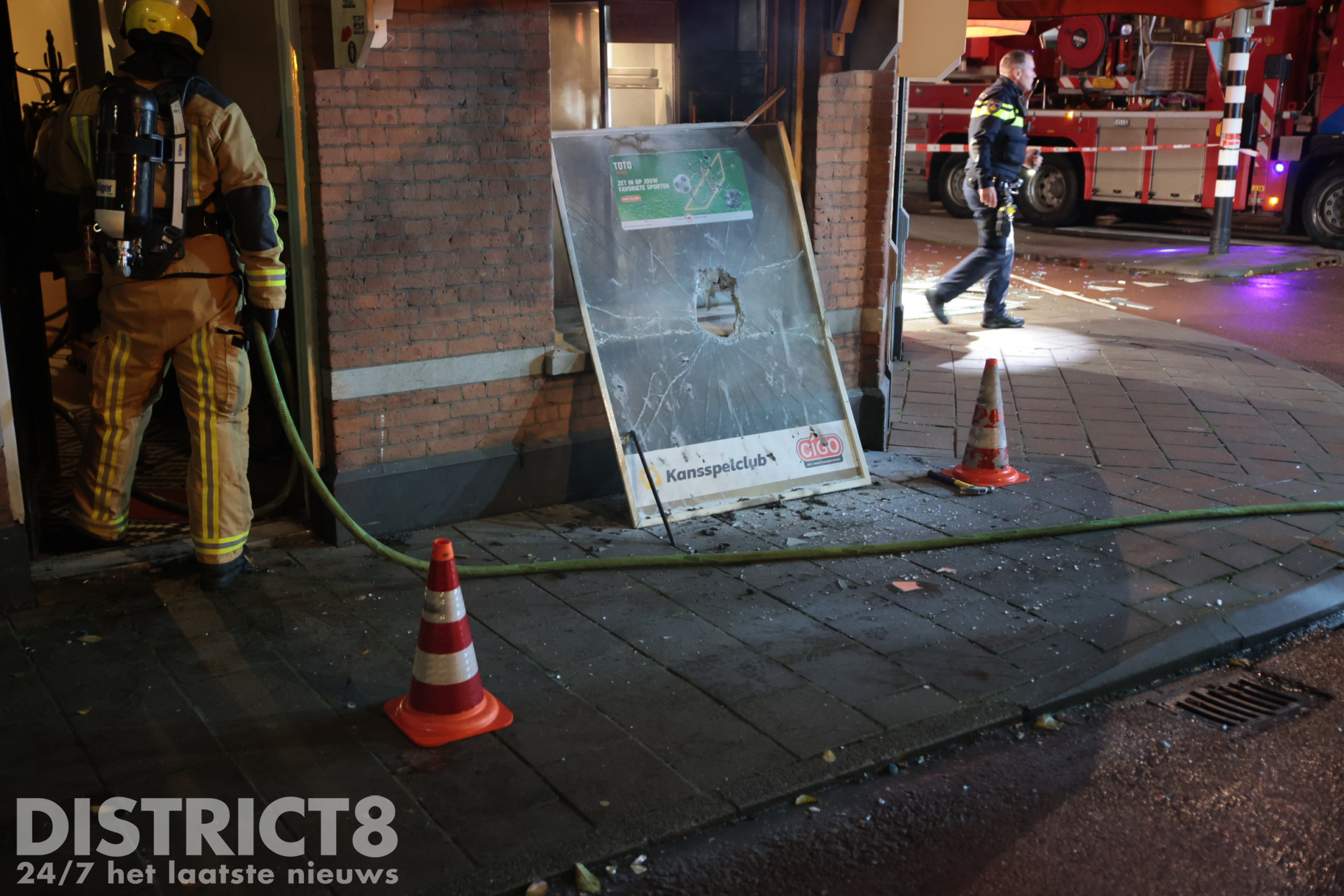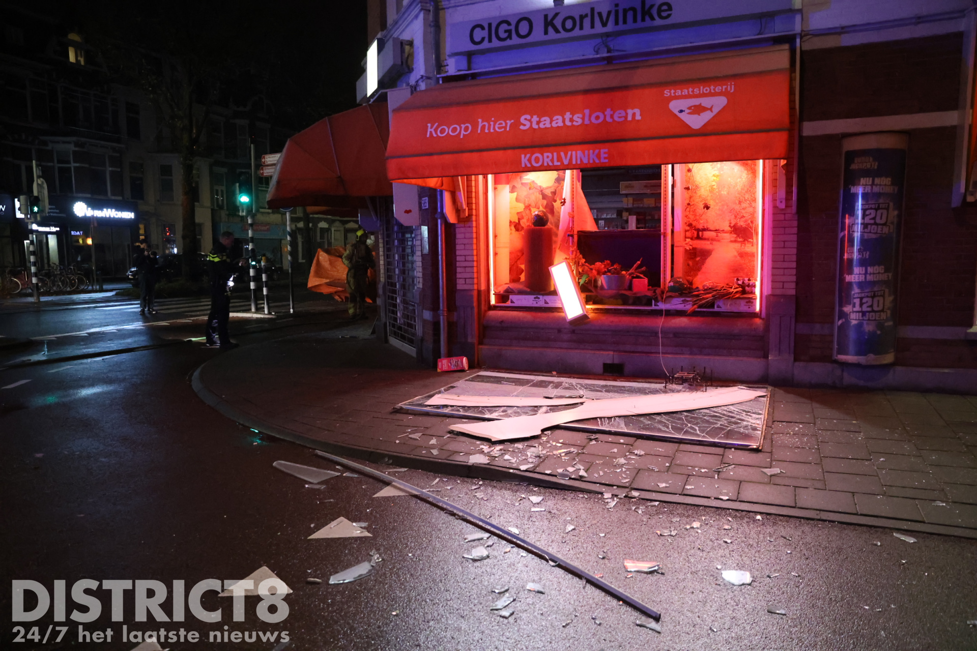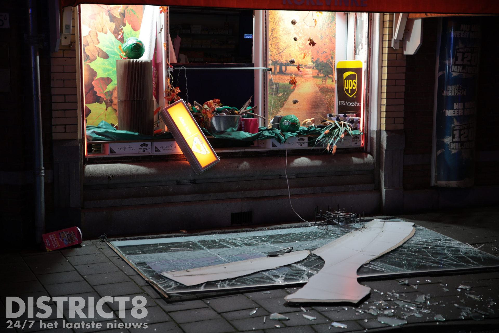 Op straat ligt een hamer, bij een winkelruit er tegenover is een groot gat zichtbaar, de hamer is hier mogelijk bij gebruikt. Politieagenten hebben met politielint een plaatsdelict gemaakt.