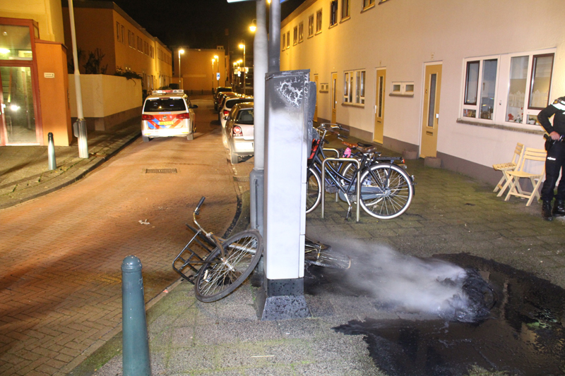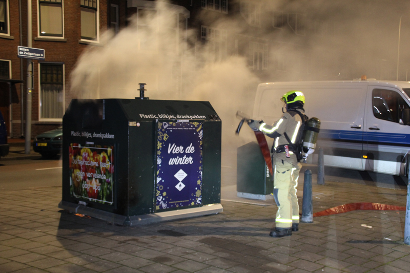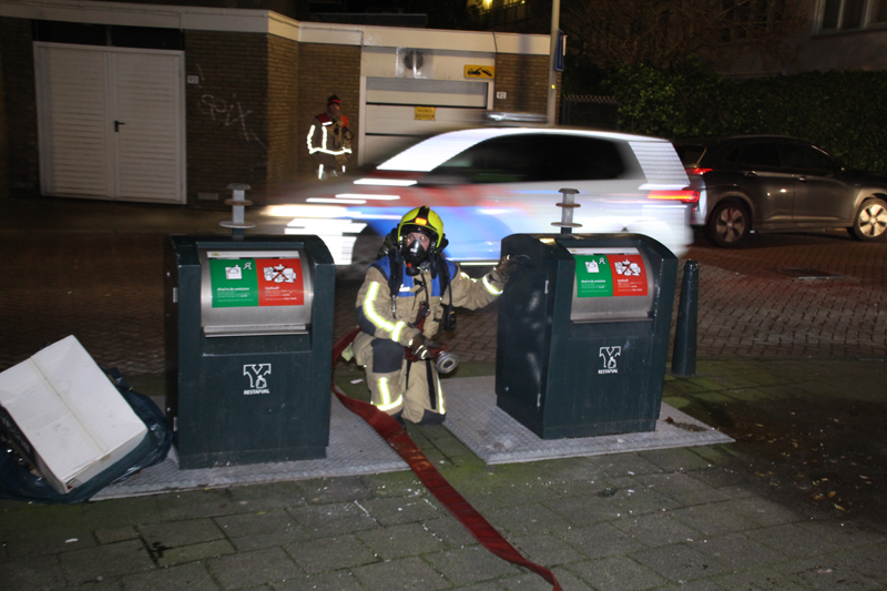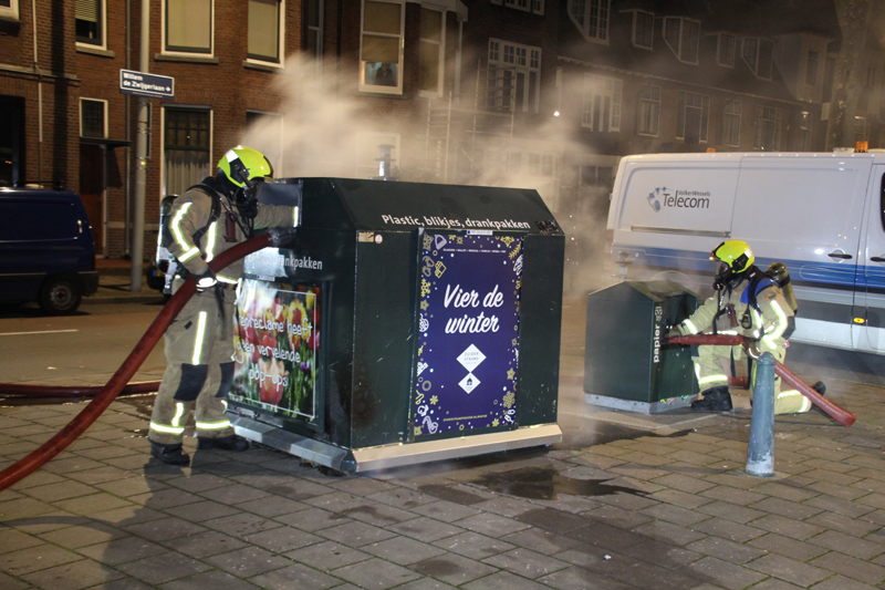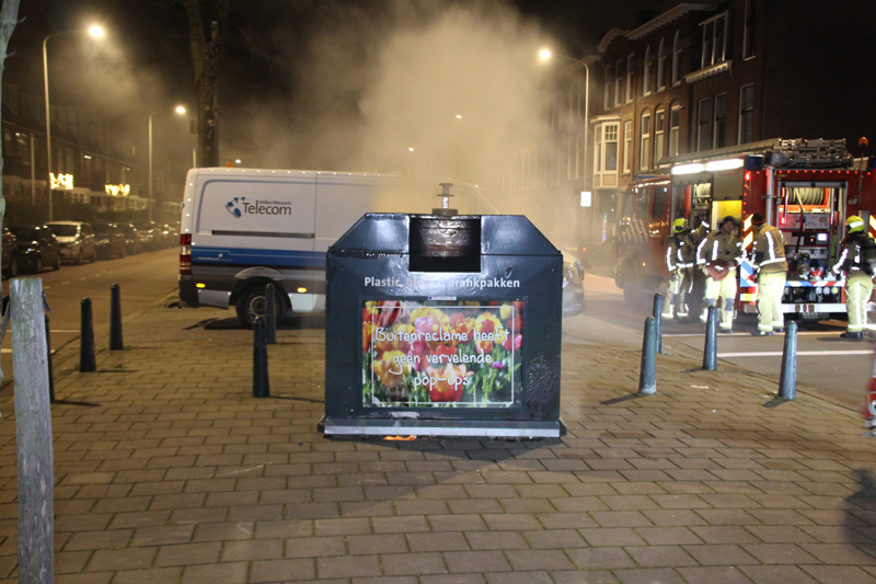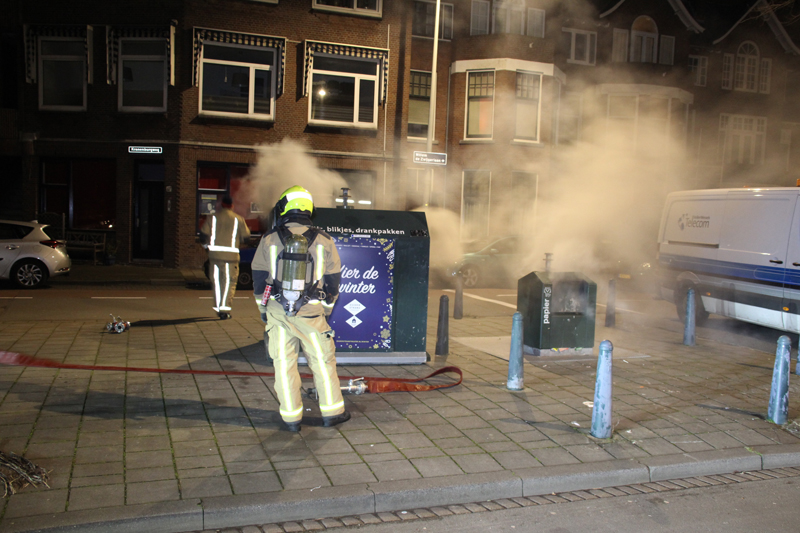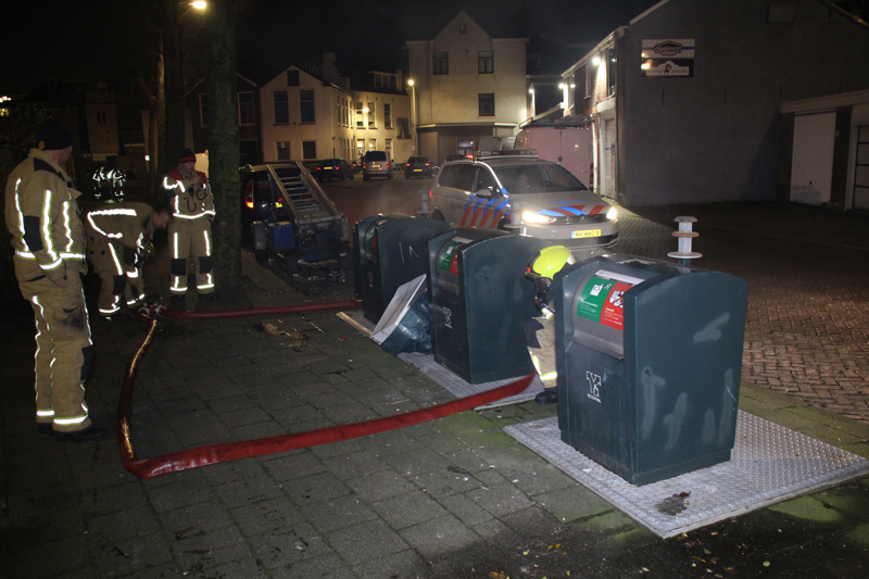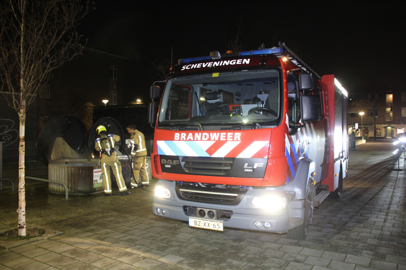 Aan de Stuurmanstraat werd de inhoud van drie ondergrondse containers in brand gestoken. De Scheveningse brandweer heeft alle drie de containers vol laten lopen met water.