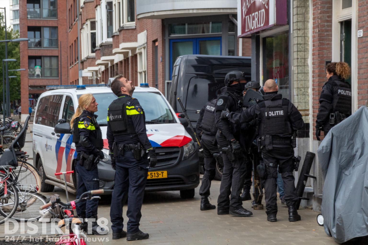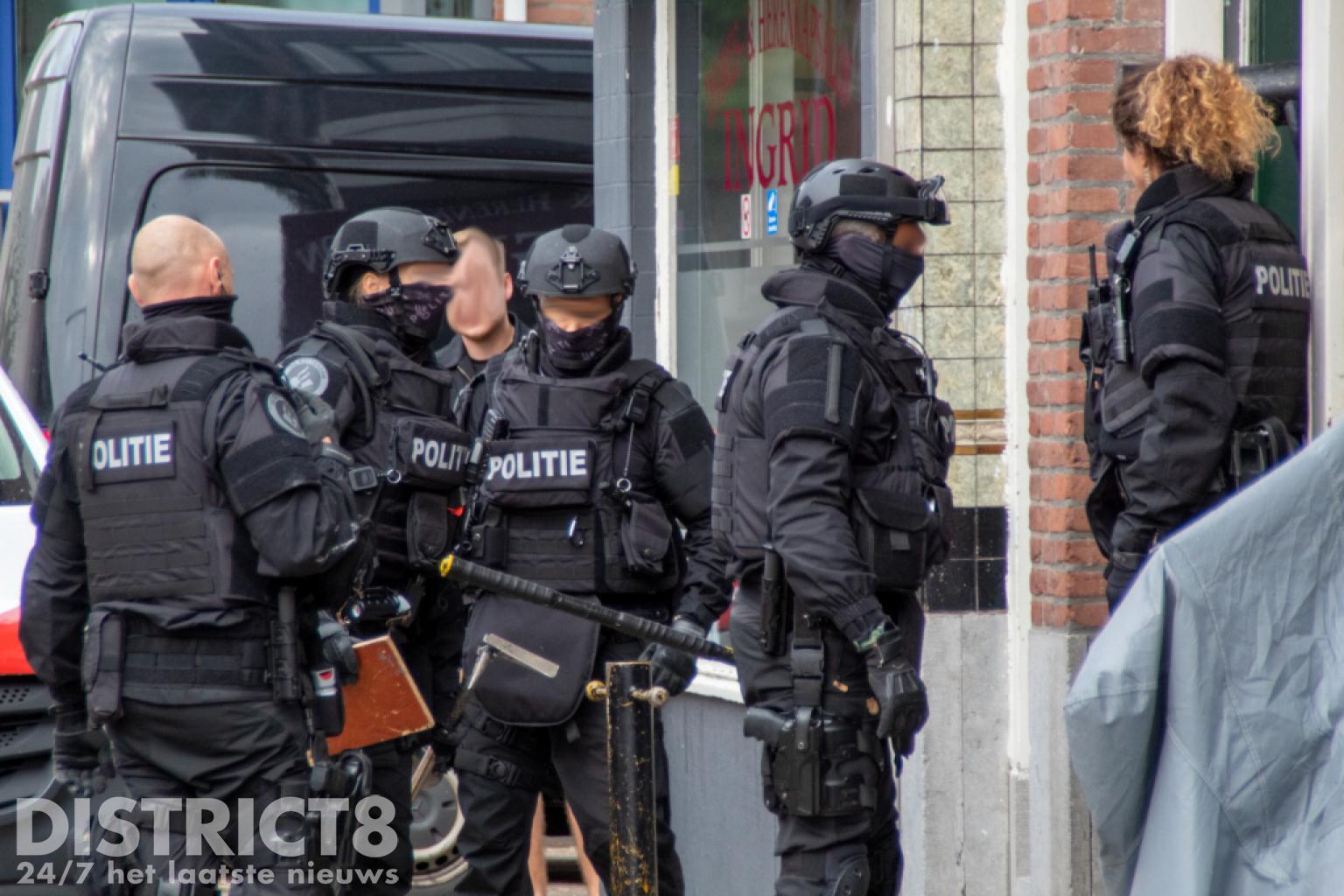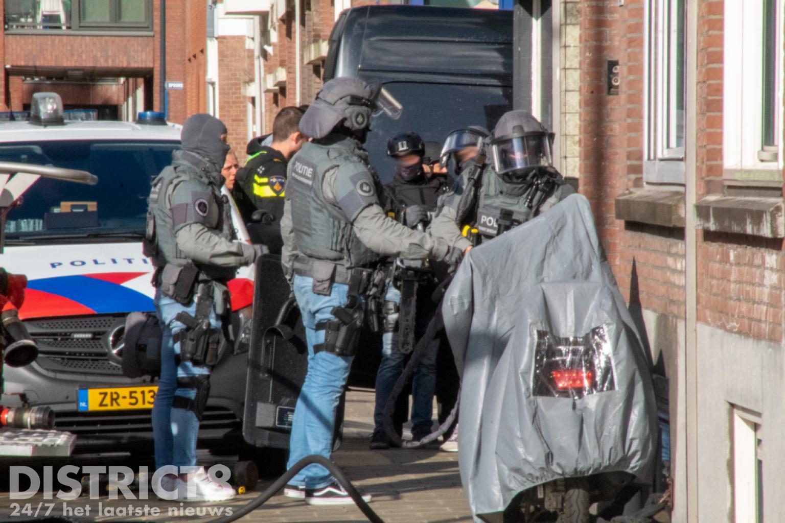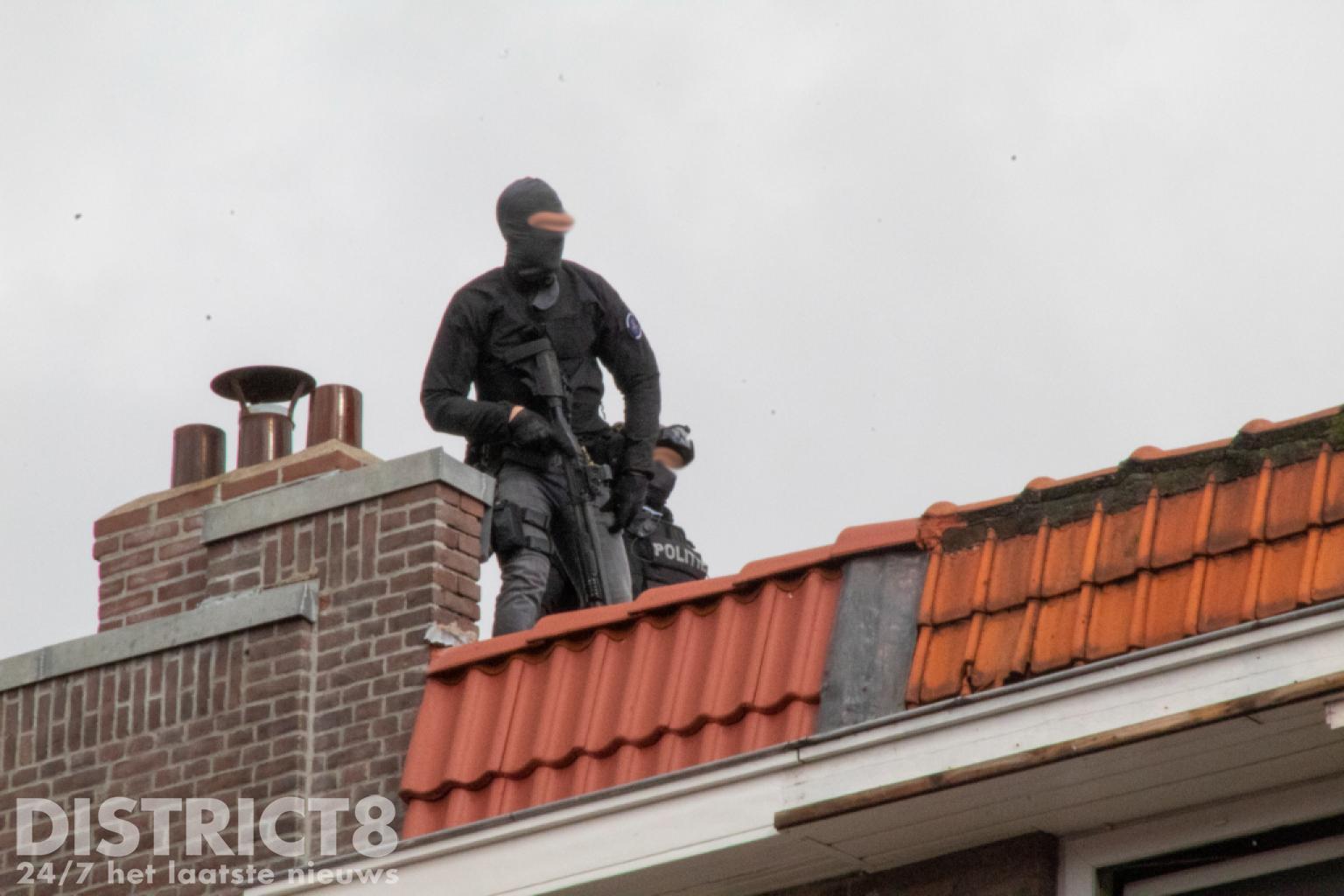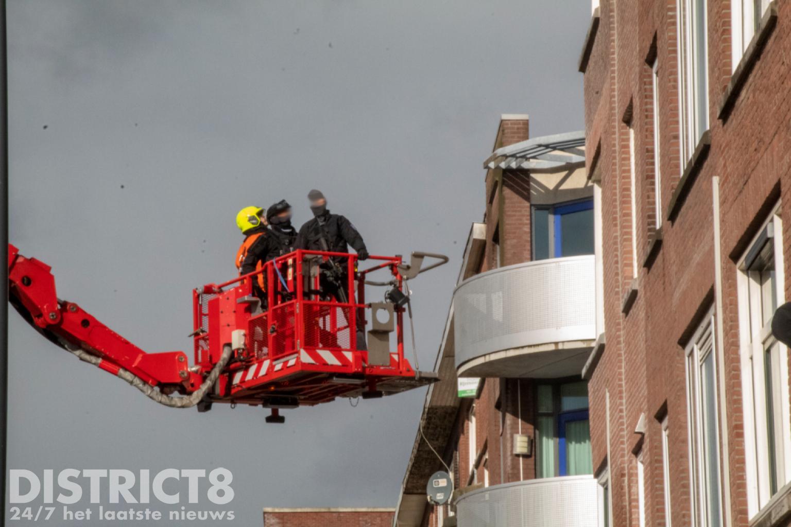 Met een hoogwerker van de brandweer werden twee leden van de DSI op het dak afgezet waarna andere het portiek ingingen richting de woning. De man is later aangehouden.