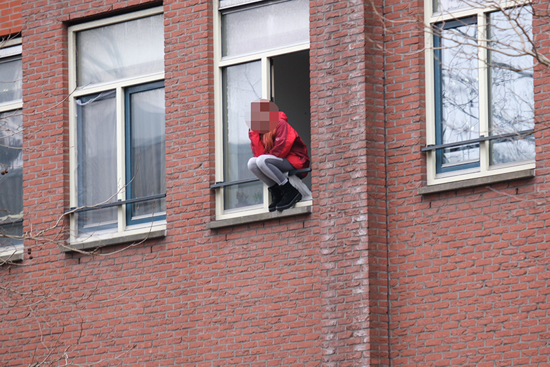 Den Haag – Een verwarde vrouw zorgt momenteel voor een flinke consternatie op de Calandstraat in Den Haag. De vrouw zit in het raamkozijn op de eerste etage.
